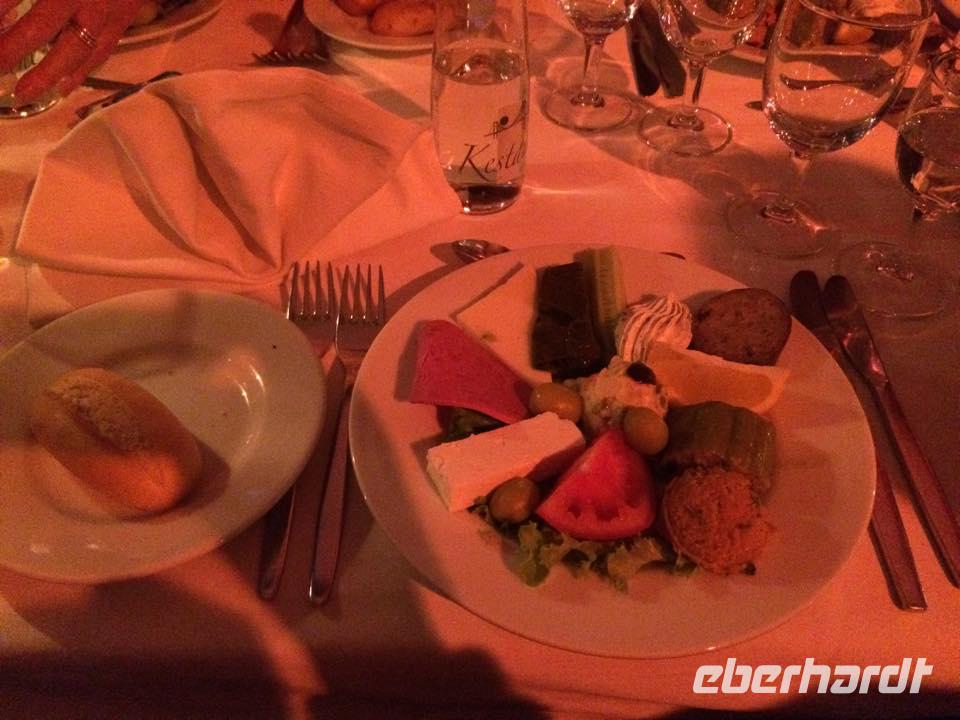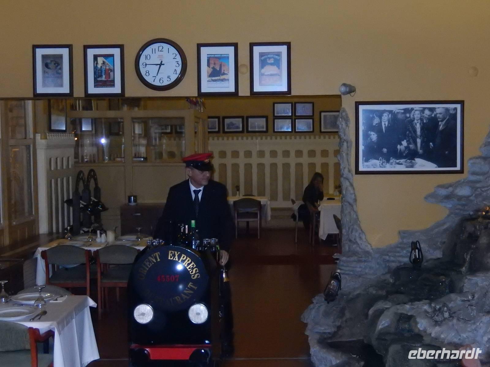 Gut versorgt mit Souveniren begeben wir uns Abends zu einem weiteren Highlight der Reise: heute speisen wir im Restaurant Orient Express. In dem ehemaligen Bahnhof Sirkeci kam von 1888 bis 1977 der Orient Express aus Paris an. Im Restaurant gibt uns Serdar weitere Details. Am Tisch werden wir zunächst witzigerweise von einem Zugschaffner mit Getränken bedient. Dann folgt ein türkisches Abendessen. Den Abend lassen einige von uns wieder in der Bar ausklingen.