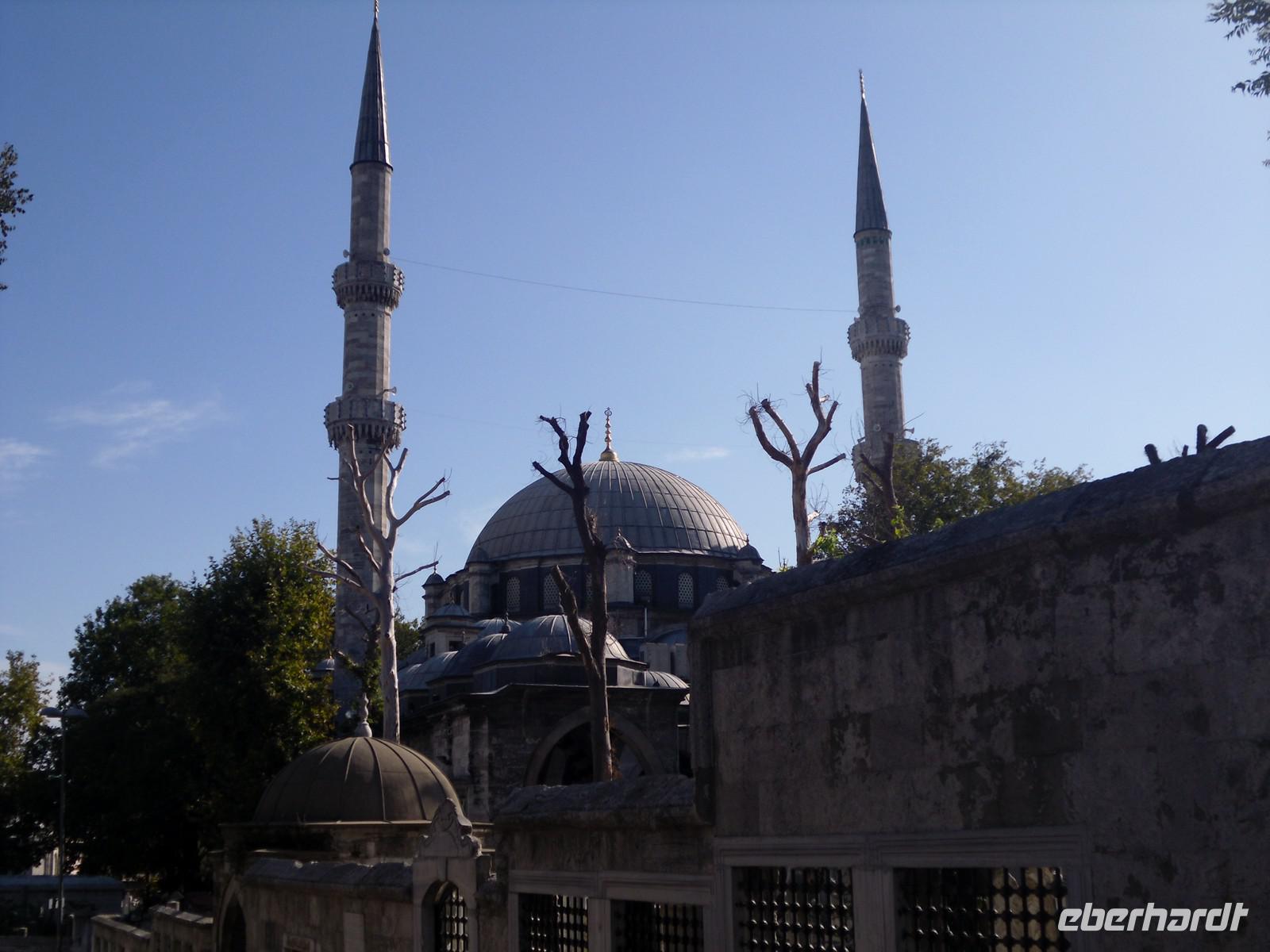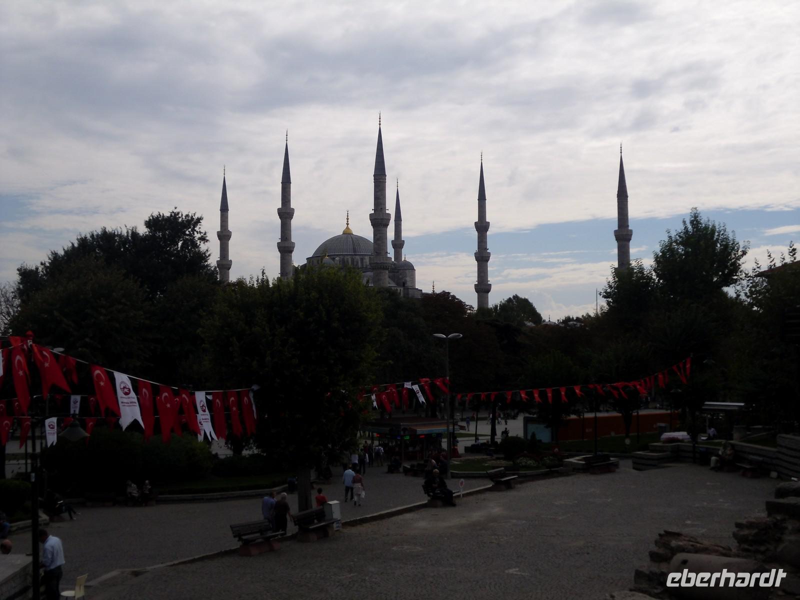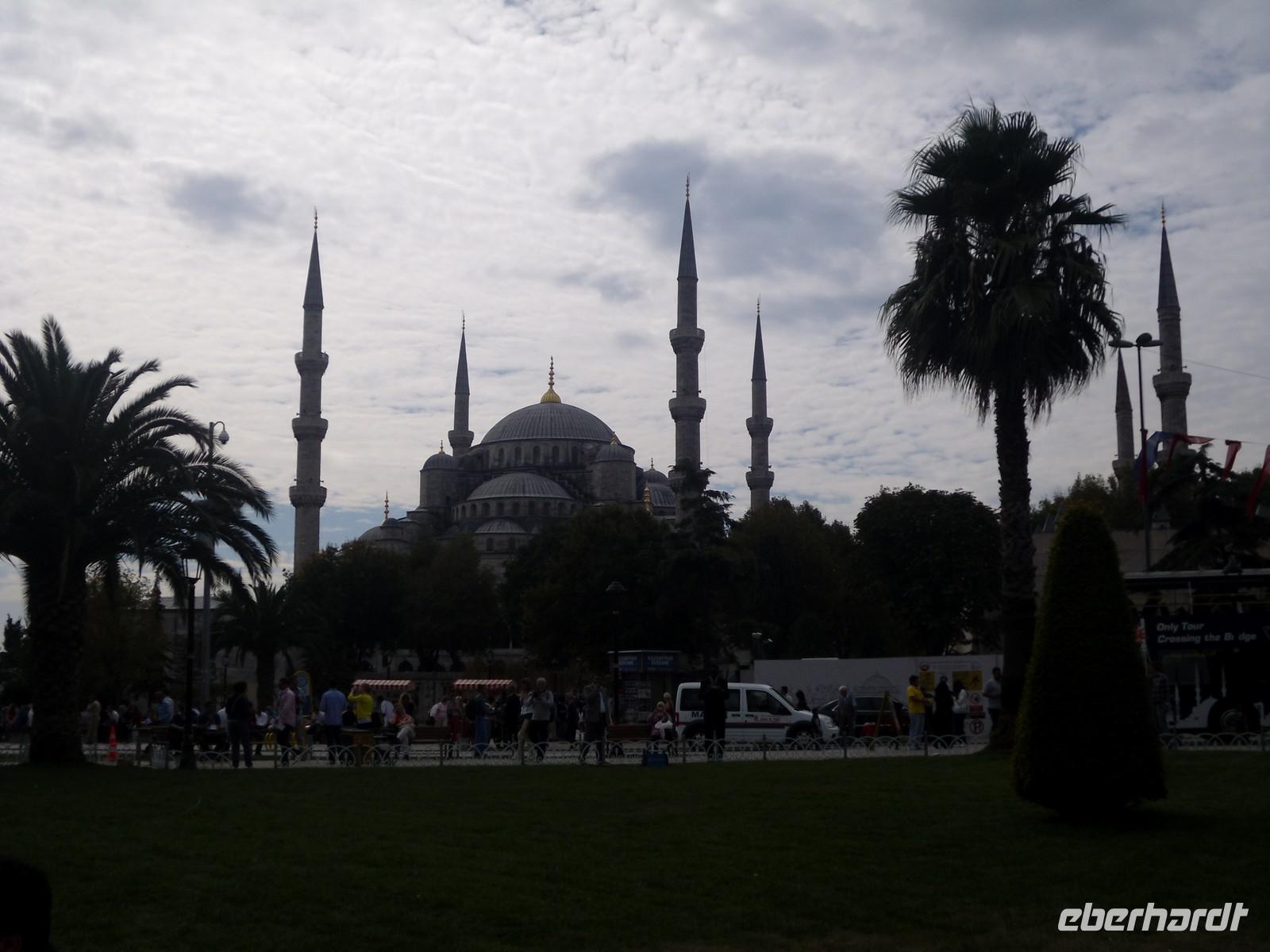 Noch vor Mittagspause besuchten wir die Moschee, mit den 6 Minaretten. Richtig die Sultan-Ahmet Moschee, aber auch oft Blaue Moschee genannt. Die Moschee trägt ihren Namen nicht wegen Ihrer äußeren Fassade. Sie bekam den Namen durch ihr Inneres. Durch die blauen Wände im Gebetsraum, bekam sie ihren Spitznamen Blaue Moschee, welcher unter den Touristen der häufiger verwendete Begriff ist.