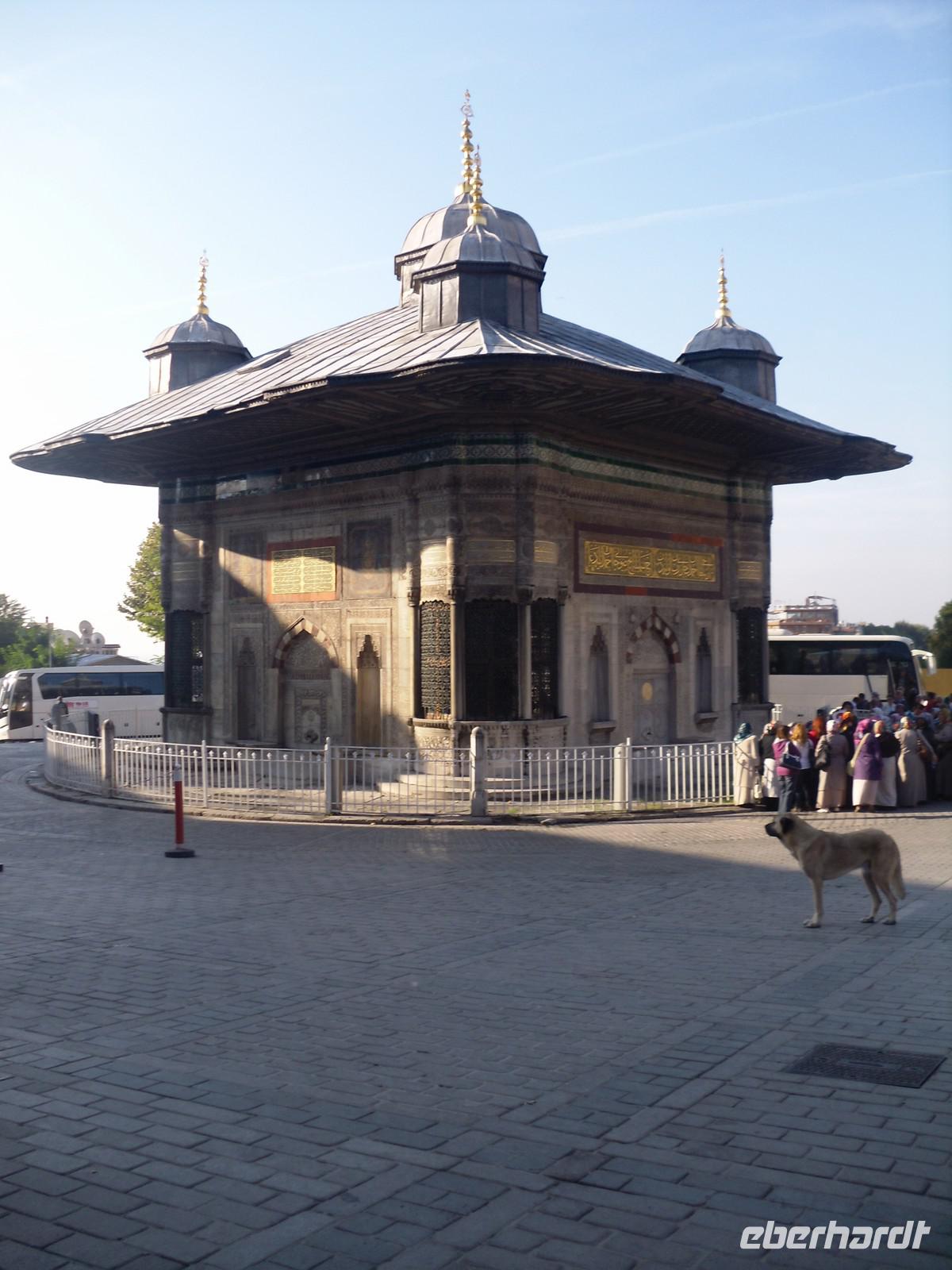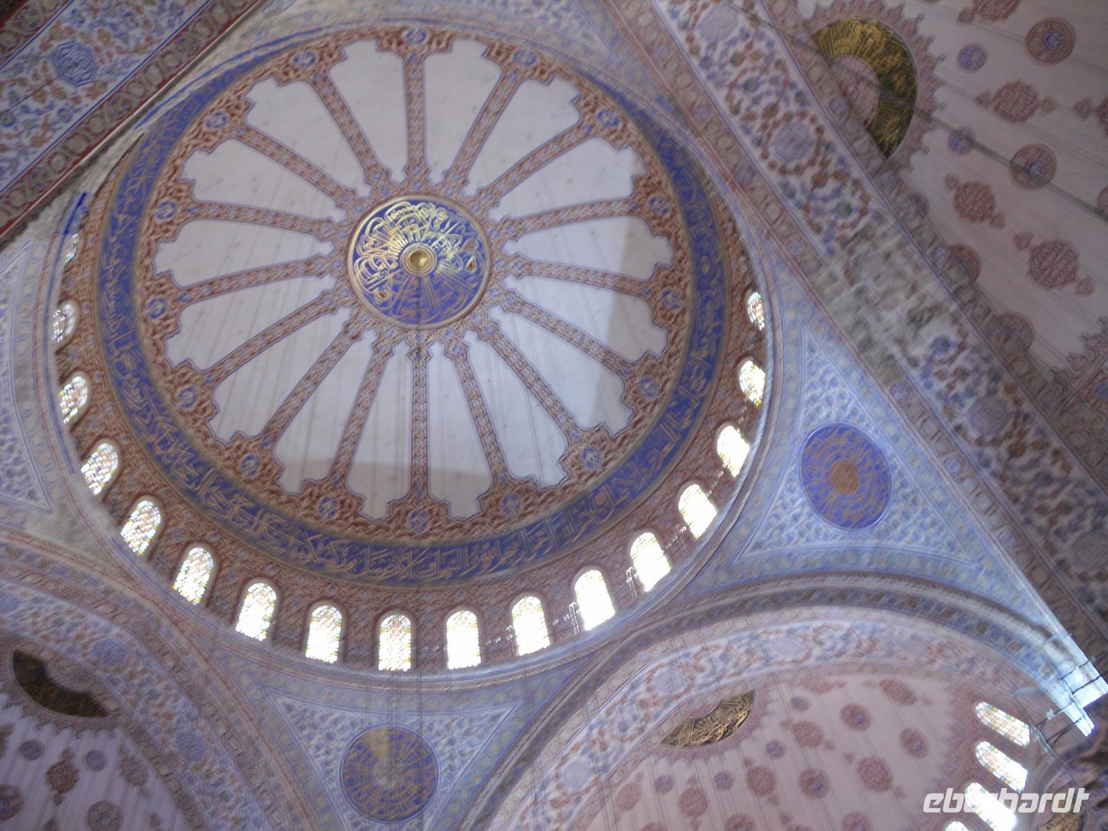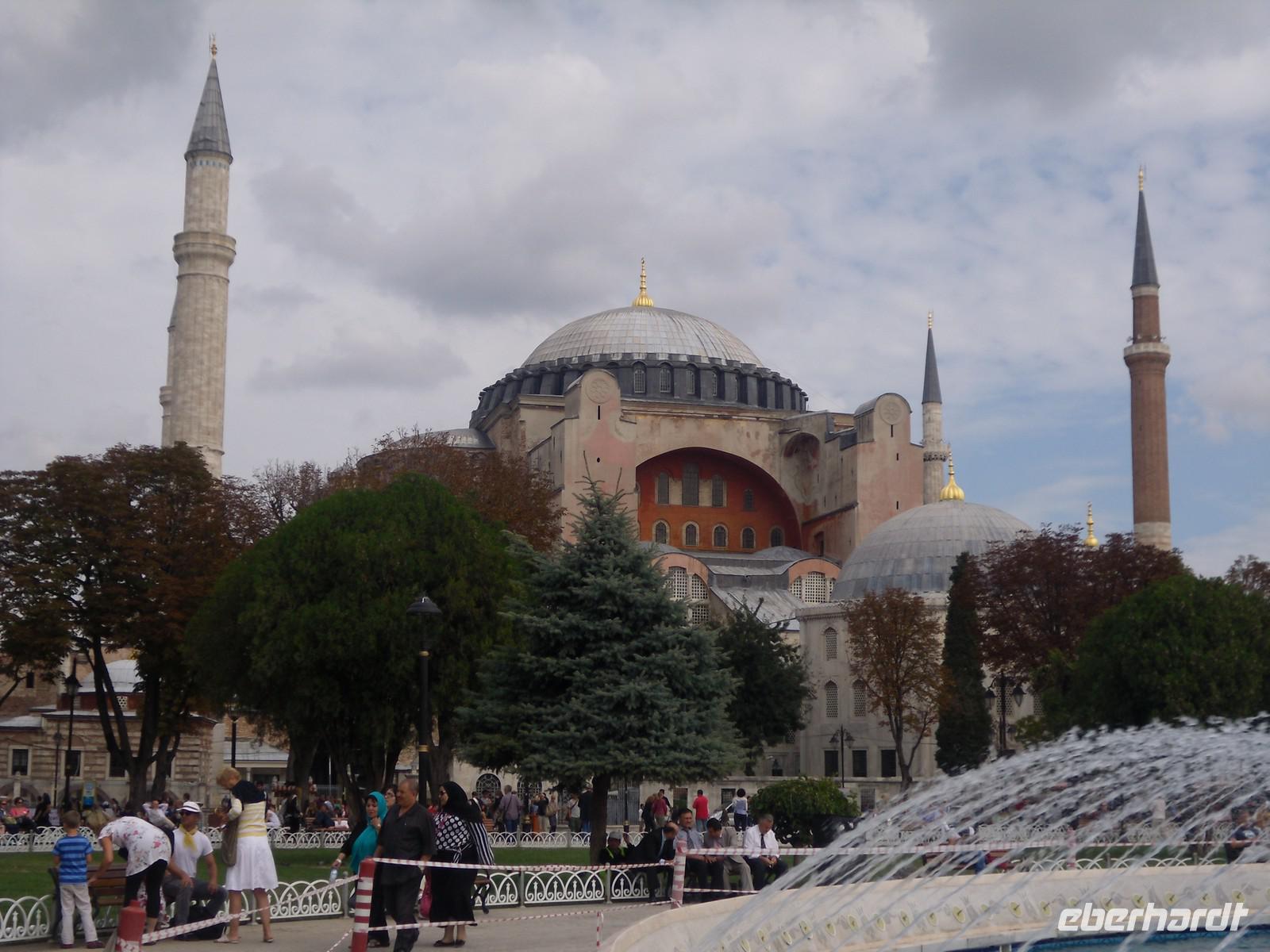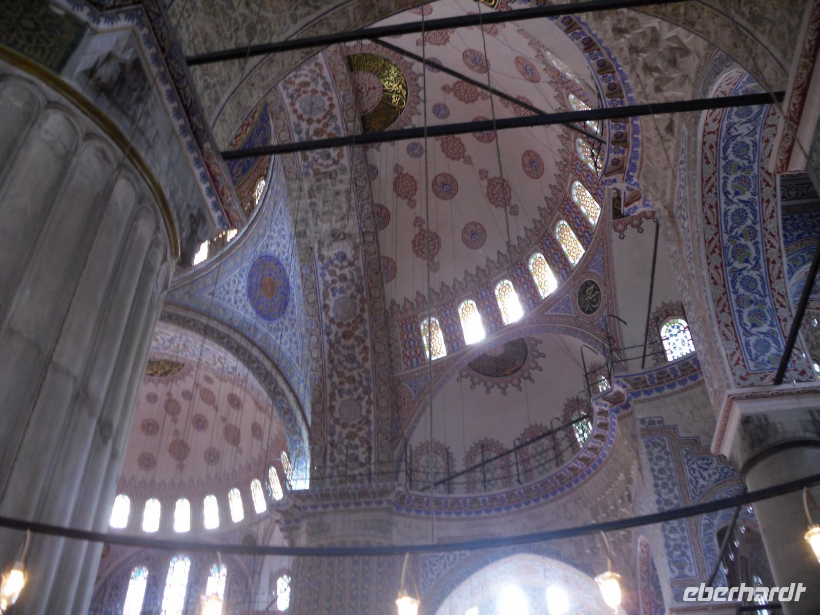 Noch vor Mittagspause besuchten wir die Moschee, mit den 6 Minaretten. Richtig die Sultan-Ahmet Moschee, aber auch oft Blaue Moschee genannt. Die Moschee trägt ihren Namen nicht wegen Ihrer äußeren Fassade. Sie bekam den Namen durch ihr Inneres. Durch die blauen Wände im Gebetsraum, bekam sie ihren Spitznamen Blaue Moschee, welcher unter den Touristen der häufiger verwendete Begriff ist.