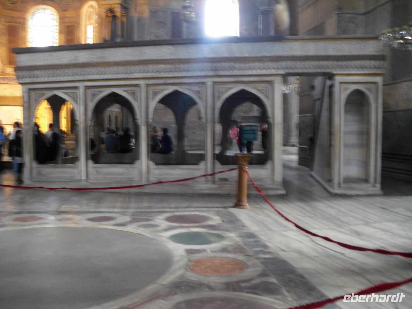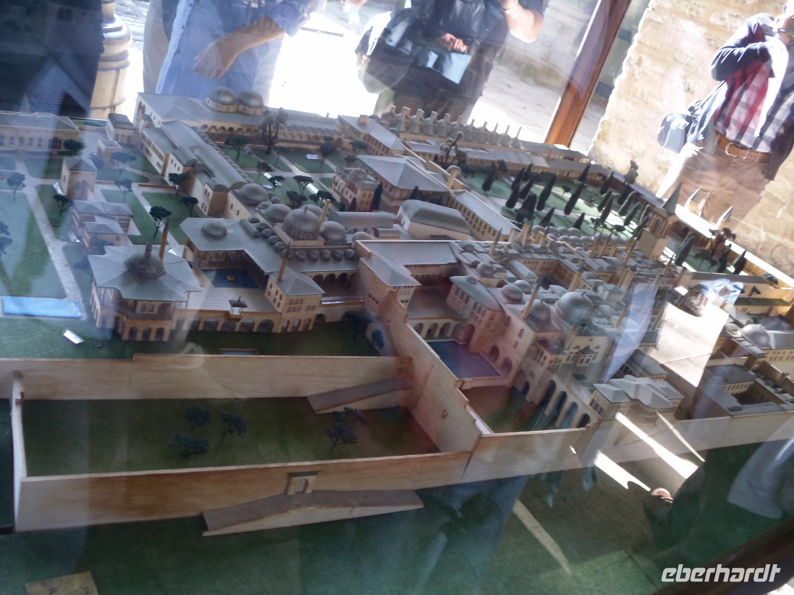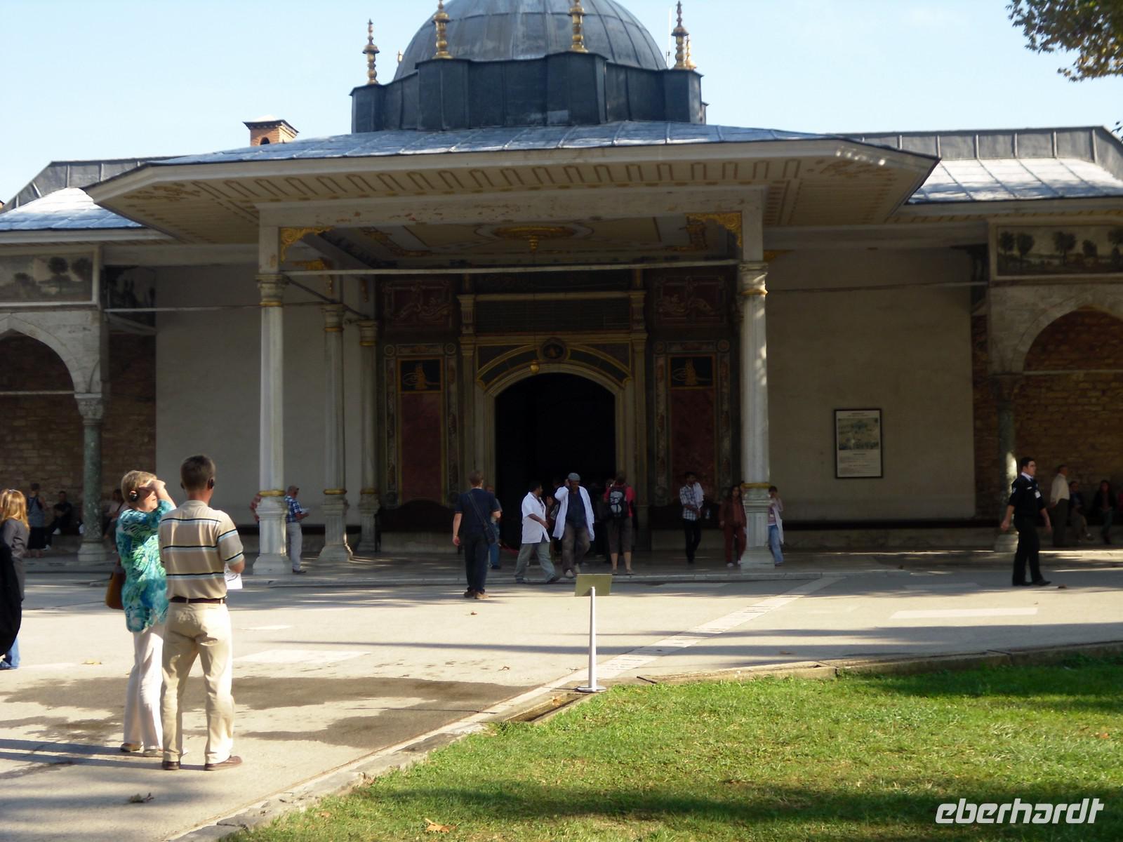 Auf in einen neuen Tag mit vielen Informationen und Entdeckungen. Orhan unser Reiseleiter führte uns als erstes zum Wohn- und Regierungspalast der Sultane. Der Topkapi-Palast war aber auch Verwaltungszentrum während der Zeit des Osmanischen Reiches. Die vier Höfe in die der Palast geteilt ist, haben zur damaligen Zeit allen unterschiedlichen Zwecken gedient. Der erste Hof war überwiegend für die Wächter angedacht. Der zweite beherbergte bereits Staats- und Verwaltungsräume und war somit das politische Zentrum. Doch auch die Palastküche war hier untergebracht. Um in den dritten Hof zu kommen, muss man vorher noch das „Tor der Glückseligkeit" passieren. Der dahinterliegende Teil, durfte auch nur mit einer ausdrücklichen Erlaubnis betreten werden und diente durch den Thronsaal als Empfangsteil für die höchsten Staatsbesuche. Im vierten Hof befinden sich damals wie heute Parkanlagen und Terrassen, mit einmaligen und atemberaubenden Blicken über das Goldene Horn, den Bosporus und das Marmarameer. Schon seit vielen Jahren dient der Palast als Museum für Porzellan, Gewändern, Juwelen und Waffen aus der damaligen Zeit.