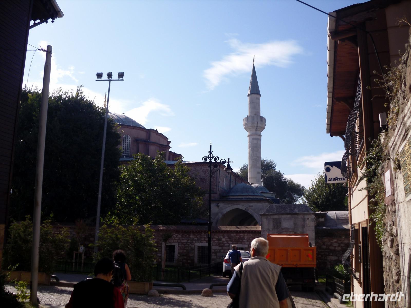 Da der gestrige Abend ein bisschen länger war, machten wir heute nicht ganz so zeitig los. Auf unserem Programm für den heutigen Tag stand auch nicht allzu viel, sodass wir uns diese Zeit auch nehmen konnten. Unser erstes Ziel war die Sokullu-Moschee, nicht die die derzeit restauriert wird, sondern eine weitere. Kaum zu glauben, dass es den Namen nicht nur einmal gibt. Orhan recherchierte ein wenig und fand heraus, dass es auf der Welt vier Moscheen mit dem Namen Sokullu Mehmed Pasha Moschee gibt. Eine von denen allerdings nicht in Istanbul, sondern in Belgrad und da wollten wir heute nicht hin. Unser vorletzter Tag in Istanbul trumpfte mit Moscheen noch einmal auf. Nachdem wir die eine gesehen hatten, machten wir uns auf dem Weg zu der Vorstufe von der Hagia Sophia. Die kleine Hagia Sophia war wie die Große früher eine Kirche und wurde dann erst später zur Moschee errichtet. Noch genau vor Augen wie der Bau der Hagia Sophia am Hippodrom war, fanden wir schon gewisse Ähnlichkeiten bei der Kleinen. Vor allem, dass hier weniger Trubel war, gefiel uns allen. Die Ruhe...herrlich. Nun hatten wir nur noch zwei Moscheen auf dem Plan stehen, bevor wir Istanbul wieder verlassen würden. Doch auch, wenn wir viele gesehen haben, kann ich eins sagen, jede Moschee ist auf ihre Art und Weise etwas Besonderes. Alle haben eine unterschiedliche Innengestaltung, was dazu beiträgt, dass keine der anderen gleicht. Bei der Murad Pasha Moschee machten wir nur einen kleinen Stopp, ehe es in den Stadtteil Eyüp ging. Hier genossen wir erst einige typische Köstlichkeiten und stärkten uns, ehe wir in die Eyüp Moschee zu besuchen. Mehrmals wurde diese Moschee erbaut und wieder niedergerissen. Einigen waren die Minarette nicht hoch genug, andere bauten die Moschee nach einer Zerstörung durch ein Erbeben neu auf.