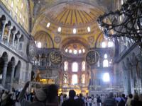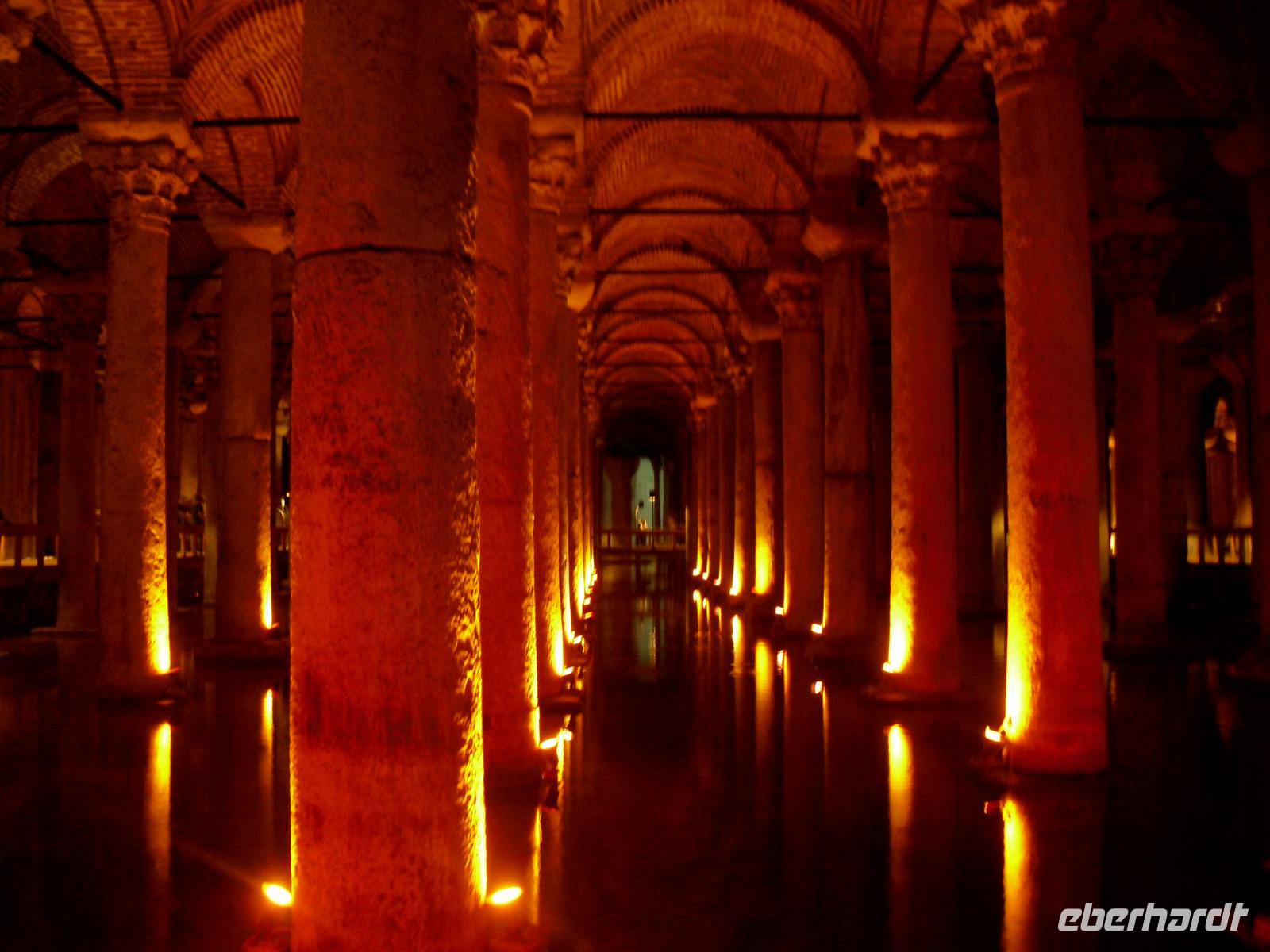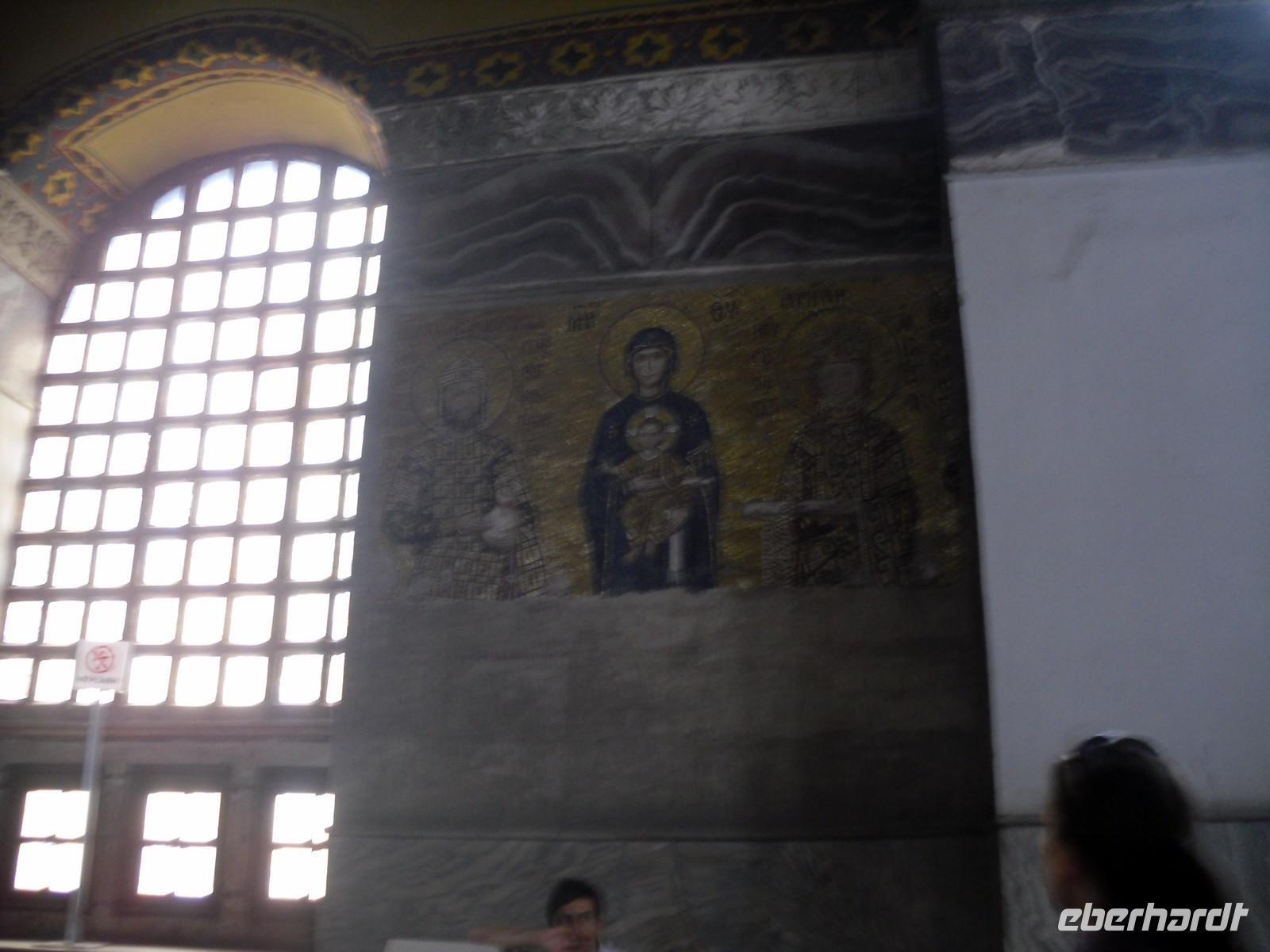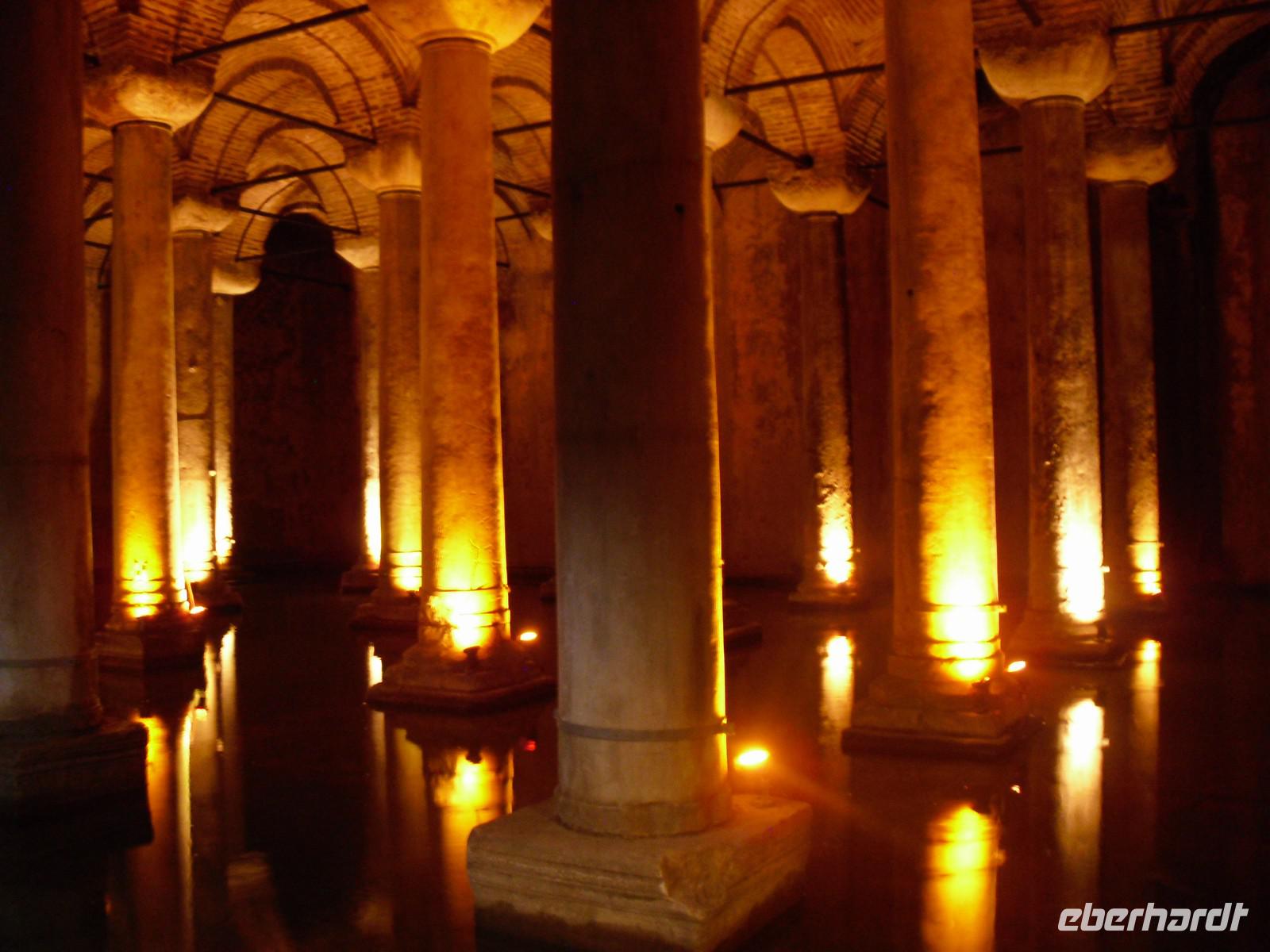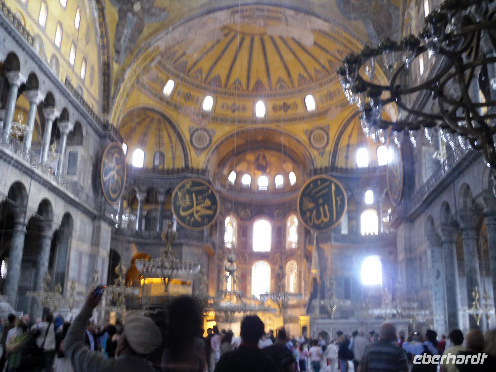 Doch unser Tag war noch nicht zu Ende. Zwei weitere Ziele hatten wir heute noch auf unserem Programm stehen. Nach einer Stärkung setzten wir unseren Weg durch die Altstadt fort und gingen wir in den Versunken Palast, welcher mehr als Yerebatan Zisternen bekannt ist. Angelegt und angedacht war diese beeindruckende Anlage als Wasserspeicher für den großen Palast und bekam aufgrund ihrer Lage unterhalb des Palastes den Namen, cisterna basilica. Vielen von uns waren die Zisternen durch die Medien ein Begriff, nicht unter James Bond, sondern auch andere Filme und Sendungen wurden hier Untertage schon gedreht. Als letztes Tagesziel war die östlich der Zisternen stehende Hagia Sophia. Mit ihrer Geschichte von Kirche über Moschee bis hin zum heutigen Museum ist die Hagia Sophia eines der Wahrzeichen Istanbul und das letzte große Bauwerk der Spätantike. Erst im inneren des Museums lernt man dieses Bauwerk zu schätzen, allein das Hauptschiff, welches von 31 Meter Durchmesser beherrscht wird, lässt nur erahnen welche Größen hier eine Rolle spielen. Noch heute findet man in der Hagia Sophia die Spuren der Geschichte die Vorhallen zeigen Mosaike von Maria und dem Christuskind, hingegen das Hauptschiff zeigt die Vergangenheit einer Moschee durch eine Gebetsnische und dem Podest für den Muezzin. Erschöpft von den neuen Eindrücken, der Lebhaftigkeit der Stadt und dem Fußmarsch kehrten wir in unser Hotel zurück. Am Abend machte ich mich mit Orhan und einigen Gästen auf den Weg zur Istiklal Caddesi, auch Unabhängigkeitsstraße. Hier suchten wir uns eine Gelegenheit um unser Abendessen zu uns zu nehmen, andere betrachteten wie die Einkaufsstraße am Tage zum Zentrum des Nachtslebens wurde.