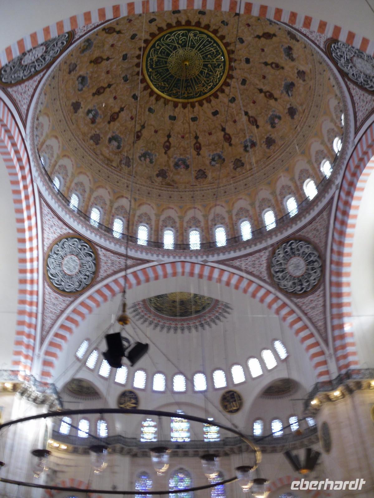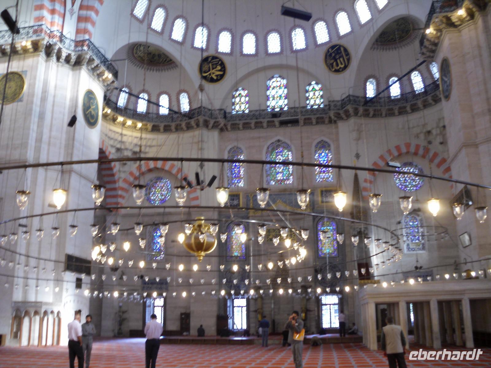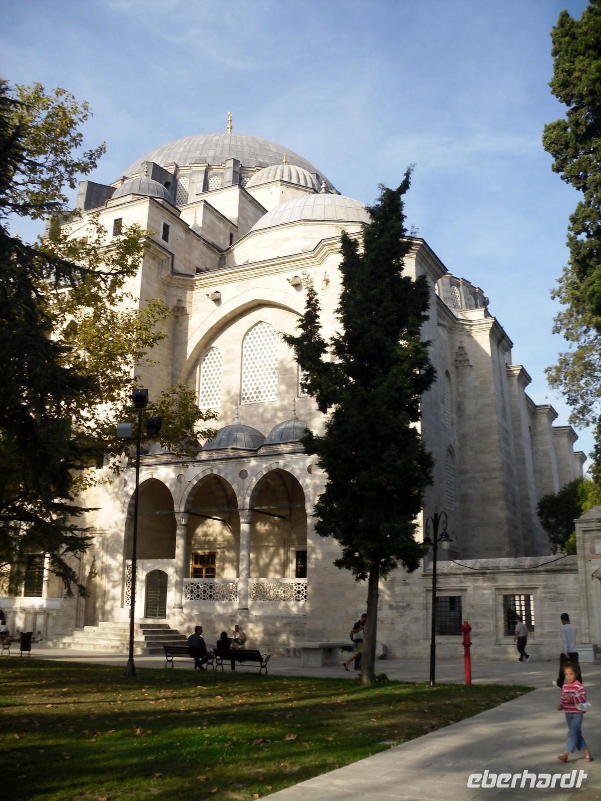 Schon etwas müde und erschöpft von den vielen Informationen, welche uns Orhan vermittelte setzten wir unseren Weg durch die Stadt fort. Wieder einmal wurde uns bewusst warum es besser sei auf den Bus zu verzichten und den eigenen Füßen zu vertrauen. Hier und da lässt sich der Verkehr in Istanbul nur erahnen. Doch wer genauer hinschaut, erkennt das Chaos, welches sich auf den Straßen der Stadt widerspiegelt. Einen Bruchteil der Skyline von Istanbul kannten wir schon von unseren ersten Fahrten in Richtung Altstadt. Von weiten sahen wir dieses dominierende Element der Istanbuler Skyline. 4 Minarette und viele kleinere Kuppeln sind das bekannte Markzeichen dieser noch von Touristen fast vernachlässigten Moschee. Die Rede ist von der Süleymaniye Moschee, welche in meinen Augen die Schönste von allen Istanbuls ist. Zudem gilt sie auch zu bedeutendsten Moscheen der Stadt. Den Auftrag zum Bau dieser einzigartigen Moschee gab Sultan Süleyman dem Prächtigen und gilt gleichzeitig als wichtigstes Werk des Architekten Sinan. Die Moschee auf dem dritten Hügel der Stadt bietet ihren Besuchern viel Ruhe, da dieses Bauwerk sehr selten von den Touristengruppen besucht wird. Wir genossen für einige Momente die Stille, ehe wir uns auf den Weg zu unserem Bus machten. Sichtlich erschöpft von dem Fußmarsch des Tages und mit beeindruckenden Bildern in unseren Köpfen, kehrten wir in unser Hotel zurück.