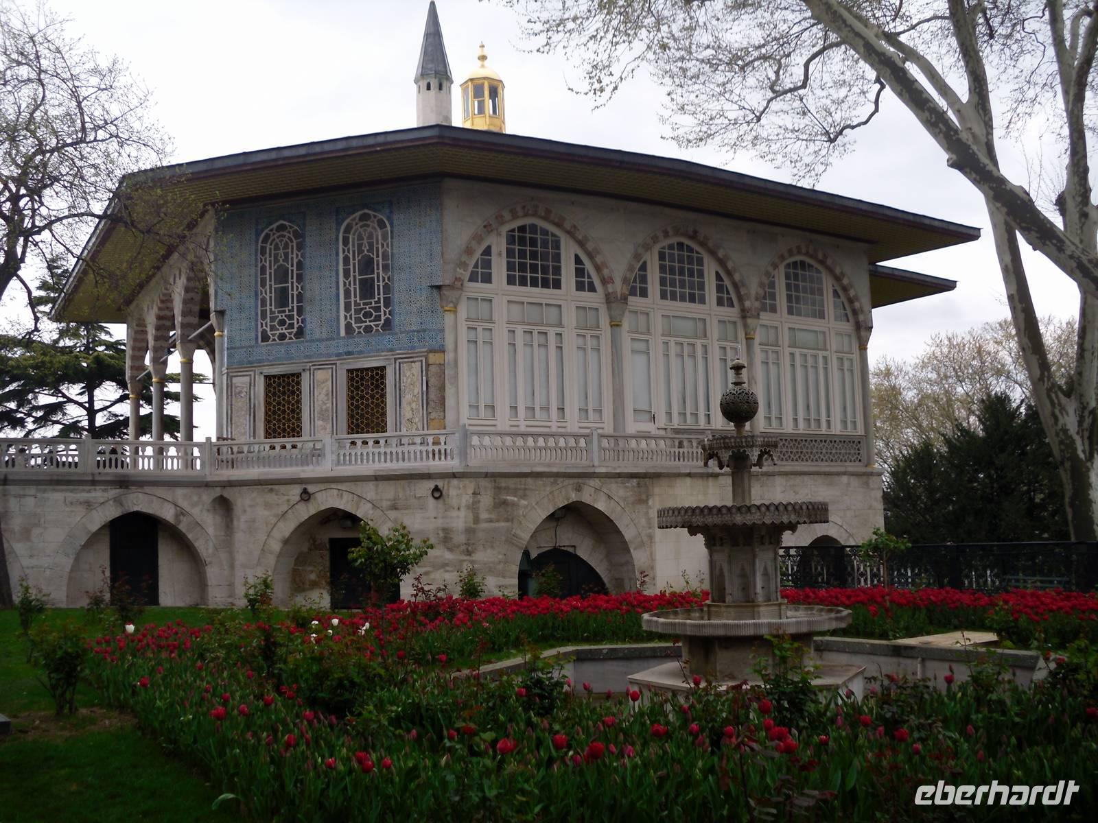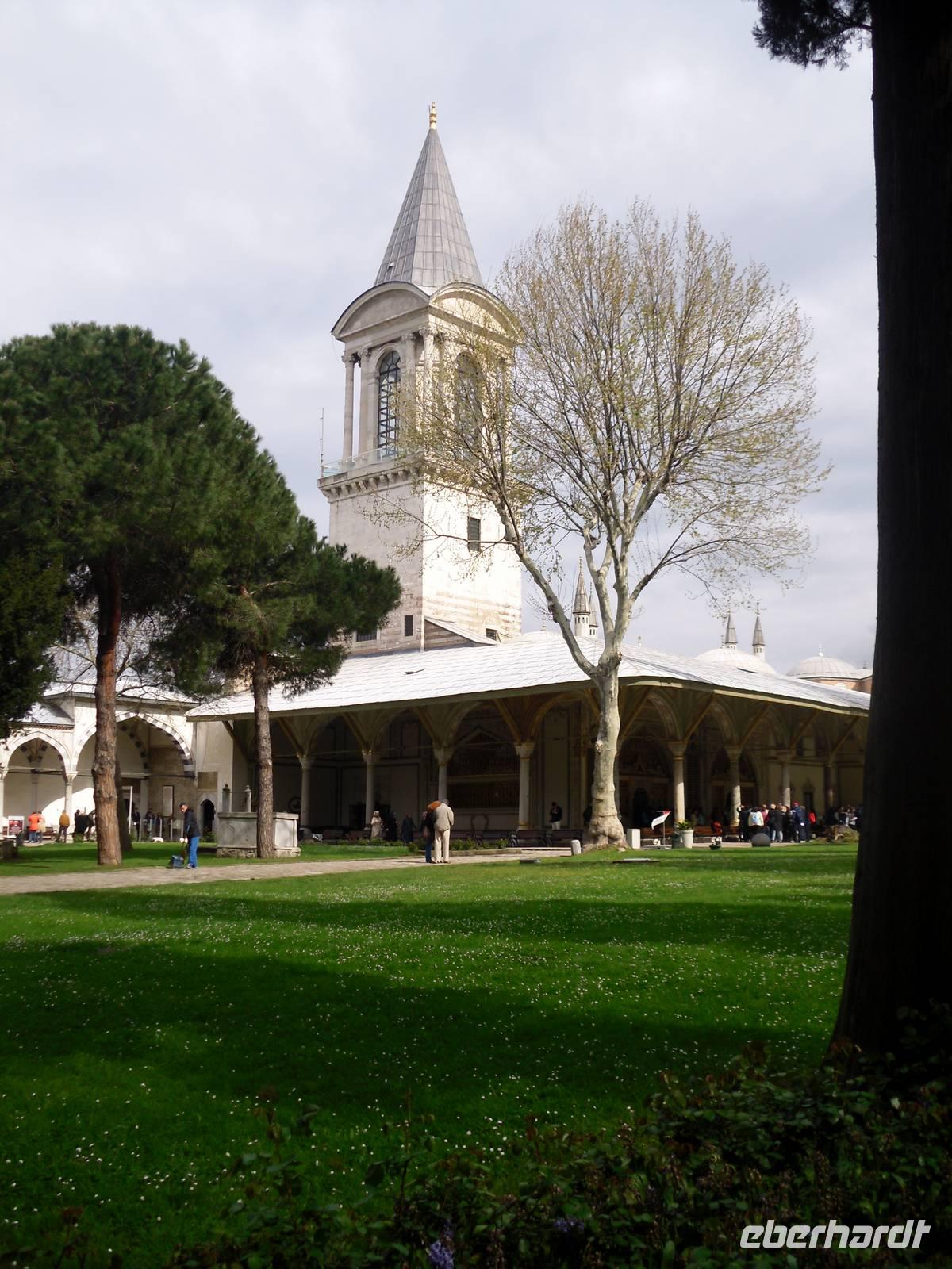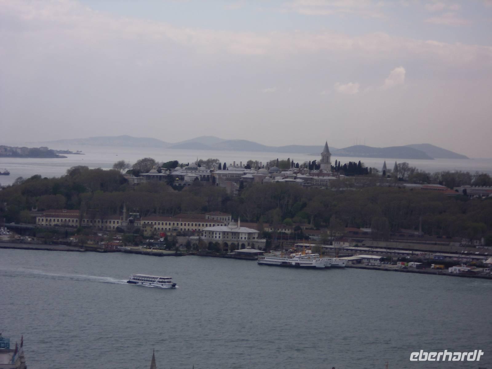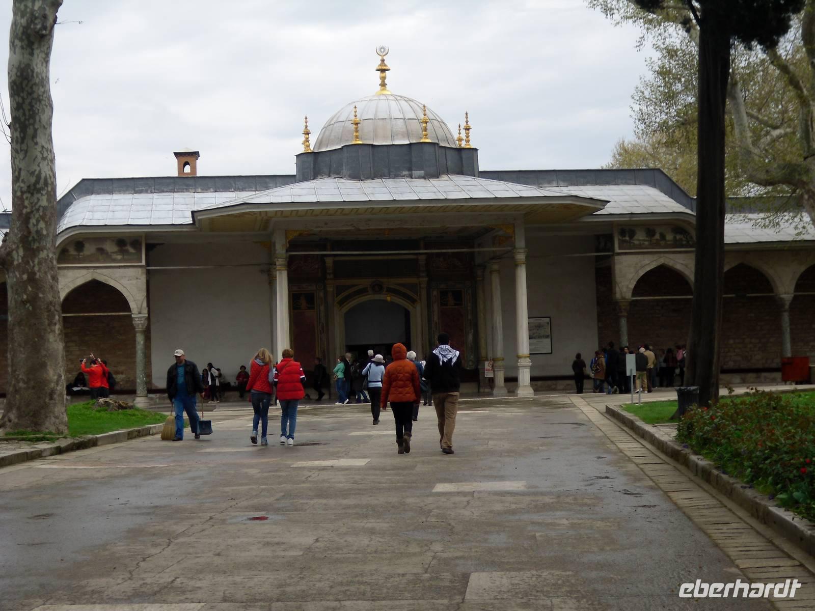 Den Tag starteten wir mit dem Topkapi-Palast, was wörtlich übersetzt Kanonenpalast bedeutet. Erbaut wurde der Palast vom Mehmed II. nach der Eroberung von dem damaligen Konstantinopel im Jahre 1432, durch Renovierungen und Erweiterungen bis zum 18.Jahrhundert entstand das heutige Aussehen dieser Anlage. Der Bau besitzt vier Höfe, welche alle ihre ganz eigene Bedeutung haben und auch nur für einzelne Personen zugänglich waren. Der erste Hof war für die Soldaten vorgesehen, der zweite für Staats- und Verwaltungsräume. Der dritte Hof durfte nur mit einer ausdrücklichen Erlaubnis durch das Tor der Glückseligkeit betreten werden. Hier befand sich der Thronsaal in dem Empfänge höchster Staatsbediensteter und ausländischer Gäste abgehalten worden sind. Im vierten und letzten Hof befanden sich Park und Gartenanlagen, von denen man heute einen herrlichen Blick über den Bosporus bekommt.