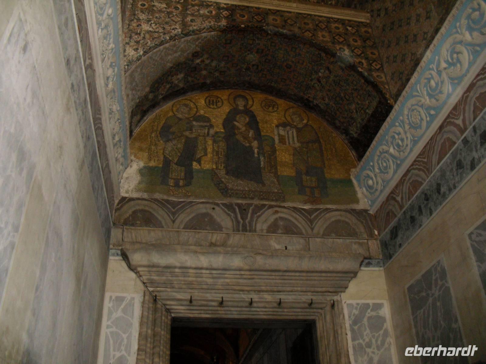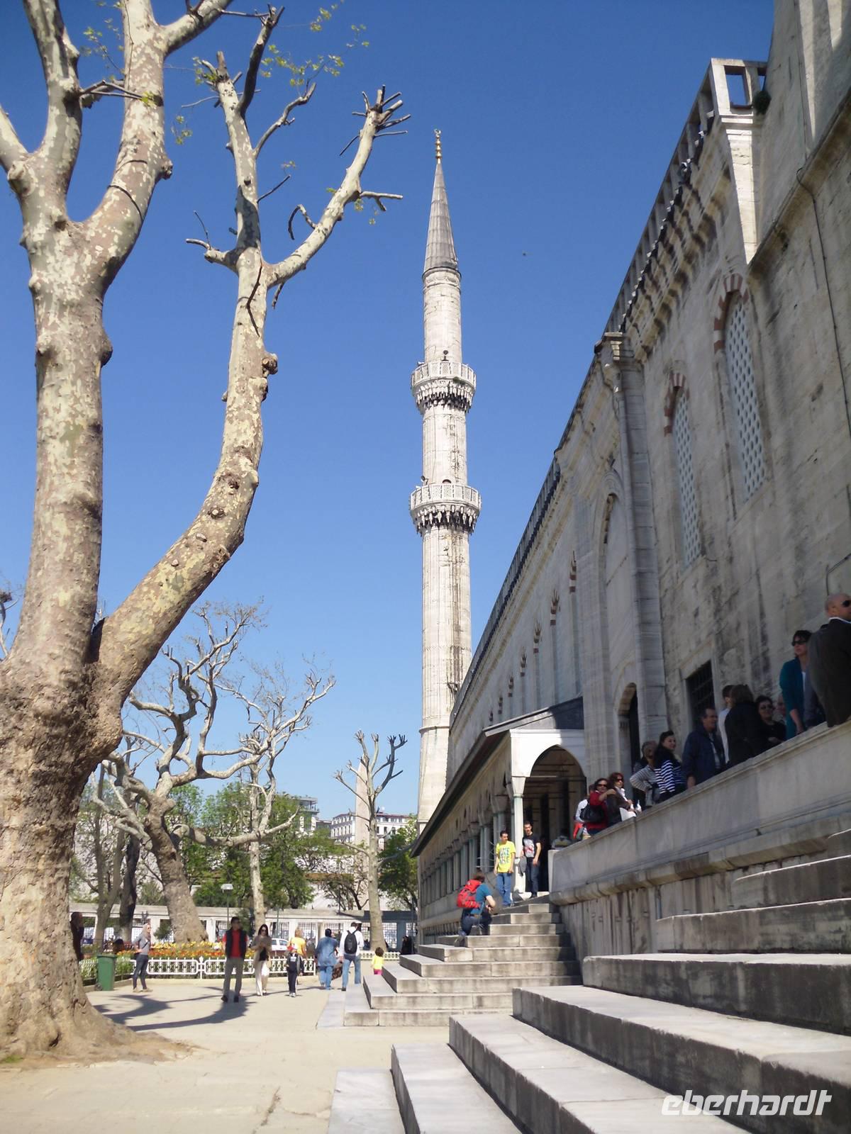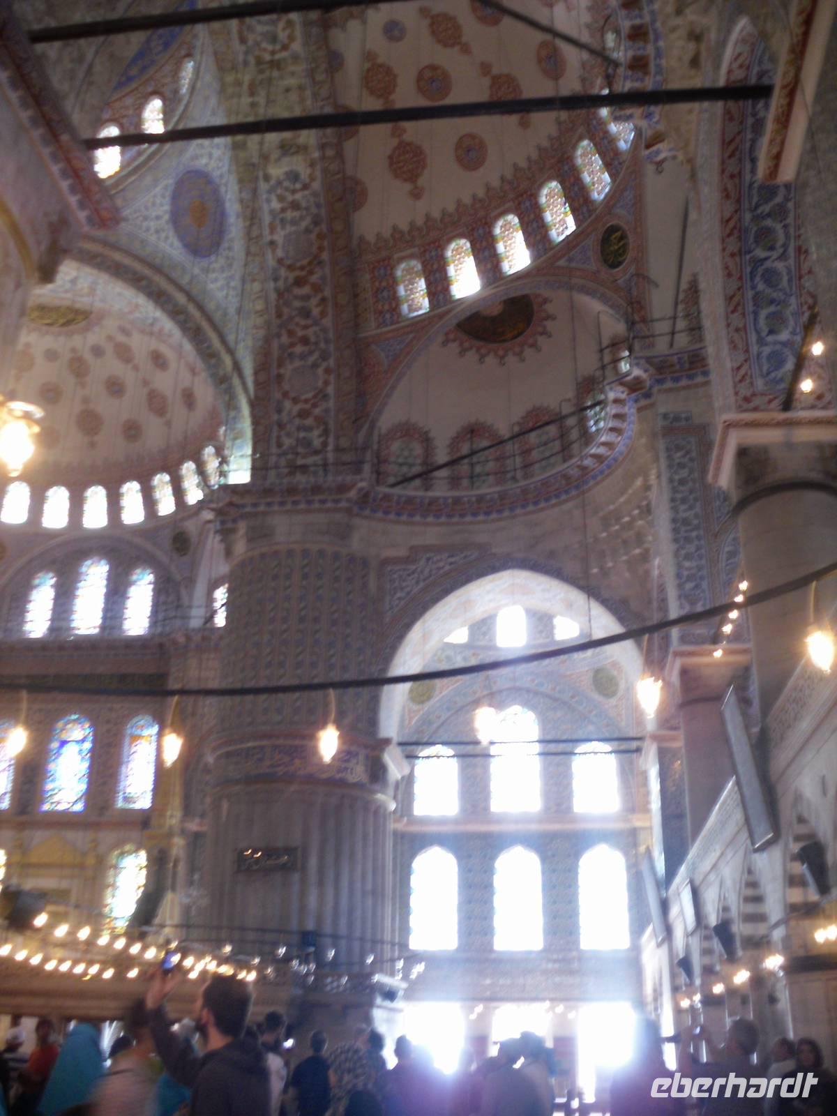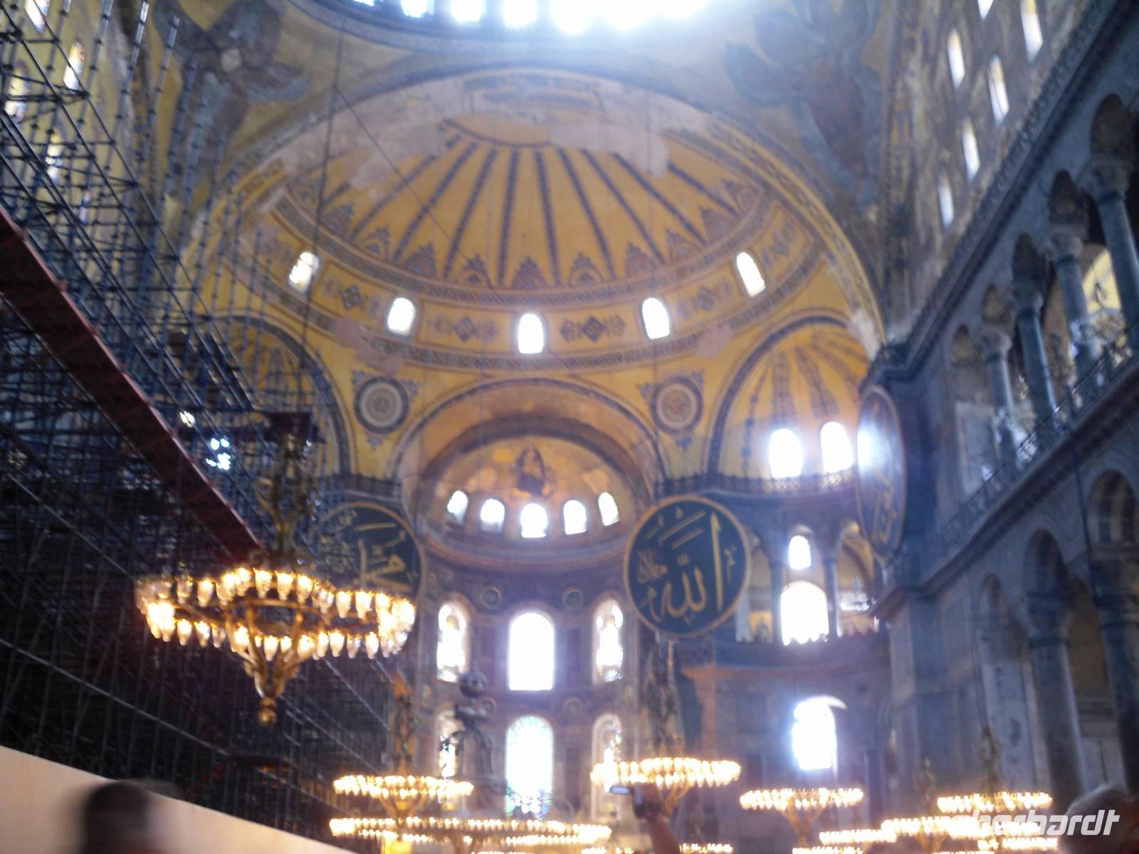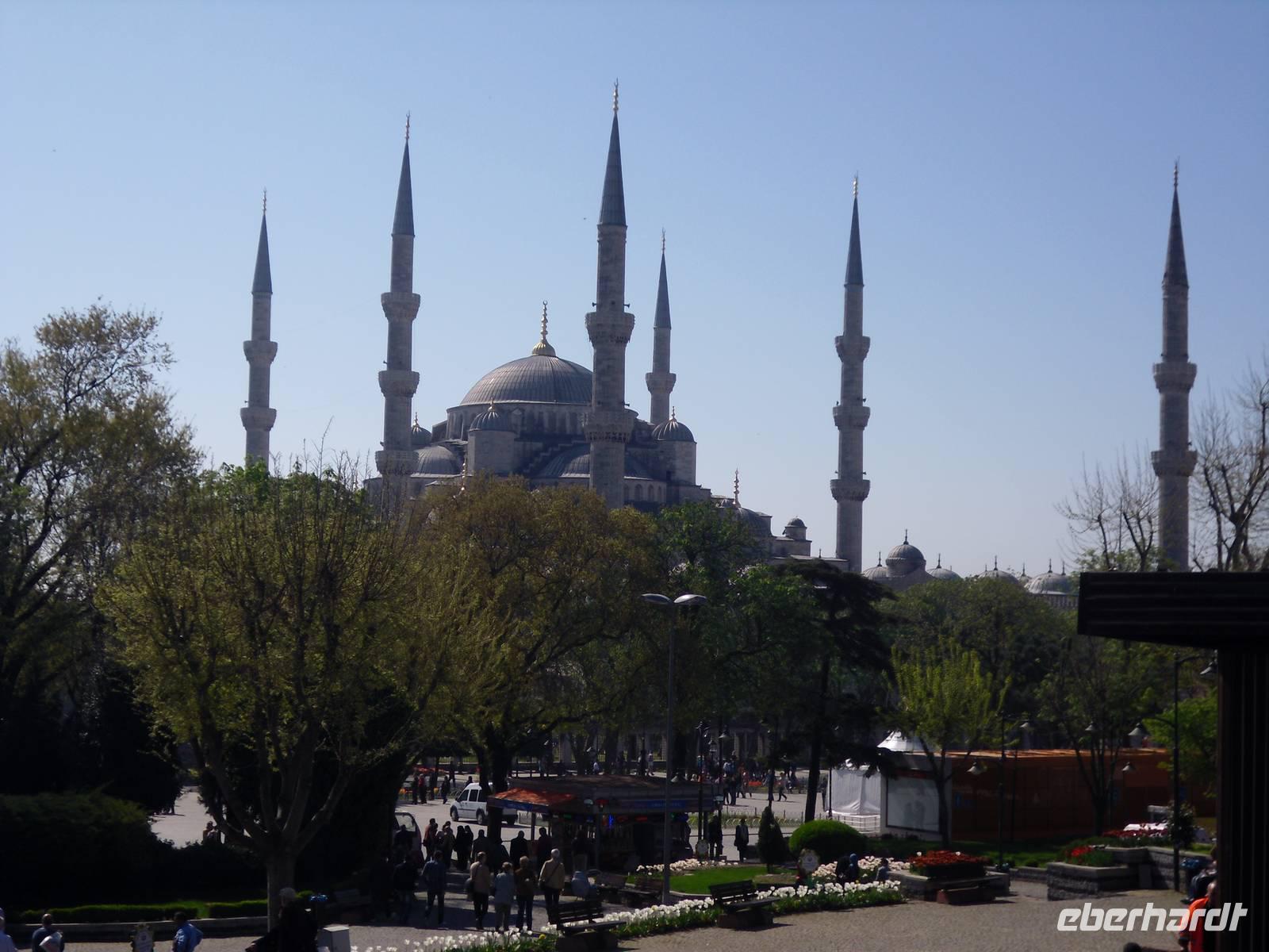 Nach einer angenehmen Nacht, machten wir uns nicht zu früh und nicht zu spät auf zu unserem ersten Tag in der früheren Hauptstadt der Türkei. Bei strahlendem Sonnenschein stand das bekannte Hippodrom mit seinem ägyptischen Obelisken und der Schlangensäule, sowie die Umgebung auf unserem Programm. Den Tag begannen wir mit dem Besuch der Moschee mit den 6 Minaretten. Jeder weiß, dass ich von der Sultan-Ahmet-Moschee, auch Blaue Moschee genannt spreche. Doch die Moschee ist nicht wie vielleicht viele vom Namen her denken von außen blau, sondern das Innere der Moschee ist blau gehalten. Ein Bauwerk mit einer langen Geschichte wartete anschließend auf unseren Besuch, die Hagia Sophia. Hagia Sophia ist aus dem griechischen und bedeutet „heilige Weisheit". Das Wahrzeichen von Istanbul wurde im 6.Jahrhundert als Kirche errichtet und diente in den Folgejahren und nach einem Umbau als Moschee. Heute ist das letzte große Bauwerk der Spätantike ein Museum. Erst im inneren des Museums lernt man dieses Bauwerk zu schätzen, allein das Hauptschiff, welches von 31 Meter Durchmesser beherrscht wird, lässt nur erahnen welche Größen hier eine Rolle spielen. Noch heute findet man in der Hagia Sophia die Spuren der Geschichte die Vorhallen zeigen Mosaike von Maria und dem Christuskind, hingegen das Hauptschiff zeigt die Vergangenheit einer Moschee durch eine Gebetsnische und dem Podest für den Muezzin.