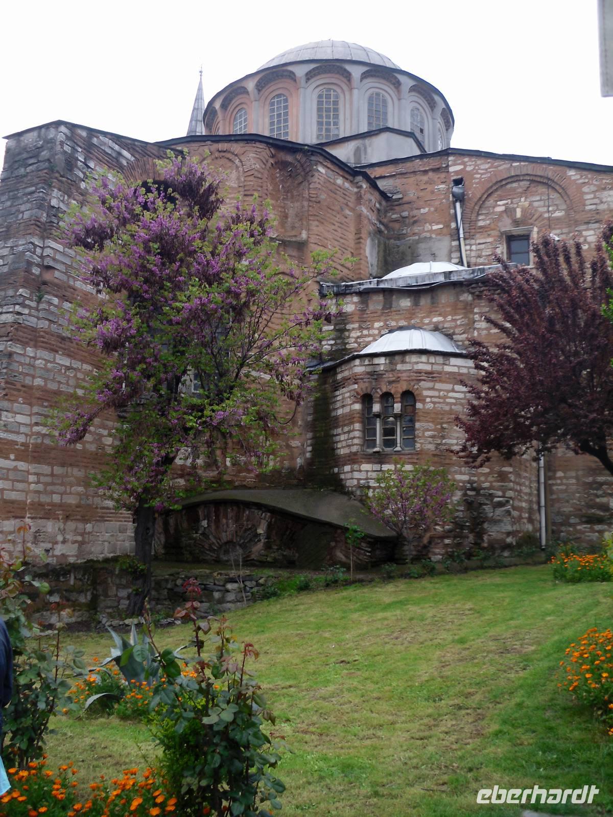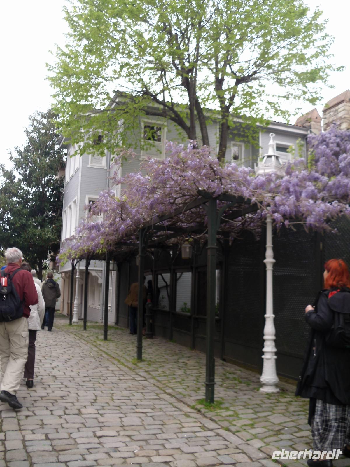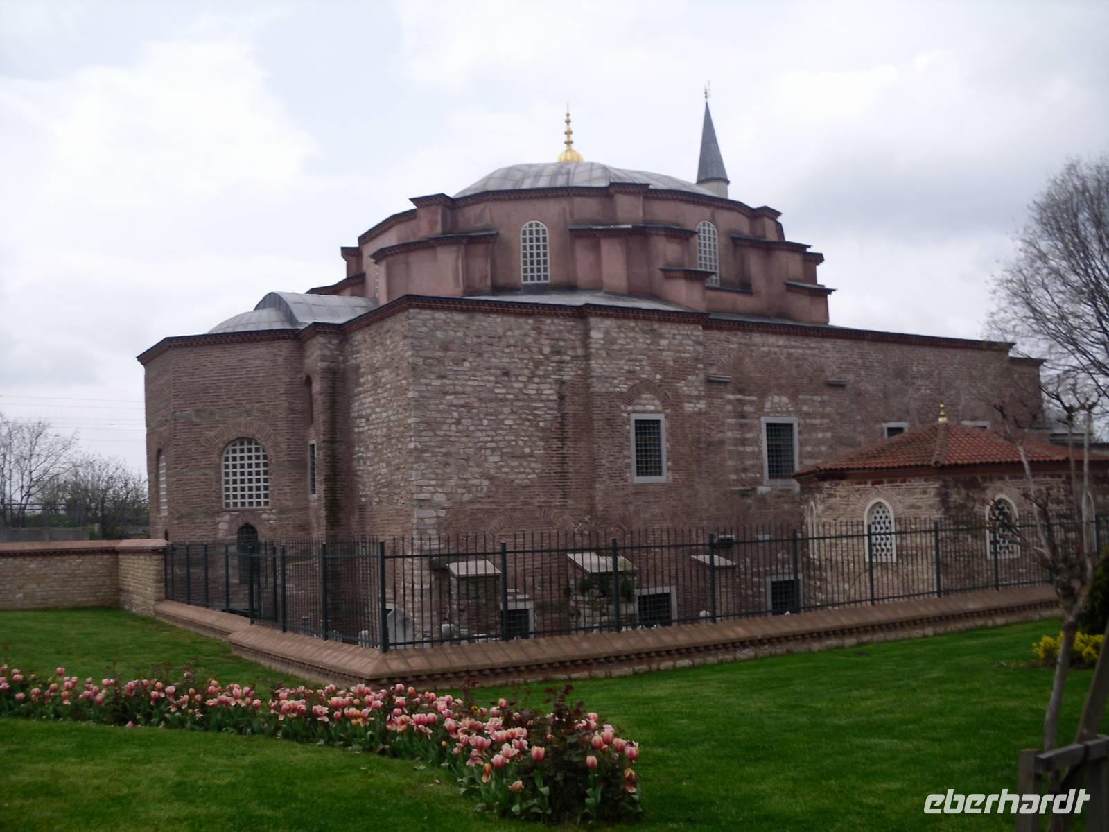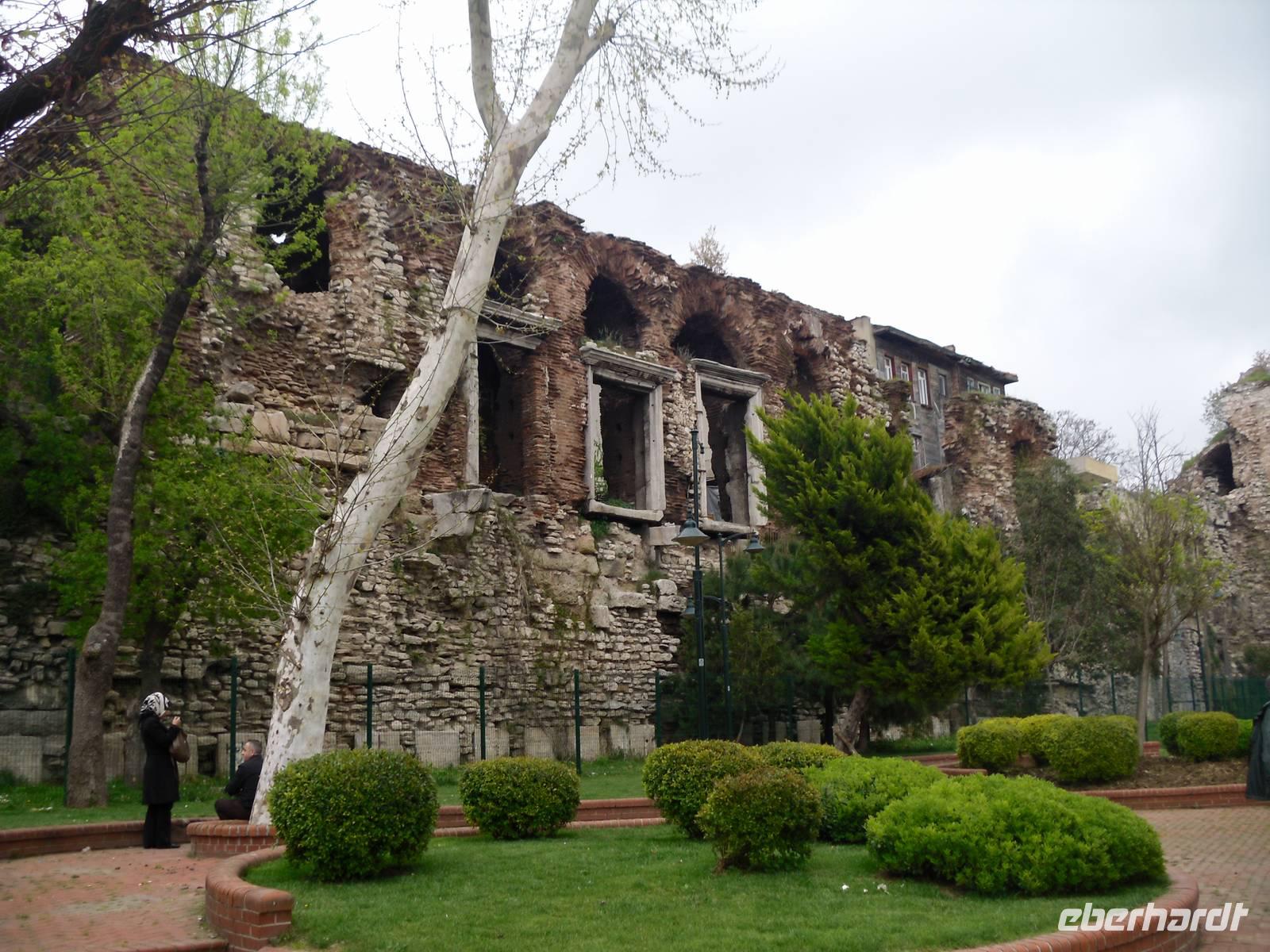 Am Morgen ging es in ein türkisches Bad und nicht wie von den meisten gedacht, um viele Informationen auszunehmen, sondern um es am eigenen Körper zu erleben und zu spüren. Hamam, ist ein meist im arabischen Raum ein wichtiger Bestandteil der islamischen Bade- und Körperkultur. So genossen einige diesen Brauch auf einem warmen Stein, welcher umgeben ist von Becken mit warmen und kalten Wasser. In regelmäßigen Abständen übergießt man sich dann selbst damit. Mit einem Schwamm, der sich ein wenig wie Sandpapier anfühlt, aber oft aus Wildseide und Ziegenhaar besteht, fährt man in kreisender Bewegung über die Haut. Die Reinigung öffnet die Poren und verstärkt den Effekt der Schönheitspflege. Nach einem kurzen Besuch der Sokullu-Moschee gingen wir weiter durch die Stadt, vorbei an der kleinen Hagia Sophia bis zum Bukoleon-Palast. Hier war ein wenig Vorstellungskraft nötig, denn von dem ehemaligen Palast ist heute nur noch ein efeuüberwuchter Mauerrest mit drei Bogenfenstern erhalten geblieben. Der Palast wurde während des Vierten Kreuzzuges fast vollständig zerstört.
