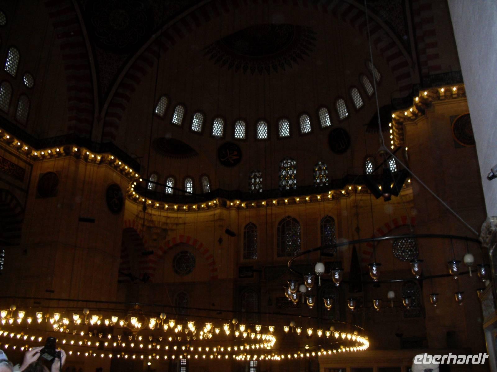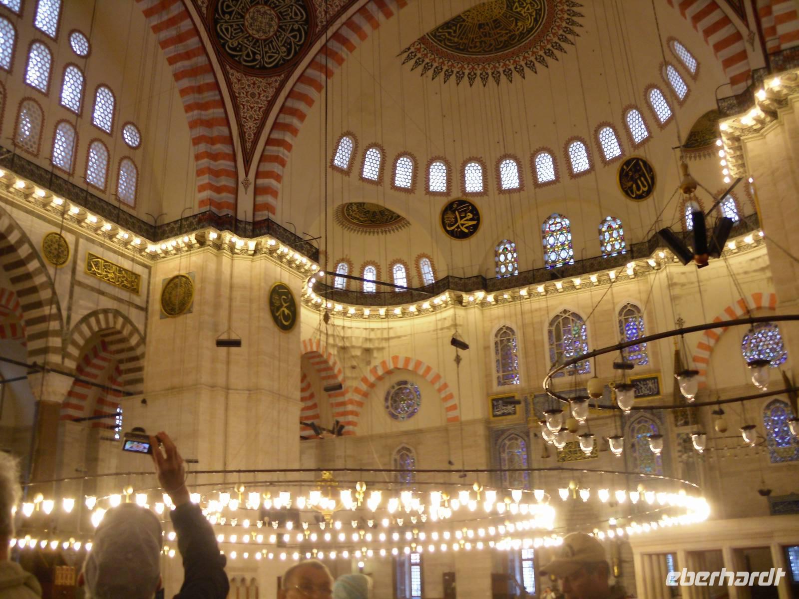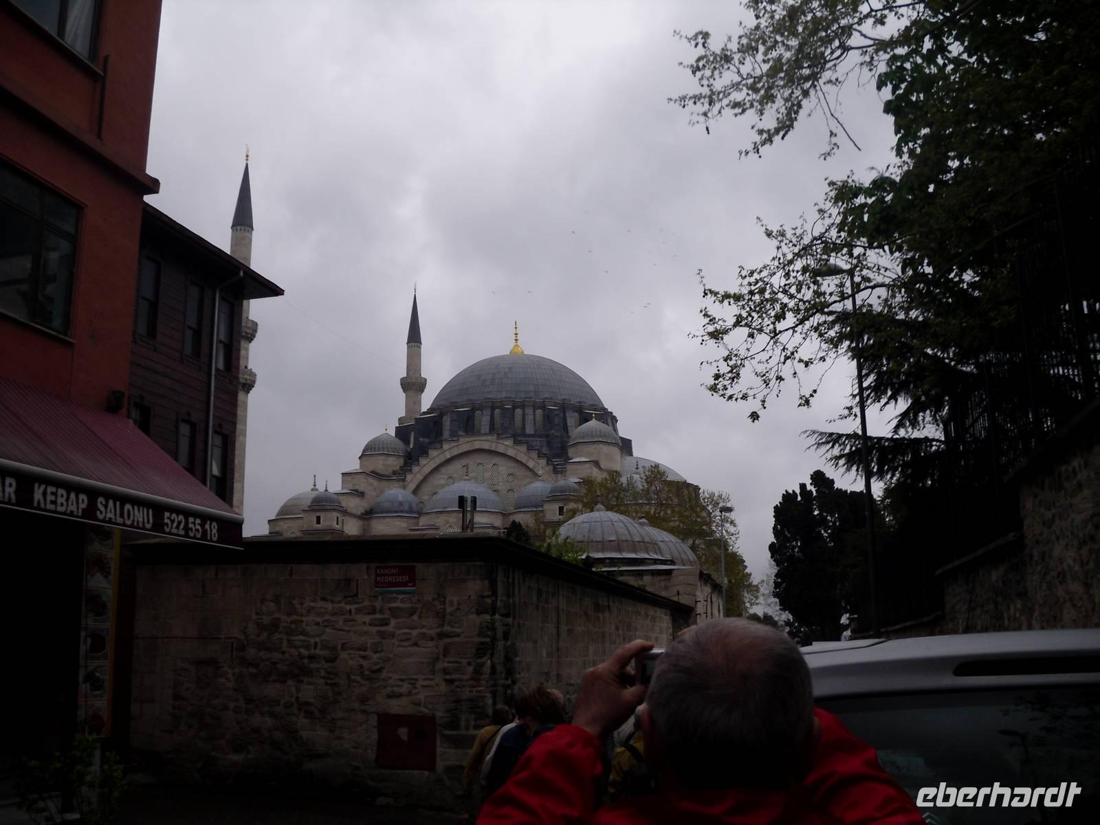 Auf Wunsch von mir, begaben sich meine Gäste und ich uns zu einer der mächtigsten Moscheen Istanbuls. Die Süleymaniye-Moschee steht auf dem dritten Hügel der Stadt und besteht nicht wie alle anderen Moscheen aus einem Reinigungsbrunnen, einem Vorhof und dem Gebetsraum, sondern umfasst noch mehr Bauten. Dazu gehören zum Beispiel der Friedhof, eine Armenküche und zahlreiche Mausoleum, unter anderem das von Süleymans Frau und Tochter.
