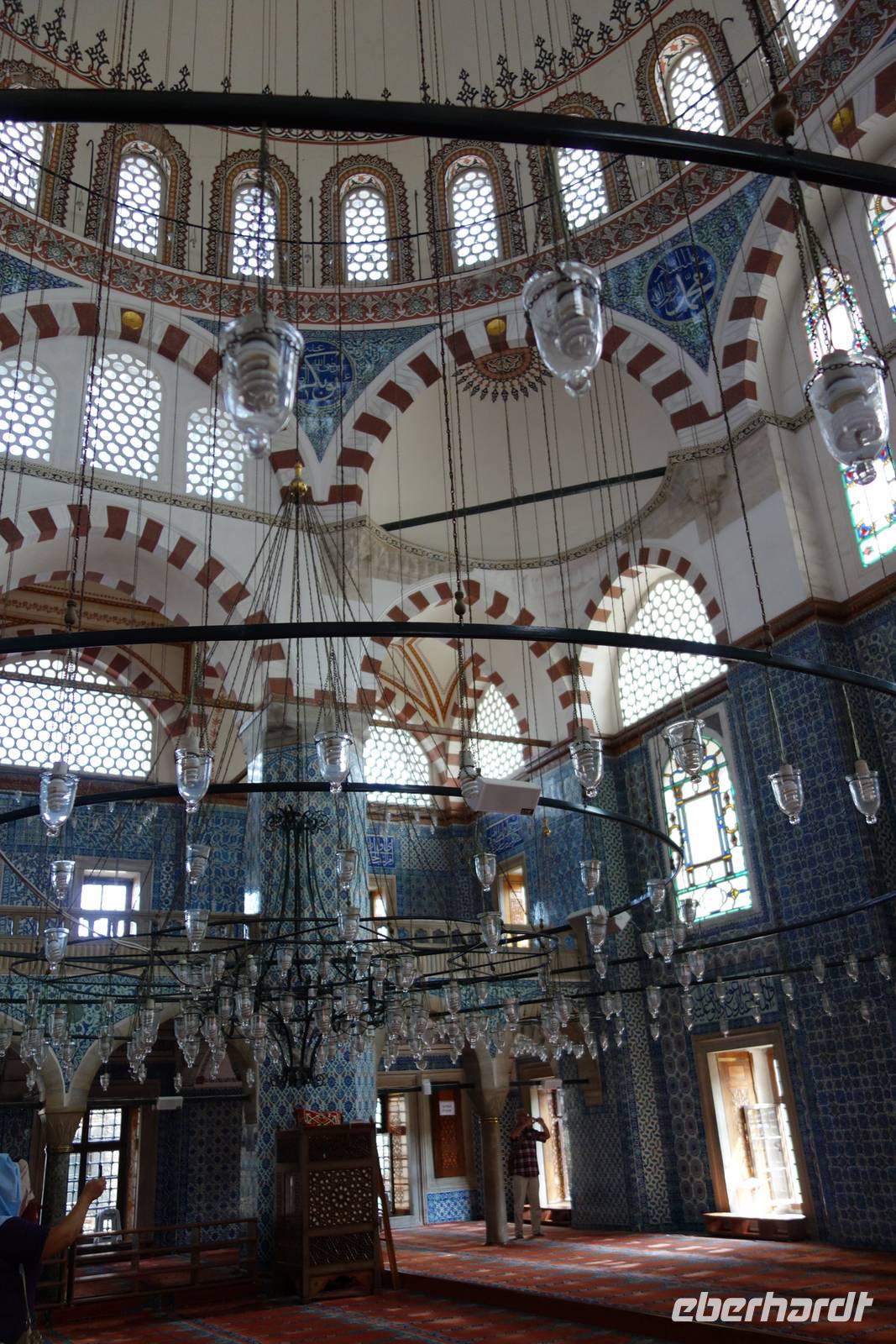 Die Innenseite der Moschee war alles andere als unscheinbar. Blau -weiß - rote Fließen hingen an den Wänden, ein riesiger Kronleuchter füllte den Raum aus und der weiche Teppich unter unseren Füßen verlieh diesem Gebäude einen unglaublichen Charme.