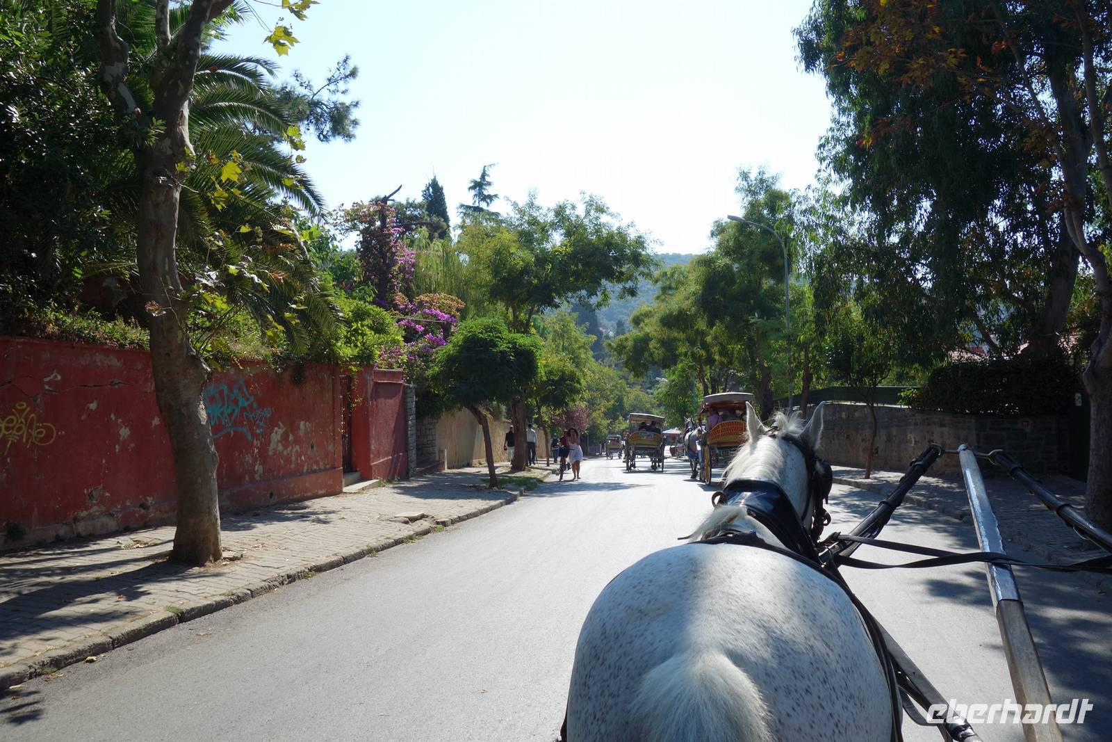 Nach dem, wie üblich reichlichem, Frühstück ging es heute nur kurz mit dem Bus zum Hafen. Denn von dort aus stiegen wir direkt auf das Boot um, welches uns zu den Prinzeninseln brachte. Zwischen Pinien und vielen andern Touristen ging es in kleinen Kutschen einmal um die Insel Üsküdar. Vorbei an eindrucksvollen Villen, die ihre besten Jahre leider schon hinter sich hatten. Danach hatten wir ausreichend Zeit, um uns auf der Insel umzuschauen. Einige schwärmten nachher vom Fischessen, andere vom guten Türkischen Kaffee. Es war also ein sehr entspannter Vormittag. Die Bootsfahrt zurück dauerte etwas länger, denn wir haben eine andere Route genommen. Vorbei am Mädchenturm, samt unseren ständigen Begleitern: den Möwen. Wie bestellt flogen sie um unser Schiff und gaben einen tollen Kontrast zum blauen Himmel und dem von der Sonne glitzernden Wasser.