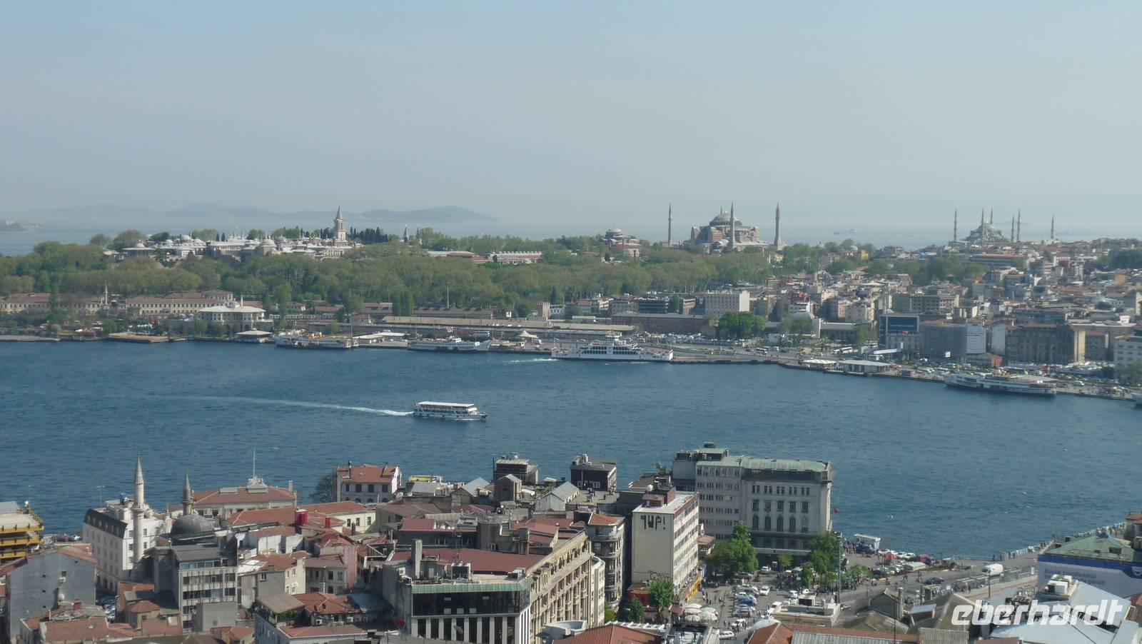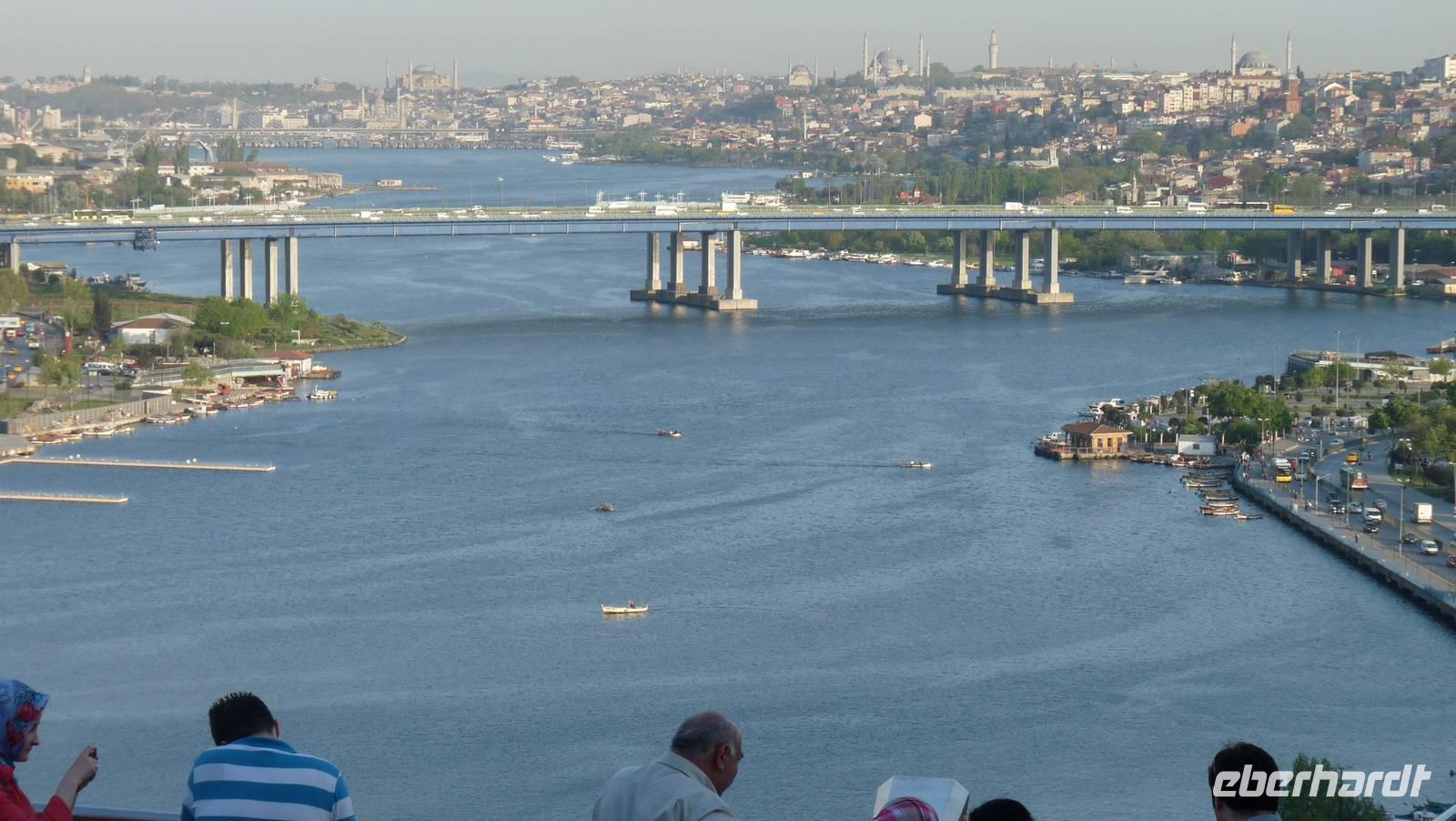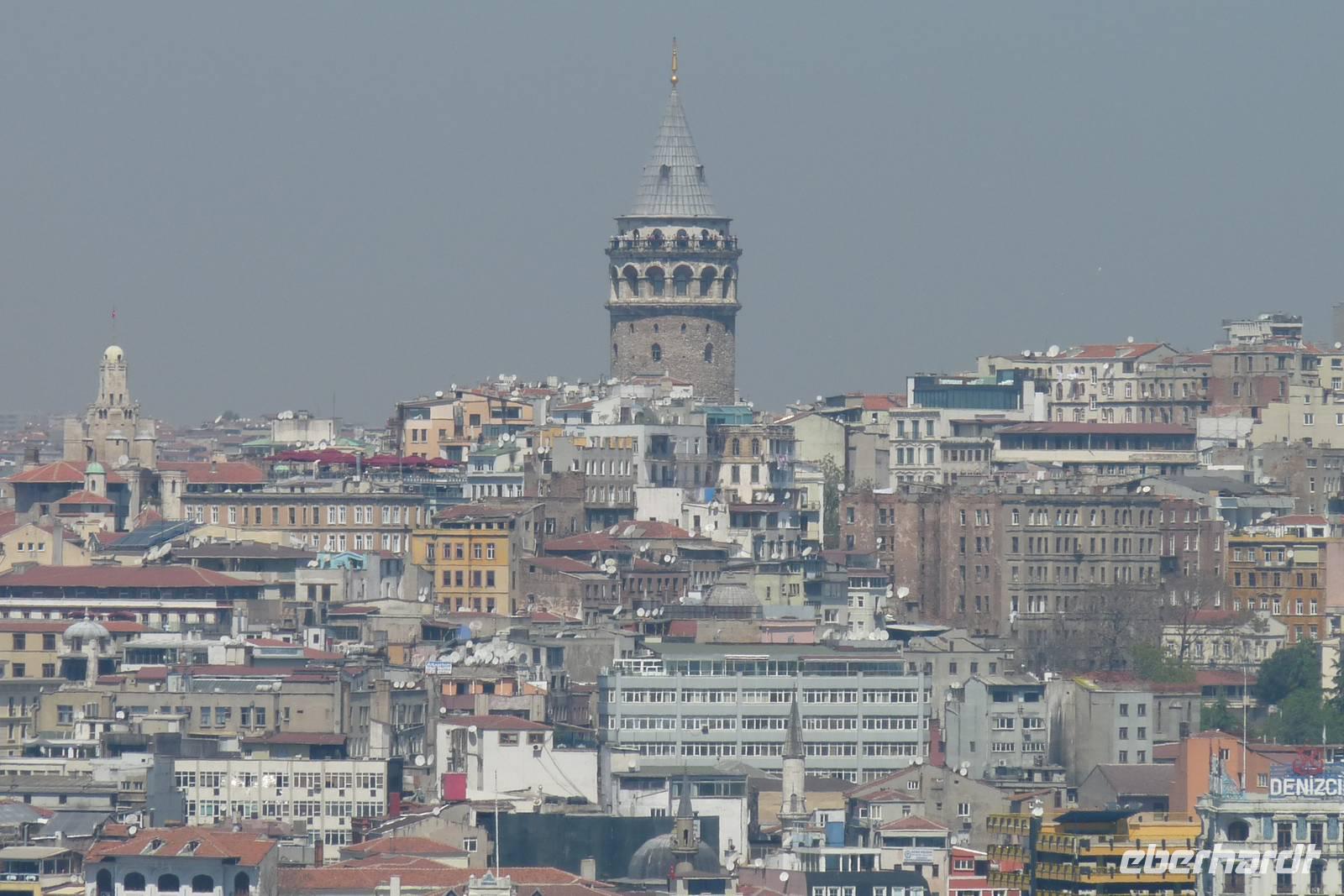 Der 61 Meter hohe Galataturm entstand in seiner heutigen Form im 14. Jahrhundert und diente einst als Feuerwachturm und Gefängnis. Heute ist er ein beliebter Aussichtsturm. Bevor wir die Aussicht genießen können, müssen wir geduldig warten, aber es lohnt sich: Wir sehen das Goldene Horn, Sultanahmet mit Topkapi-Palast, Hagia Sophia und Blauer Moschee und beobachten den Schiffverkehr auf dem Bosporus.