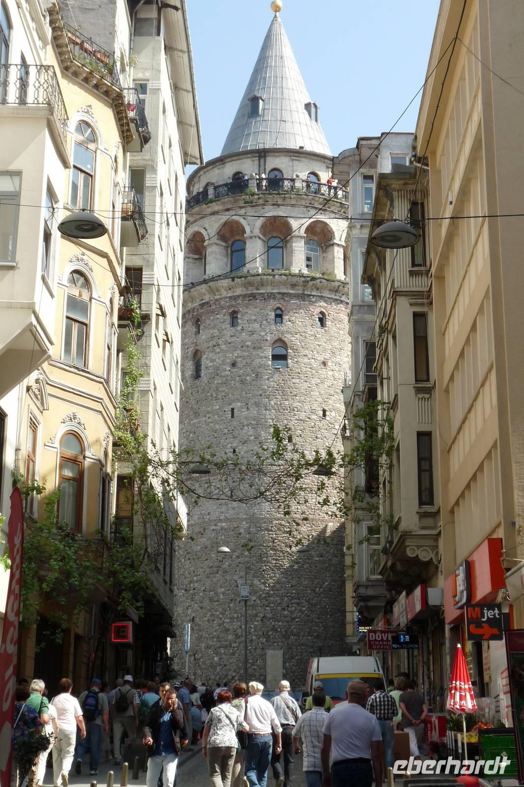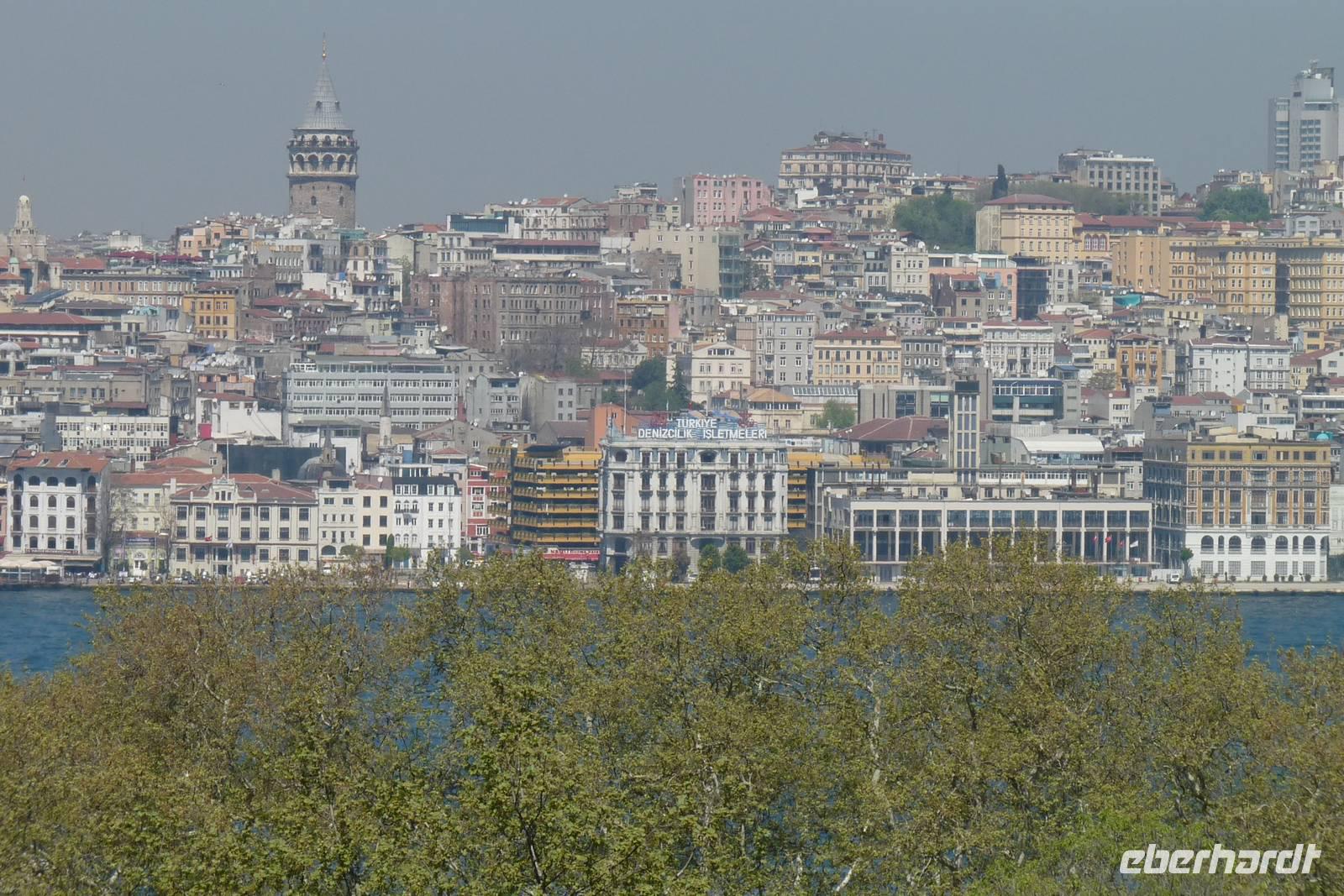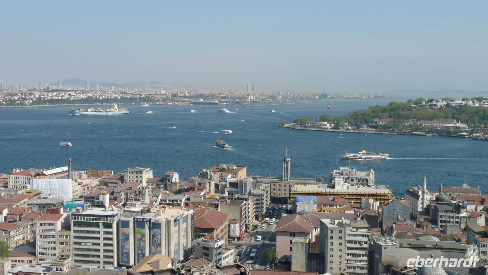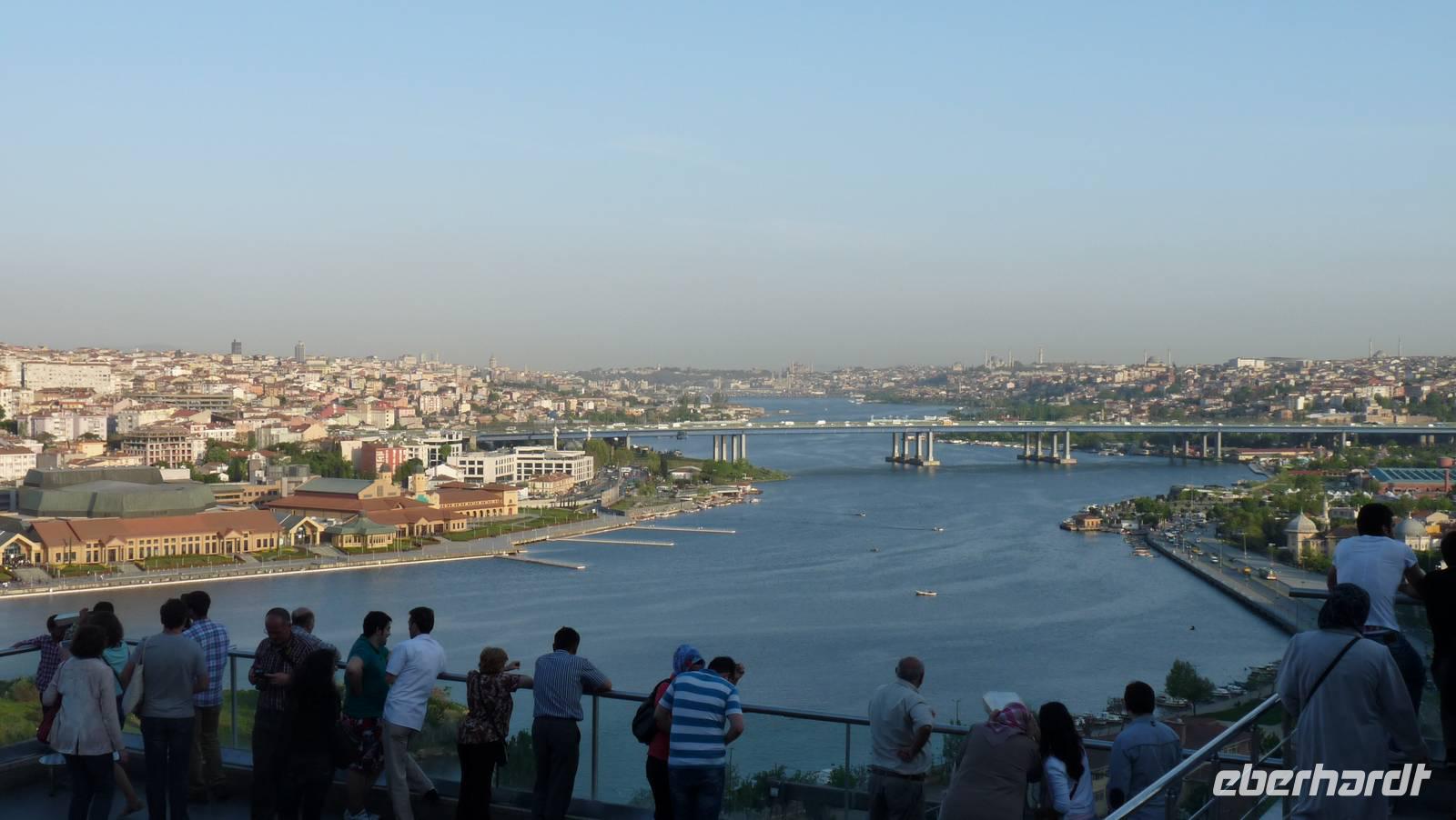 Der 61 Meter hohe Galataturm entstand in seiner heutigen Form im 14. Jahrhundert und diente einst als Feuerwachturm und Gefängnis. Heute ist er ein beliebter Aussichtsturm. Bevor wir die Aussicht genießen können, müssen wir geduldig warten, aber es lohnt sich: Wir sehen das Goldene Horn, Sultanahmet mit Topkapi-Palast, Hagia Sophia und Blauer Moschee und beobachten den Schiffverkehr auf dem Bosporus.