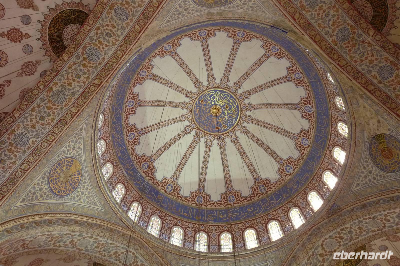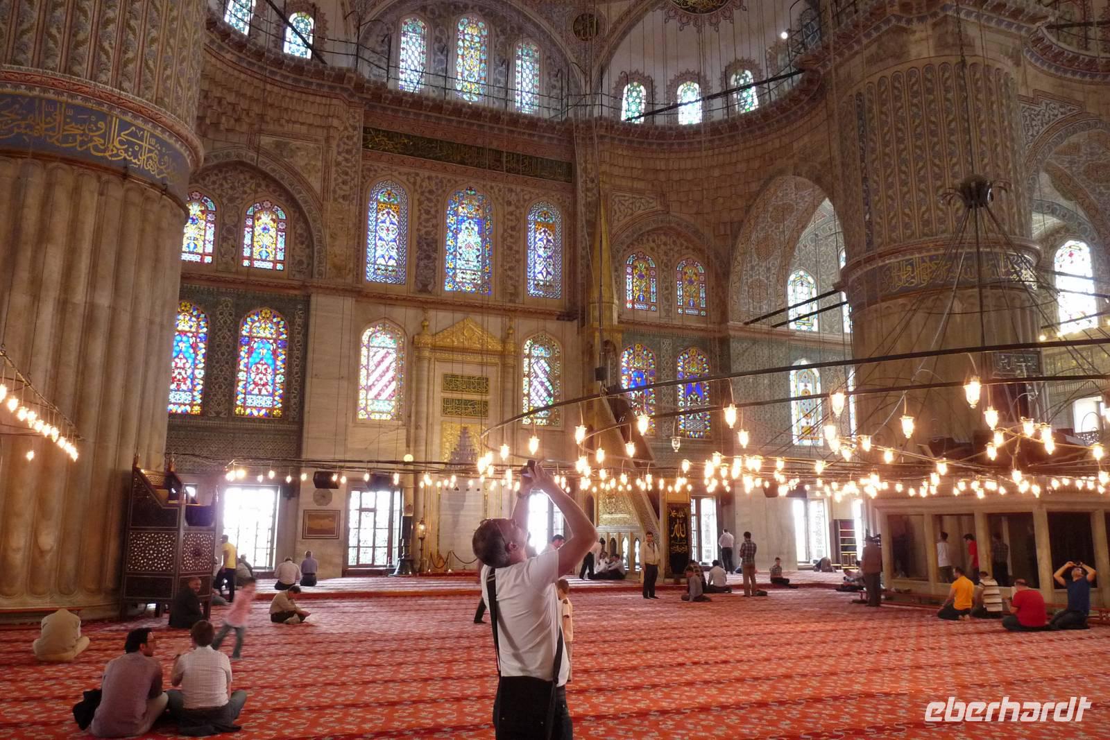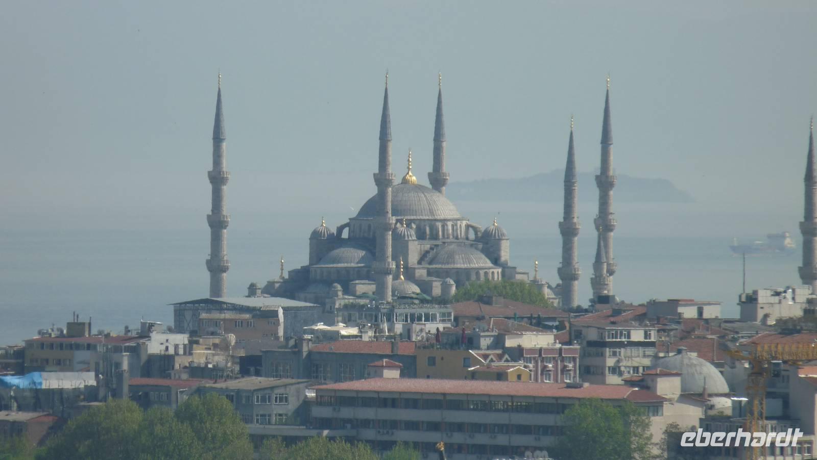 Nach dem Mittagessen gestärkt, besichtigen wir die Sultan Ahmed Moschee. Sie zählt zu den architektonisch bedeutendsten Sakralbauten in der Welt. In Mitteleuropa nennen wir sie aufgrund der blau-weißen Fayencen im Inneren meistens „Blaue Moschee". Anfang des 17. Jahrhunderts ließ Sultan Ahmed I. sie in nur 7 Jahren Bauzeit errichten. Sein Ansinnen war es, die Hagia Sophia in ihrer Größe zu übertreffen, was dem Sultan jedoch nicht gelang. Im Inneren der Blauen Moschee stehen wir unter der reich verzierten Kuppel mit einer Höhe von 43 m und 23,5 m Durchmesser.