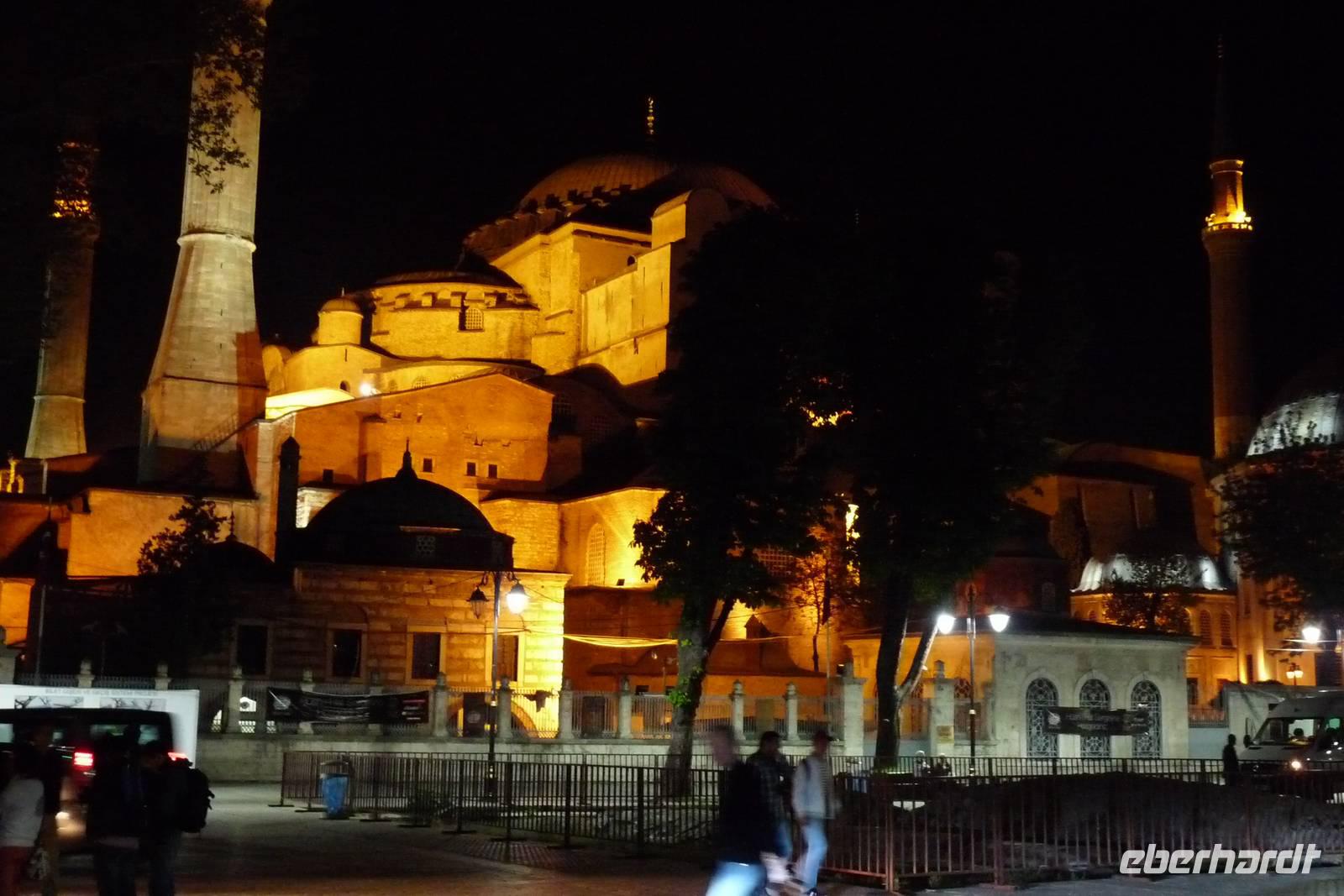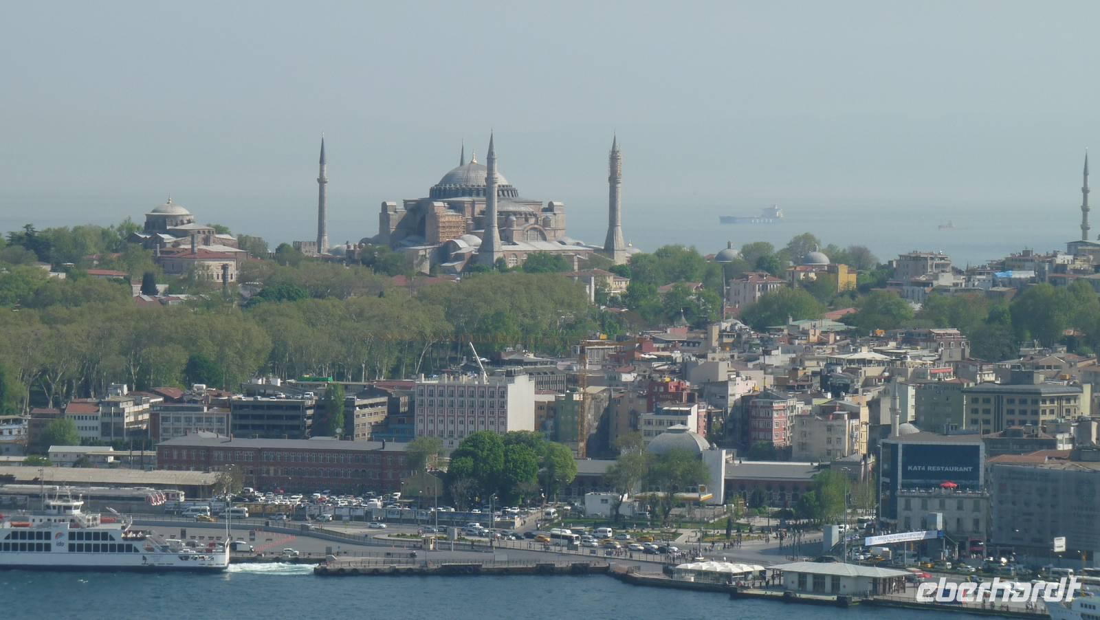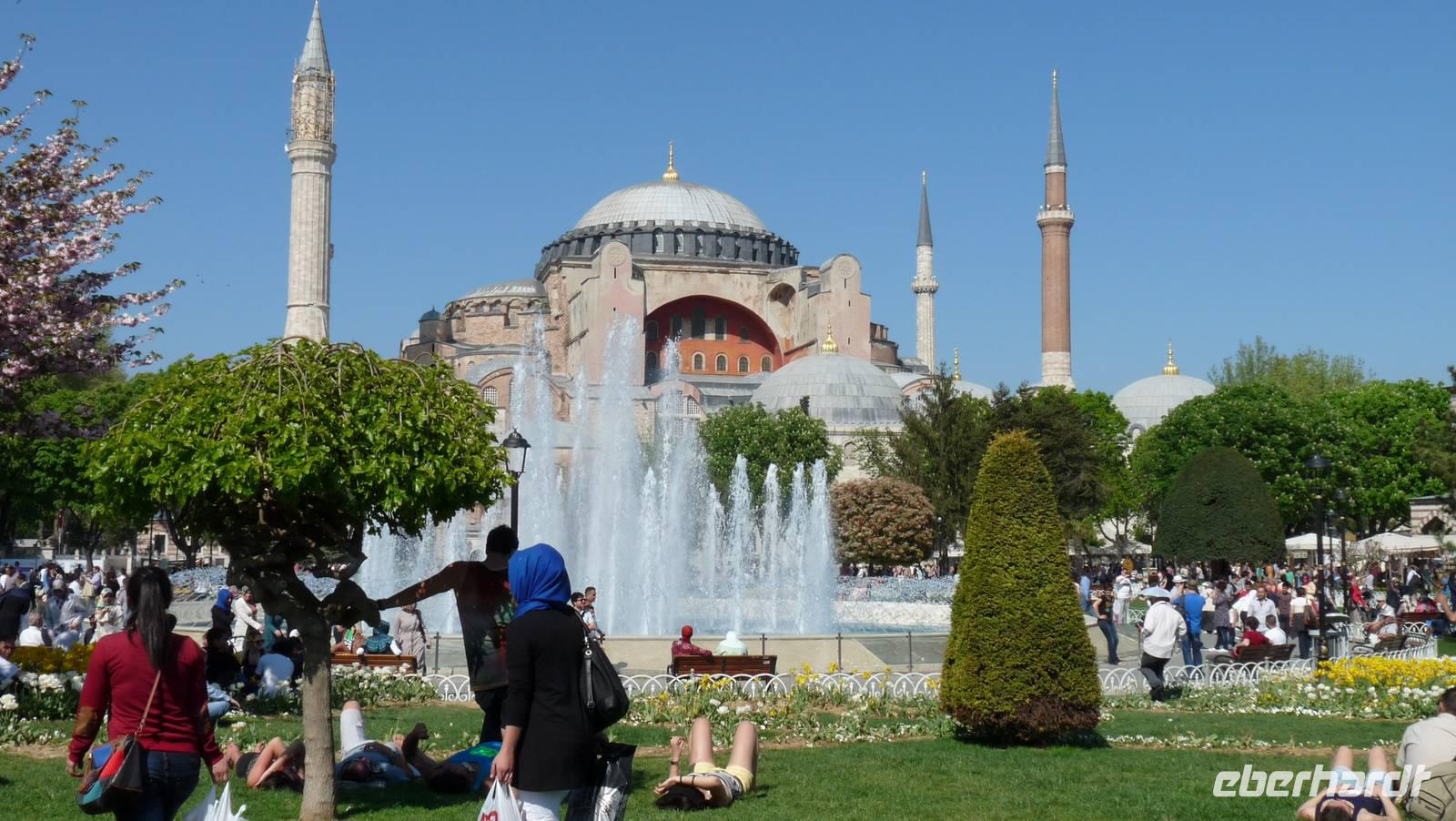 Die „Heilige Weißheit" - Hagia Sophia, 537 vom byzantinischen Kaiser Justinian eingeweiht, hat eine um 11 Jahrhunderte längere Geschichte als die Blaue Moschee. Fast 9 Jahrhunderte Kirche, dann 470 Jahre Moschee ist sie seit Atatürks Erlass im Jahre 1934 nun Museum. Und so betrachten wir im Inneren Symbole von Muslimen und Christen - ganz nach der Idee des Staatsgründers Atatürk, der mit dem Museum das gemeinsame kulturelle Erbe über das Trennende der Religionen heben wollte.