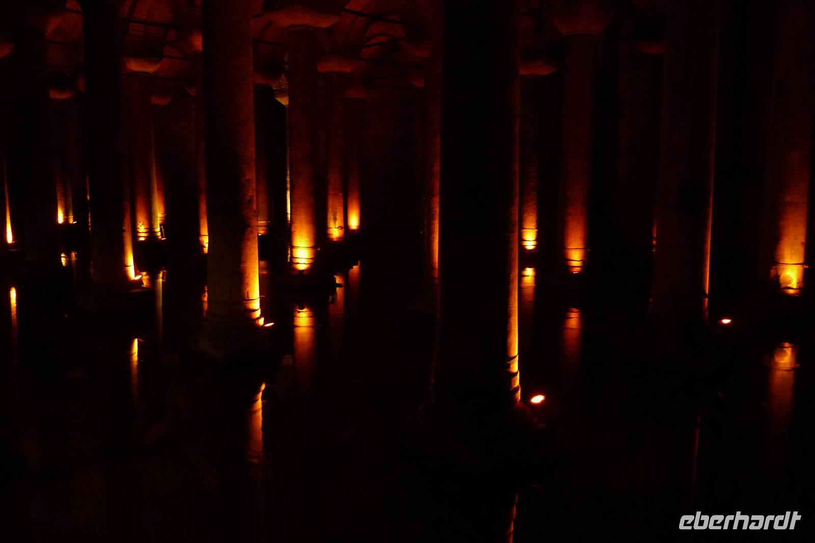An einem unscheinbaren Häuschen steht eine Menschenschlange: Es ist der Eingang zur Yerebatan-Zisterne. Die Zisterne fasste einst 80.000 Kubikmeter Trinkwasser. Wir spazieren auf den neu angelegten Wegen durch die Säulenhalle. Bis 1987 war sie nur mit Booten zugänglich. Berühmt wurde die Yerebatan-Zisterne als Filmkulisse in einem James Bond Film.