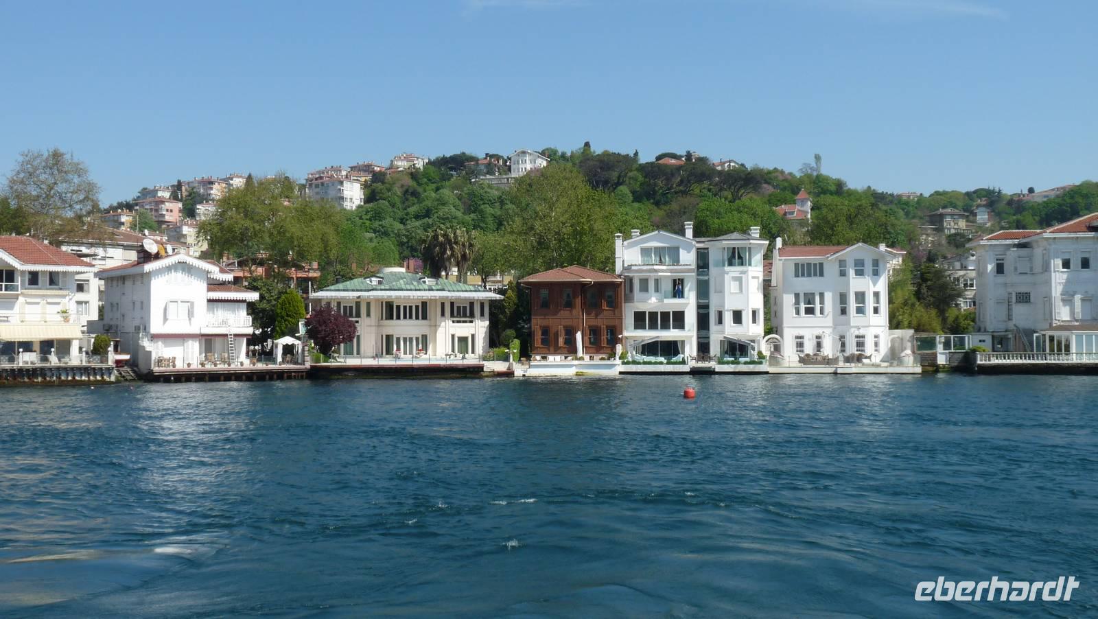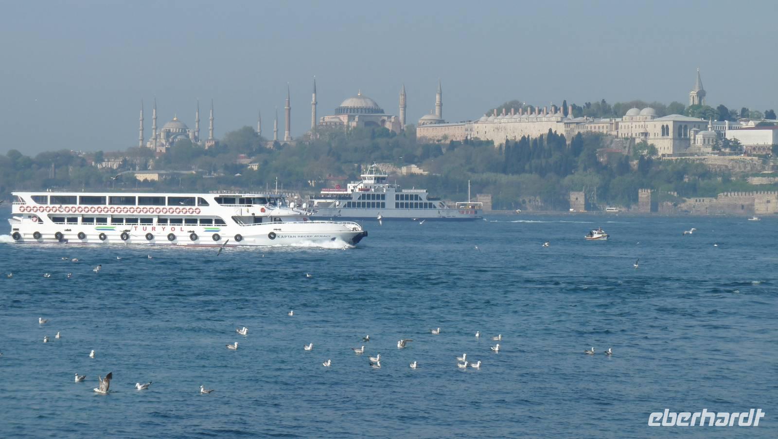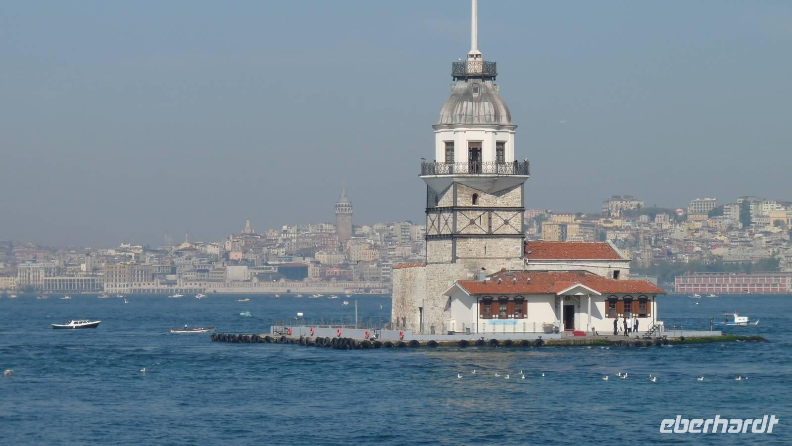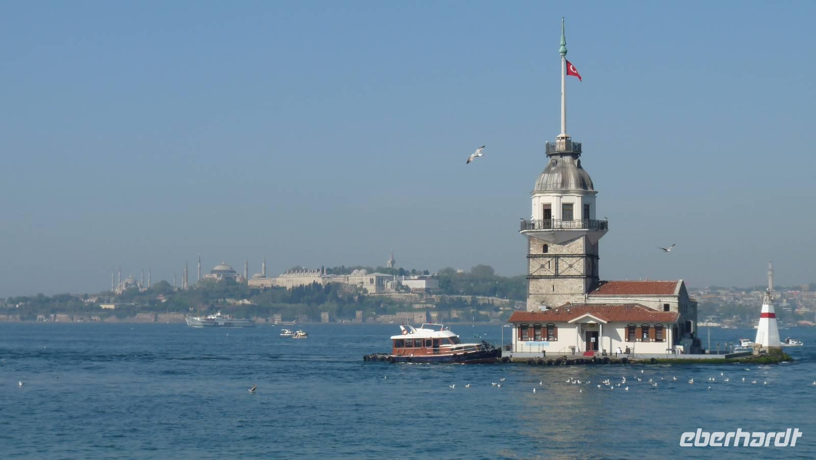 Entlang des Bosporusufers fahren wir vorbei an historischen Holzhäusern und millionenschweren Villen der Stadtteile Skutari und Kalchedon. Am Mädchenturm (auch Leanderturm oder Kiz Kulezi) haben wir einen faszinierenden Blick auf den europäischen Teil beiderseits des Goldenen Horns. Am heutigen Sonntag genießen auch viele Istanbuler den Sonnenschein und die Atmosphäre am Bosporus.