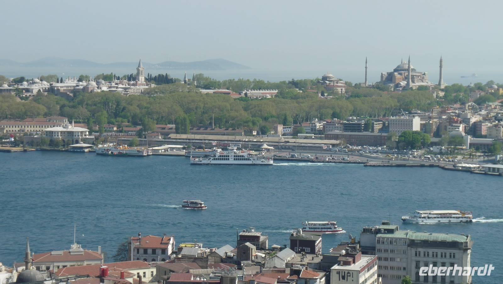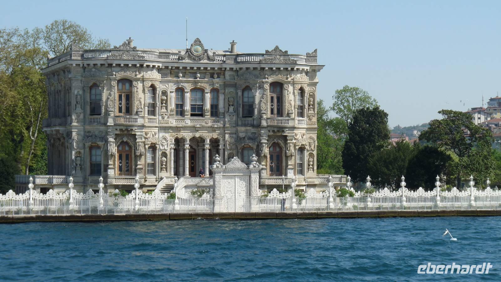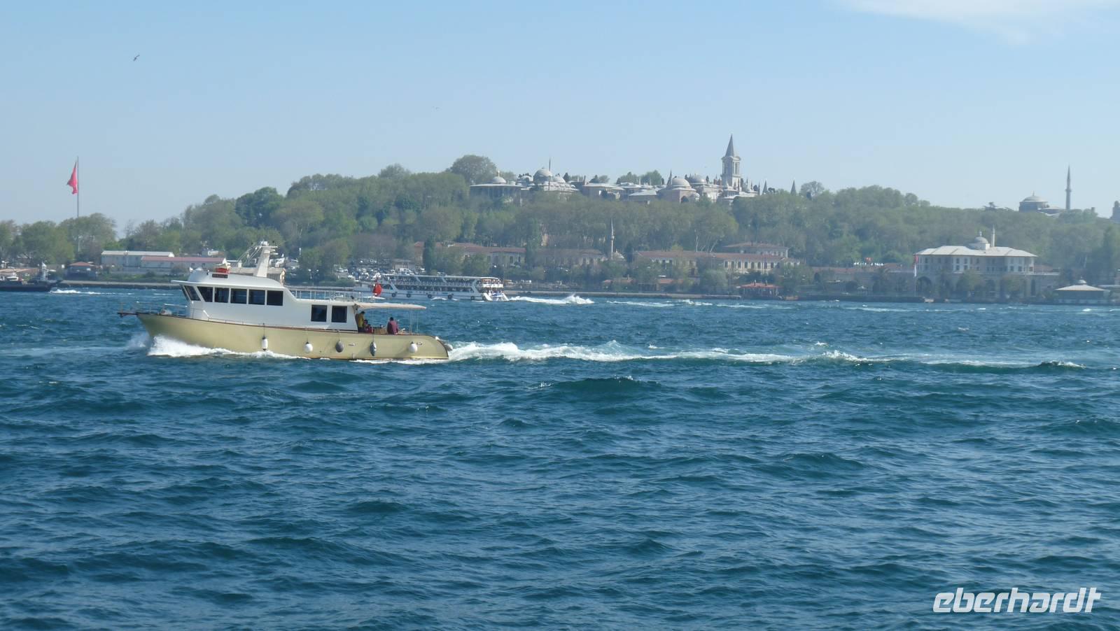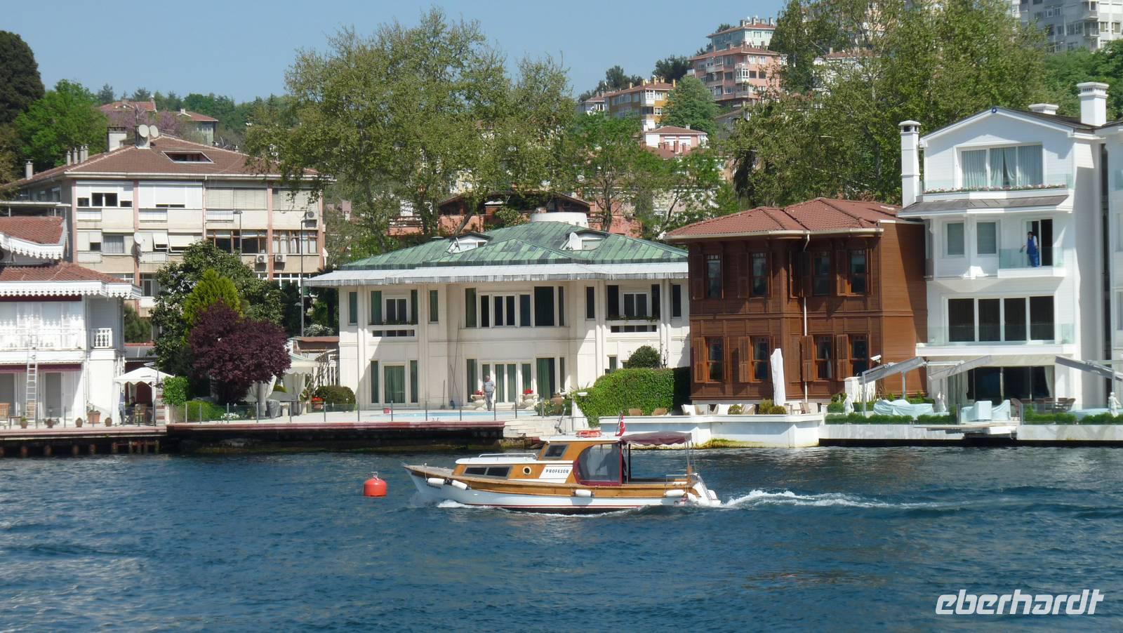 Entlang des Bosporusufers fahren wir vorbei an historischen Holzhäusern und millionenschweren Villen der Stadtteile Skutari und Kalchedon. Am Mädchenturm (auch Leanderturm oder Kiz Kulezi) haben wir einen faszinierenden Blick auf den europäischen Teil beiderseits des Goldenen Horns. Am heutigen Sonntag genießen auch viele Istanbuler den Sonnenschein und die Atmosphäre am Bosporus.