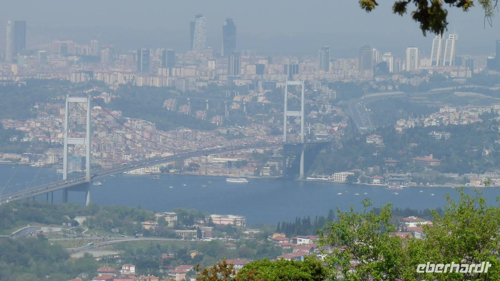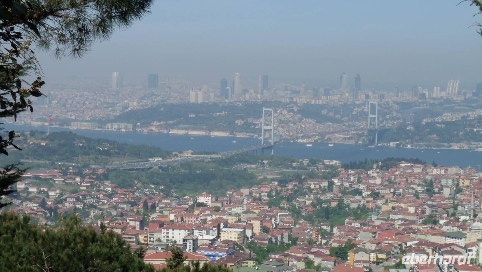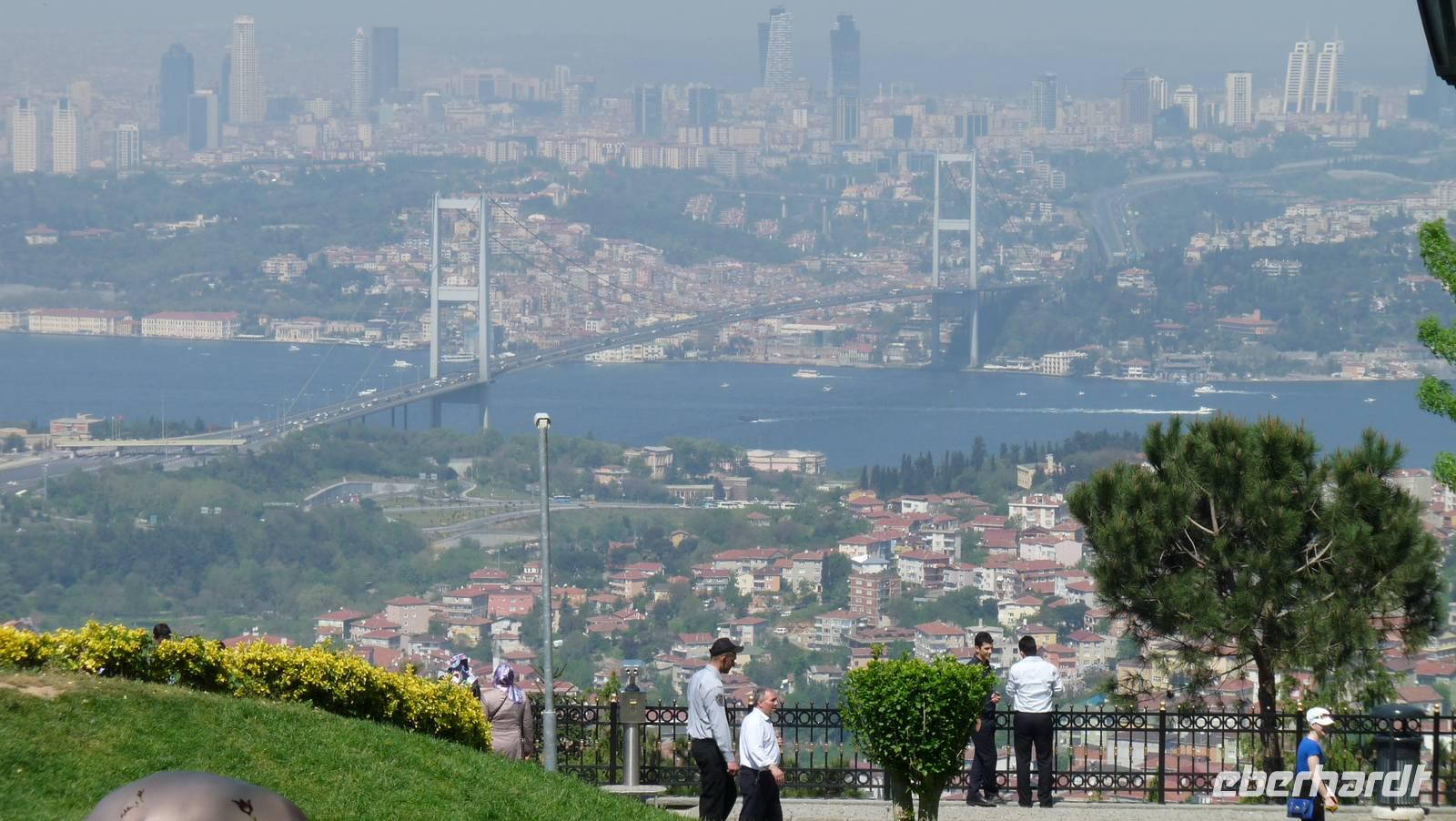 Der Büyük Camlica, „Tannen- oder Pinienhügel" ist mit 261 Meter der größte Hügel der Stadt. Pinien gibt es hier auch, neben vielleicht genauso viel Rundfunkantennen. Wir geniesen von hier eine berauschende Aussicht auf den Bosporus mit der Atatürkbrücke, die Skyline von Levent, Sultanahmet und das Goldene Horn.