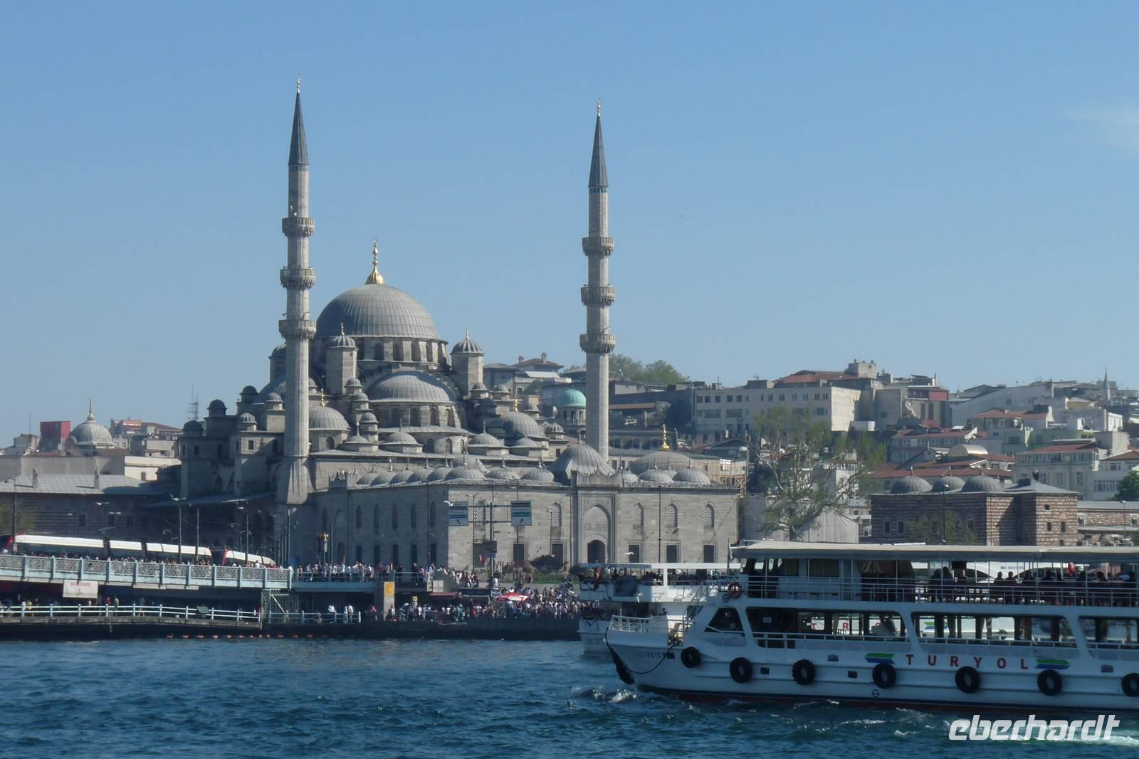 Nach einem Blick auf die Bosporusmündung ins Schwarze Meer und die Genuesische Festung setzen wir unsere Reise auf dem Wasser fort. Von Tarabya aus fahren wir mit dem Boot den Bosporus Richtung Süden. Unsere Schifffahrt führt uns vorbei an Villen und Palästen. Wir queren die beiden Bosporus-Hängebrücken, zuerst die Fatih-Sultan-Mehmet-Brücke (1988 erbaut) und die Atatürk-Brücke (1973 erbaut, auch Europabrücke genannt). Unsere Schifffahrt endet am Goldenen Horn. Von hier aus sind es nur ein paar Schritte bis zum Gewürzsouk, dem so genannten Ägyptischen Basar. Die Verkaufsstände sind eine Augenweite. Neben Gewürzen werden auch Süßigkeiten (Halwa), Nüsse und Trockenfrüchte angeboten. Später werden wir davon noch einige Kostproben naschen.