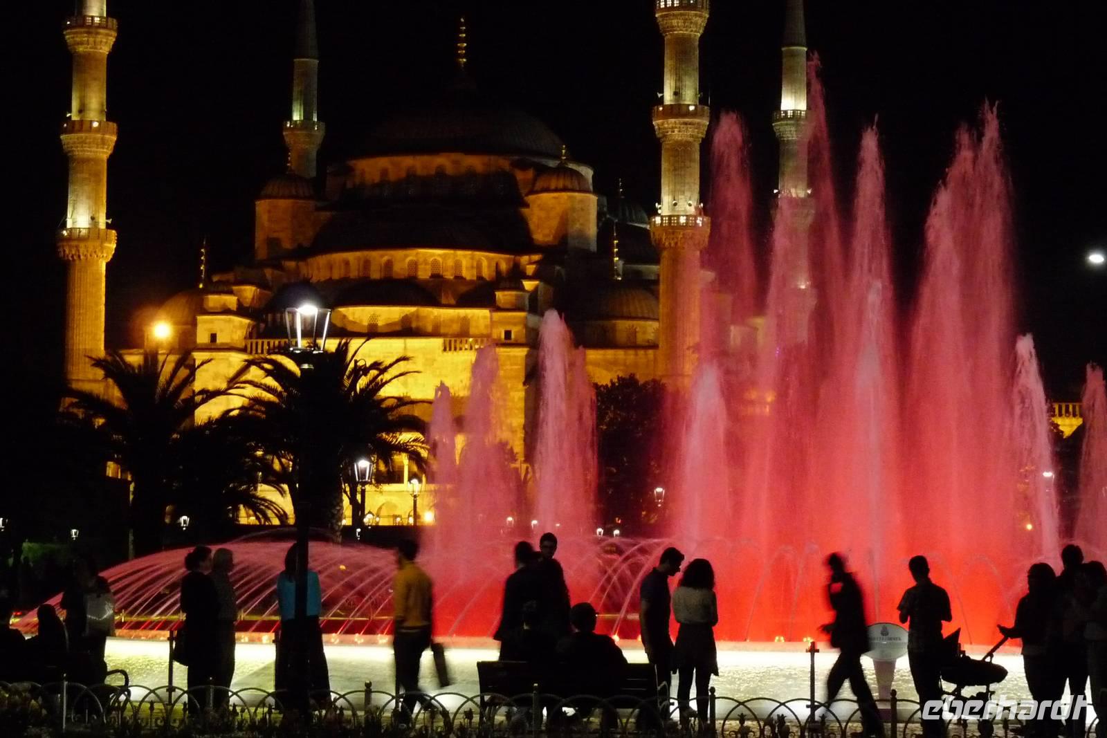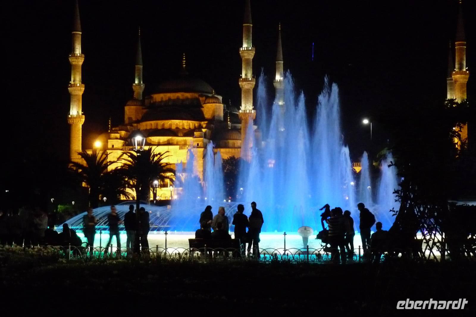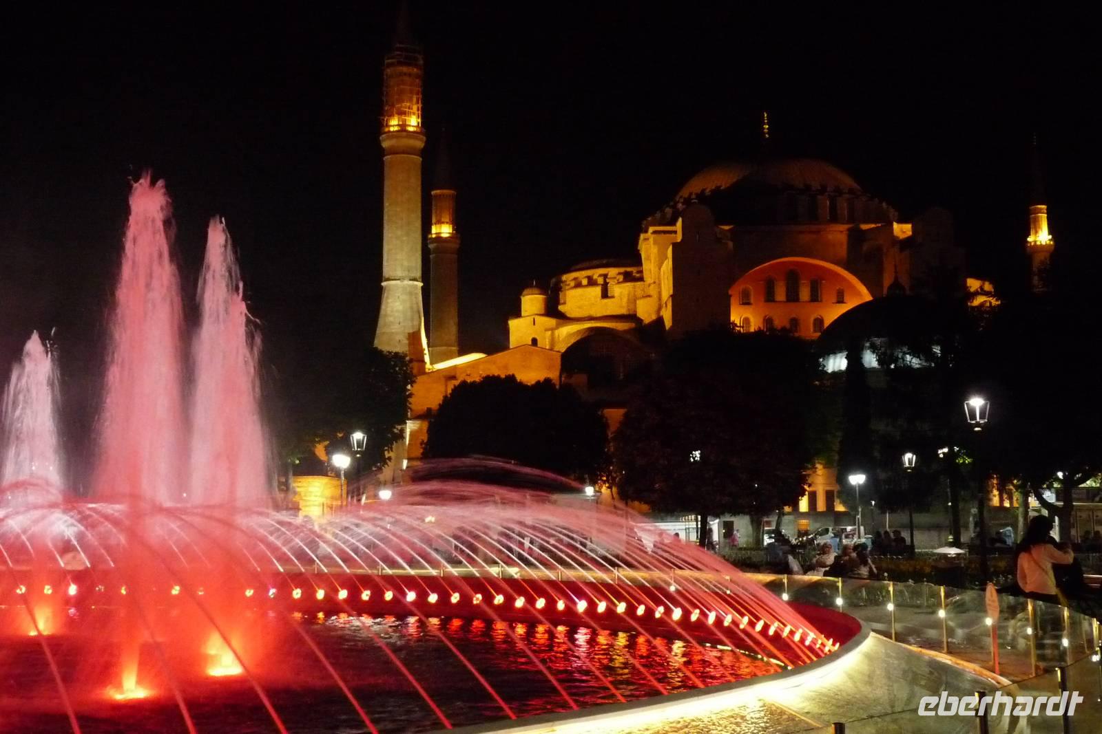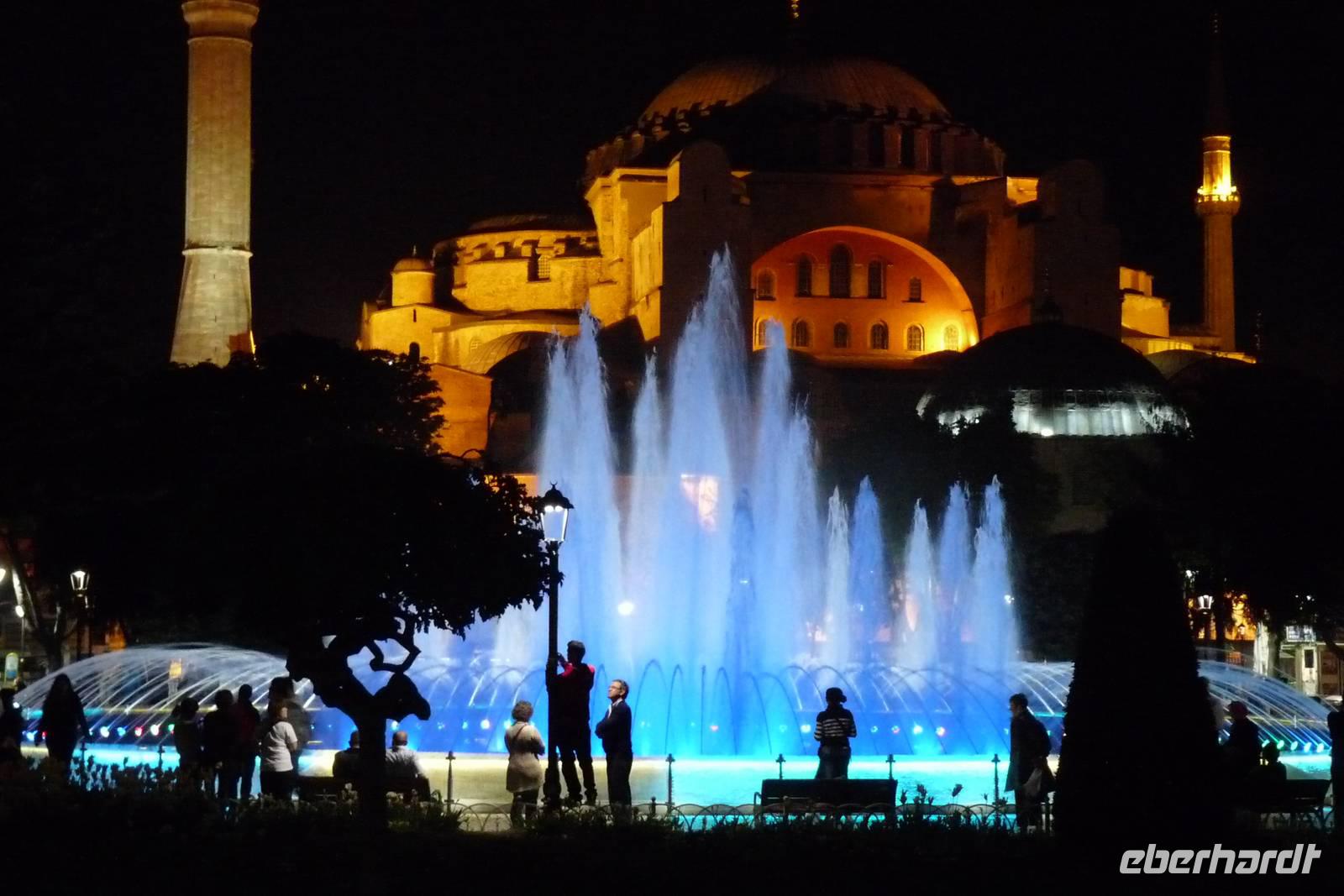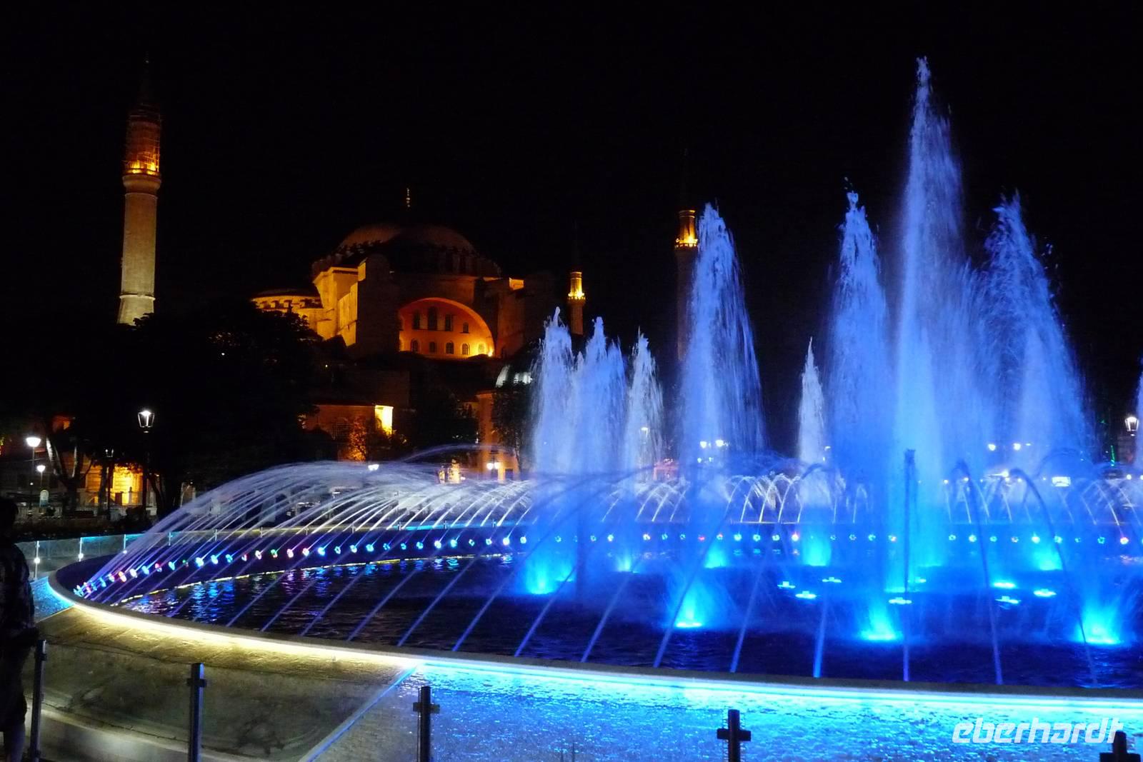 Und es geht noch weiter: zu später Stunde machen wir zuerst halt auf der Galatabrücke und anschließend zwischen Hagia Sophia und Blauer Moschee. Was für eine abendliche Kulisse: vom Springbrunnen mit seinen Farbspielen haben wir einen faszinierenden Blick auf die historischen Bauwerke.