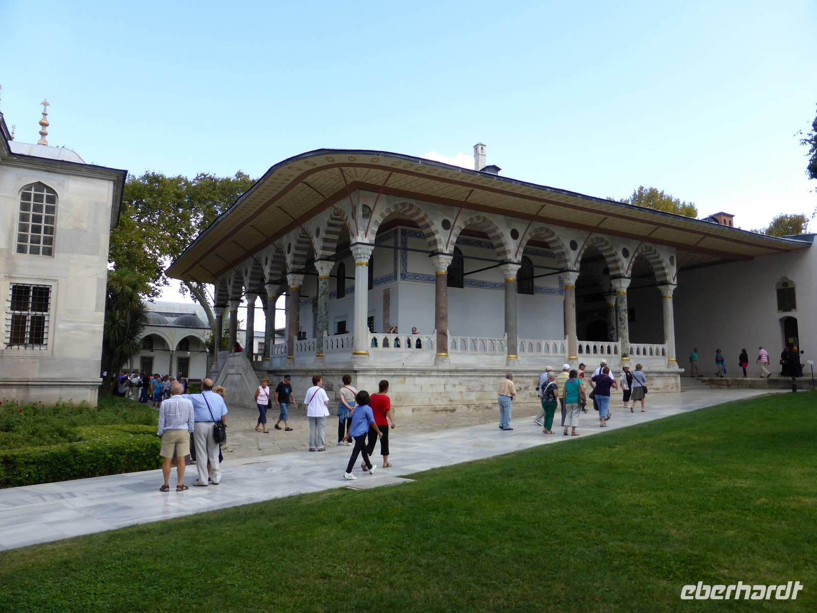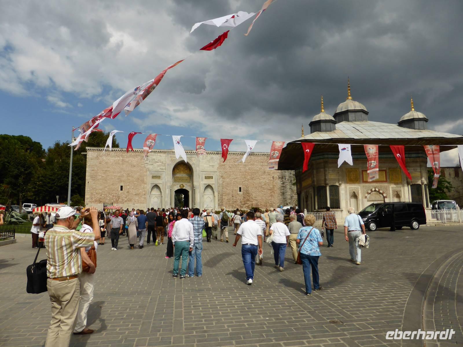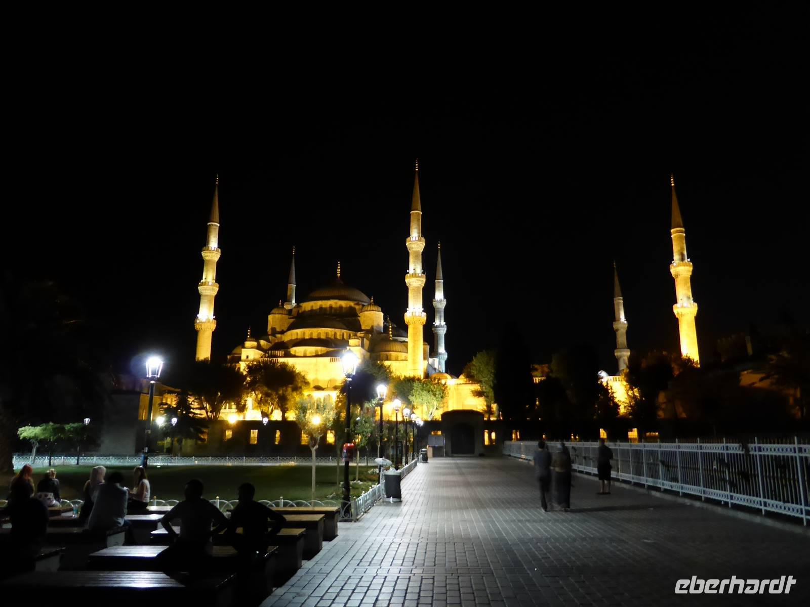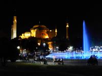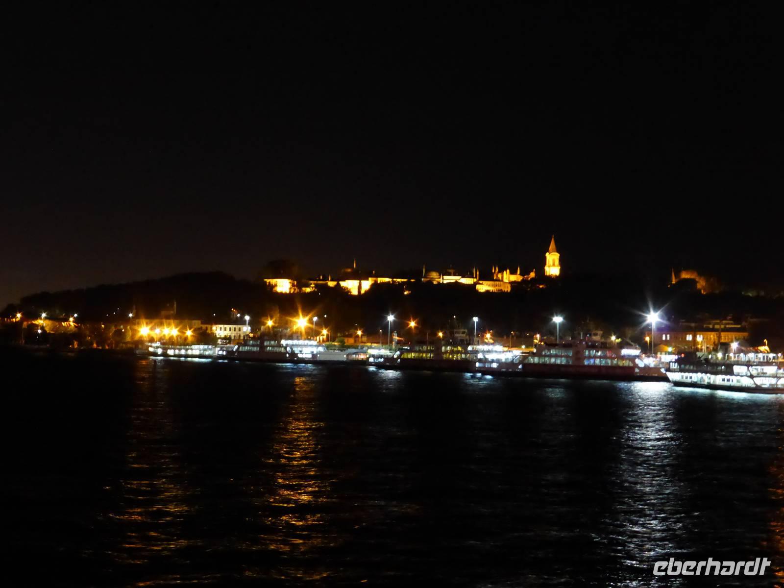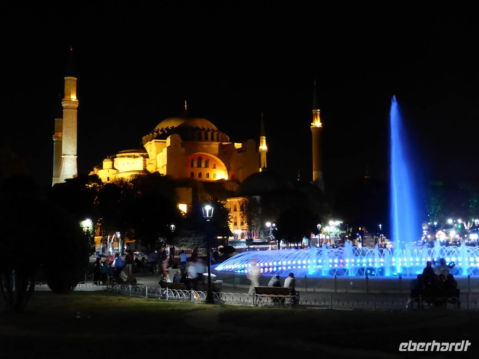 Anschließend fuhren wir mit dem Bus zur Blauen Moschee in die Altstadt. Der Name der Moschee leitet sich von den blauen Iznik-Fayencen im Inneren der Moschee ab. Im Auftrag des Sultans Ahmed I. wurde sie als Gegengewicht zur Hagia Sophia in den Jahren 1609-1616 errichtet. Getrennt durch eine Grünanlage, die Sultanahmet-Platz (-Meydani) genannt wird, befindet sich gegenüber der blauen Moschee die Hagia Sophia. Die über 1400 Jahre alte Kirche ist ein Meisterwerk frühbyzantinischer Baukunst und bis heute eines der bedeutendsten Kirchenbauwerke der Welt. Im 15. Jahrhundert wandelten die Osmanen, drei Tage nach der Eroberung der Stadt, die Kirche in eine Moschee um, sichtbar an den vier Minaretten, jedoch im Inneren befinden sich noch viele gut erhaltene Mosaiken aus der byzantinischen Zeit. Heute ist die Hagia Sophia ein Museum und es finden keine Gottesdienste mehr in ihr statt. Nicht weit entfernt befindet sich die byzantinische Zisterne (Yerebatab Sarayi), einer der damals sechs großen Wasserspeicher der Stadt. Über 300 acht Meter hohe Säulen stützen das Gewölbe der Zisterne, in die einmal ca. 100 Millionen Liter Wasser passten. Das dafür benötigte Wasser wurde über das heute noch teilweise erhaltene Valens-Aquädukt in die Stadt geführt. Nach dem Besuch der Zisterne erholten wir uns während unserer Mittagspause im „Grup Saray" Restaurant in der Nähe des Hippodroms (At Meydani), welches wir anschließend besichtigten. Diese ehemalige Pferderennbahn wurde im 3. Jahrhundert unter Kaiser Septimius Severus angelegt und fasste damals bis zu 100.000 Zuschauer. Erhalten geblieben sind der ägyptische Obelisk (ca. 1500 v.Chr.), die Schlangensäule (um 479 v.Chr.) und die Säule Konstantin VII., welche einst mit Bronzeplatten verkleidet war. Um diese drei historischen Baudenkmäler verlief die eigentliche Pferderennbahn, deren Höhe ca. drei Meter unter dem heutigen Niveau des Platzes lag. Nach der Eroberung durch die Osmanen verfiel das Hippodrom und wurde teilweise überbaut. Anschließend besuchten wir den Topkapi-Palast, die einstige Residenz der osmanischen Sultane. Sultan Mehmed II., der Eroberer Konstantinobels, ließ zwischen 1459 und 1465 die Palastanlage als seine Hauptresidenz erbauen. Hier befand sich auch der Harem des Herrschers und im Diwan fanden die Treffen der im Obersten Rat zusammentreffenden Wesire statt. Nachdem die Sultane bereits ab Mitte des 19. Jahrhunderts den Dolmabahce-Palast als Residenz wählten, wurde der Topkapi Palast 1924 in ein Museum umgewandelt. Unser Reiseleiter Serdar erzählte anschaulich von den Intrigen, welche sich im Harem abspielten, und wie der Topkapi-Palast über die Jahrhunderte sein Aussehen immer wieder veränderte. Anschließend hatten wir Zeit für die Besichtigung des Diwans (Versammlungssaal des Obersten Rates) und für die Besichtigung der Waffenkammer. Im letzten Innenhof der Palastanlage beeindruckte das Gebäude des Audienzsaales und auch hier lauschten wir den Erläuterungen Serdars, wie sich die Sultane vor unerwünschten Zuhörern schützten. Die darauf folgende Freizeit für die Besichtigung des Reliquien-Pavillons, der Kleidersammlung des Sultans und der Schatzkammer war vielen Gästen unserer Reisegruppe etwas zu knapp bemessen, so beeindruckend waren alle diese Dinge. Nach der Besichtigung der Palastanlage trafen wir uns wieder vor dem Eingang und warteten ca. eine halbe Stunde auf zwei fehlende Gäste unserer Reisegruppe, die dann später mit dem Taxi zum Hotel zurück fuhren. Am Abend nahmen 21 Gäste an der Fahrt zum Abendessen im Fisch-Restaurant „Akvaryum" im Stadtteil Kumkapi teil. Das Essen schmeckte gut und während unseres Aufenthaltes traf eine Hochzeitsgesellschaft im Restaurant ein. So wurden wir überraschend Zeugen einer türkischen Hochzeitsfeier und bestaunten den Tanz und Gesang der Hochzeitsgäste. Nach dem Essen fuhren wir mit dem Bus zum Sultanahmet-Platz, um die beleuchtete Blaue Moschee und die Hagia Sophia zu fotografieren. Anschließend ging es zurück zum Hotel.