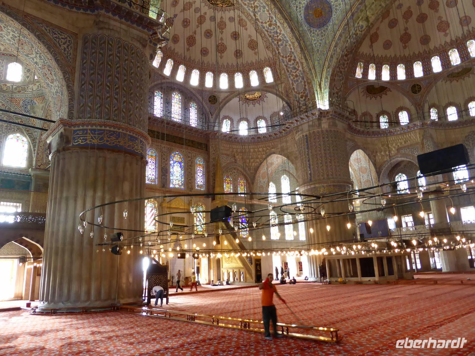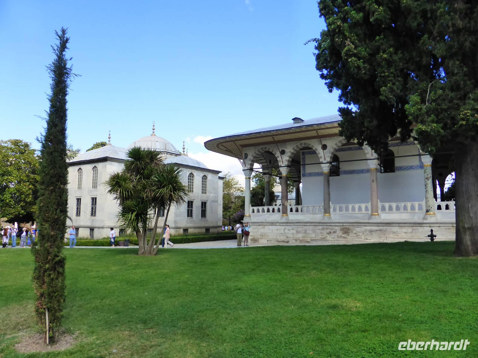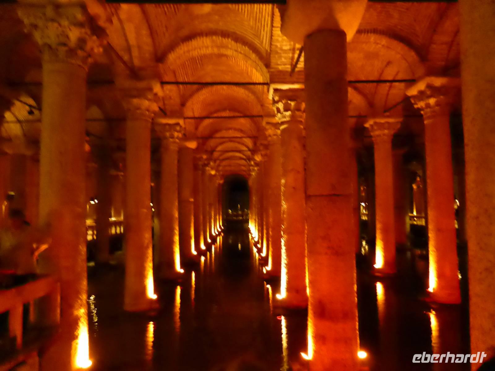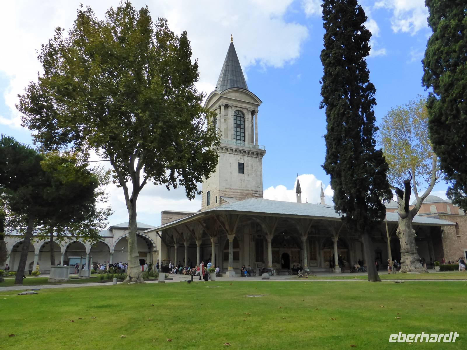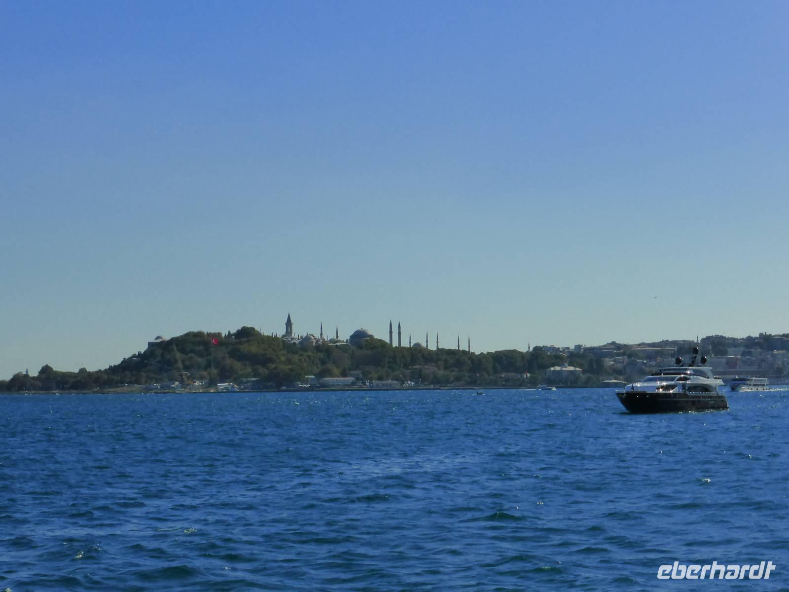 Anschließend fuhren wir mit dem Bus zur Blauen Moschee in die Altstadt. Der Name der Moschee leitet sich von den blauen Iznik-Fayencen im Inneren der Moschee ab. Im Auftrag des Sultans Ahmed I. wurde sie als Gegengewicht zur Hagia Sophia in den Jahren 1609-1616 errichtet. Getrennt durch eine Grünanlage, die Sultanahmet-Platz (-Meydani) genannt wird, befindet sich gegenüber der blauen Moschee die Hagia Sophia. Die über 1400 Jahre alte Kirche ist ein Meisterwerk frühbyzantinischer Baukunst und bis heute eines der bedeutendsten Kirchenbauwerke der Welt. Im 15. Jahrhundert wandelten die Osmanen, drei Tage nach der Eroberung der Stadt, die Kirche in eine Moschee um, sichtbar an den vier Minaretten, jedoch im Inneren befinden sich noch viele gut erhaltene Mosaiken aus der byzantinischen Zeit. Heute ist die Hagia Sophia ein Museum und es finden keine Gottesdienste mehr in ihr statt. Nicht weit entfernt befindet sich die byzantinische Zisterne (Yerebatab Sarayi), einer der damals sechs großen Wasserspeicher der Stadt. Über 300 acht Meter hohe Säulen stützen das Gewölbe der Zisterne, in die einmal ca. 100 Millionen Liter Wasser passten. Das dafür benötigte Wasser wurde über das heute noch teilweise erhaltene Valens-Aquädukt in die Stadt geführt. Nach dem Besuch der Zisterne erholten wir uns während unserer Mittagspause im „Grup Saray" Restaurant in der Nähe des Hippodroms (At Meydani), welches wir anschließend besichtigten. Diese ehemalige Pferderennbahn wurde im 3. Jahrhundert unter Kaiser Septimius Severus angelegt und fasste damals bis zu 100.000 Zuschauer. Erhalten geblieben sind der ägyptische Obelisk (ca. 1500 v.Chr.), die Schlangensäule (um 479 v.Chr.) und die Säule Konstantin VII., welche einst mit Bronzeplatten verkleidet war. Um diese drei historischen Baudenkmäler verlief die eigentliche Pferderennbahn, deren Höhe ca. drei Meter unter dem heutigen Niveau des Platzes lag. Nach der Eroberung durch die Osmanen verfiel das Hippodrom und wurde teilweise überbaut. Anschließend besuchten wir den Topkapi-Palast, die einstige Residenz der osmanischen Sultane. Sultan Mehmed II., der Eroberer Konstantinobels, ließ zwischen 1459 und 1465 die Palastanlage als seine Hauptresidenz erbauen. Hier befand sich auch der Harem des Herrschers und im Diwan fanden die Treffen der im Obersten Rat zusammentreffenden Wesire statt. Nachdem die Sultane bereits ab Mitte des 19. Jahrhunderts den Dolmabahce-Palast als Residenz wählten, wurde der Topkapi Palast 1924 in ein Museum umgewandelt. Unser Reiseleiter Serdar erzählte anschaulich von den Intrigen, welche sich im Harem abspielten, und wie der Topkapi-Palast über die Jahrhunderte sein Aussehen immer wieder veränderte. Anschließend hatten wir Zeit für die Besichtigung des Diwans (Versammlungssaal des Obersten Rates) und für die Besichtigung der Waffenkammer. Im letzten Innenhof der Palastanlage beeindruckte das Gebäude des Audienzsaales und auch hier lauschten wir den Erläuterungen Serdars, wie sich die Sultane vor unerwünschten Zuhörern schützten. Die darauf folgende Freizeit für die Besichtigung des Reliquien-Pavillons, der Kleidersammlung des Sultans und der Schatzkammer war vielen Gästen unserer Reisegruppe etwas zu knapp bemessen, so beeindruckend waren alle diese Dinge. Nach der Besichtigung der Palastanlage trafen wir uns wieder vor dem Eingang und warteten ca. eine halbe Stunde auf zwei fehlende Gäste unserer Reisegruppe, die dann später mit dem Taxi zum Hotel zurück fuhren. Am Abend nahmen 21 Gäste an der Fahrt zum Abendessen im Fisch-Restaurant „Akvaryum" im Stadtteil Kumkapi teil. Das Essen schmeckte gut und während unseres Aufenthaltes traf eine Hochzeitsgesellschaft im Restaurant ein. So wurden wir überraschend Zeugen einer türkischen Hochzeitsfeier und bestaunten den Tanz und Gesang der Hochzeitsgäste. Nach dem Essen fuhren wir mit dem Bus zum Sultanahmet-Platz, um die beleuchtete Blaue Moschee und die Hagia Sophia zu fotografieren. Anschließend ging es zurück zum Hotel.