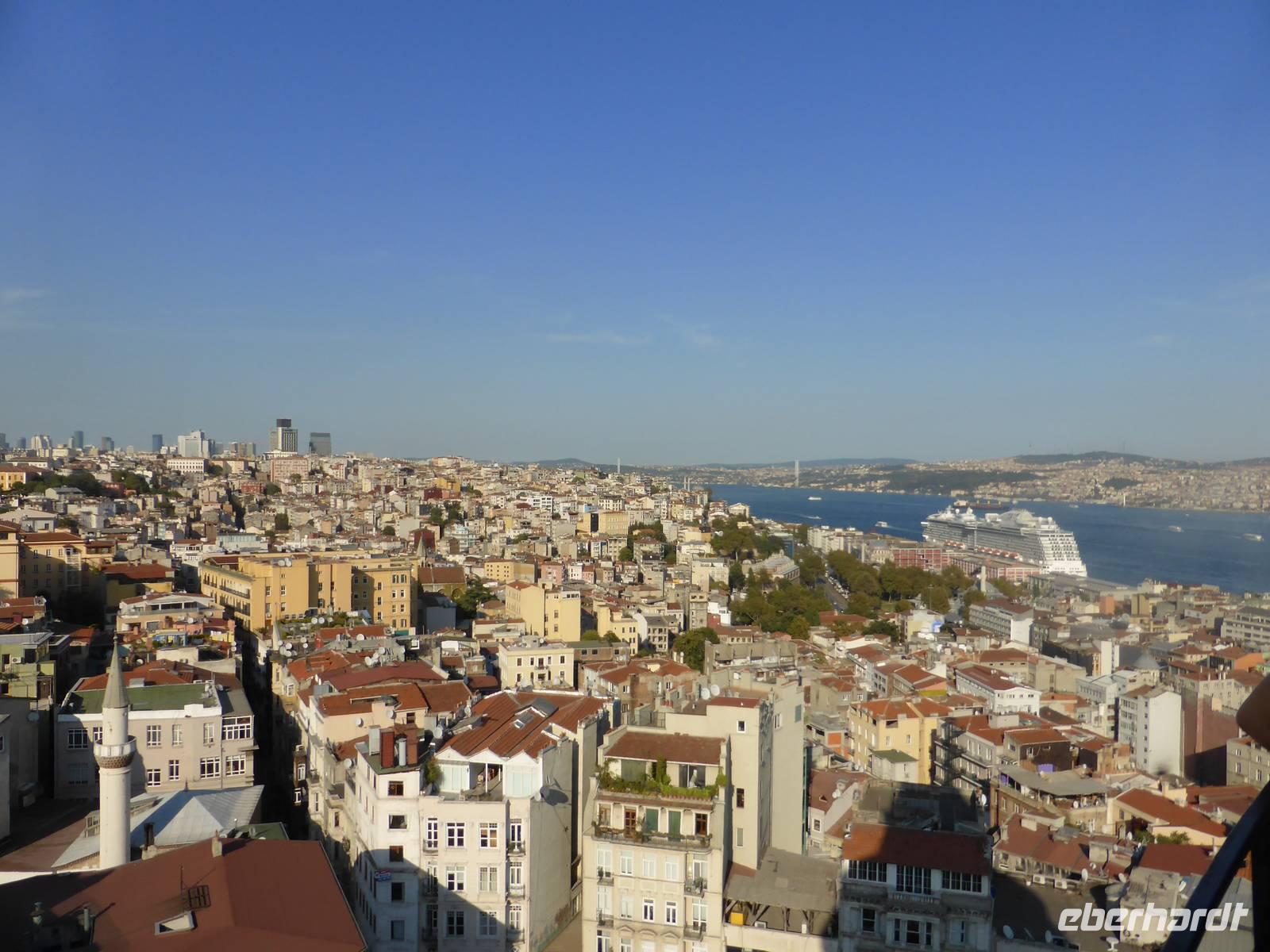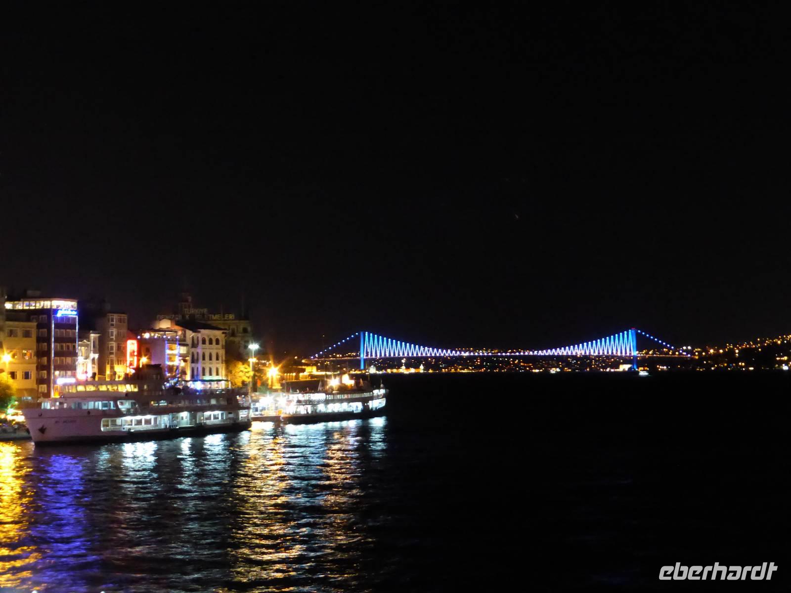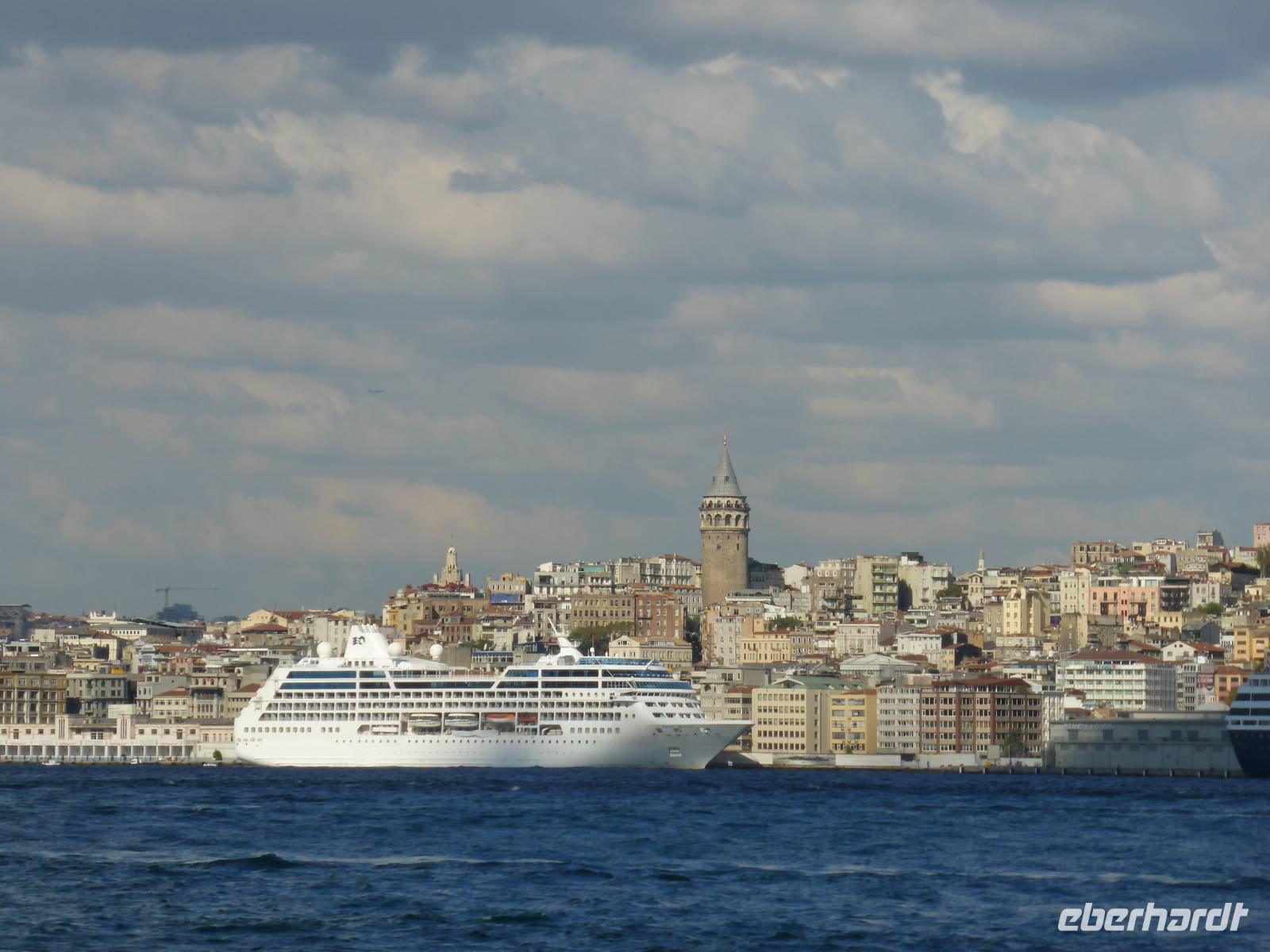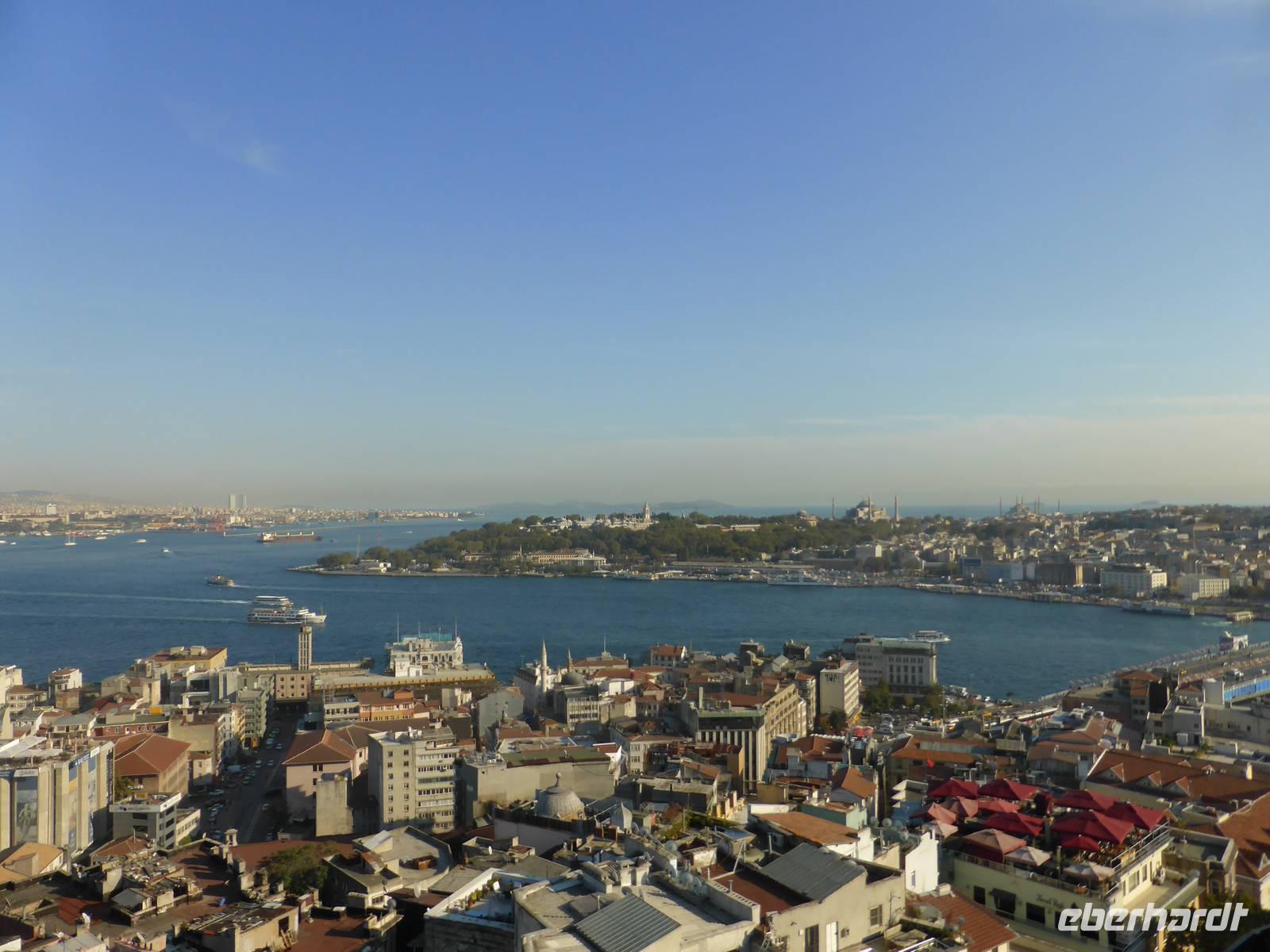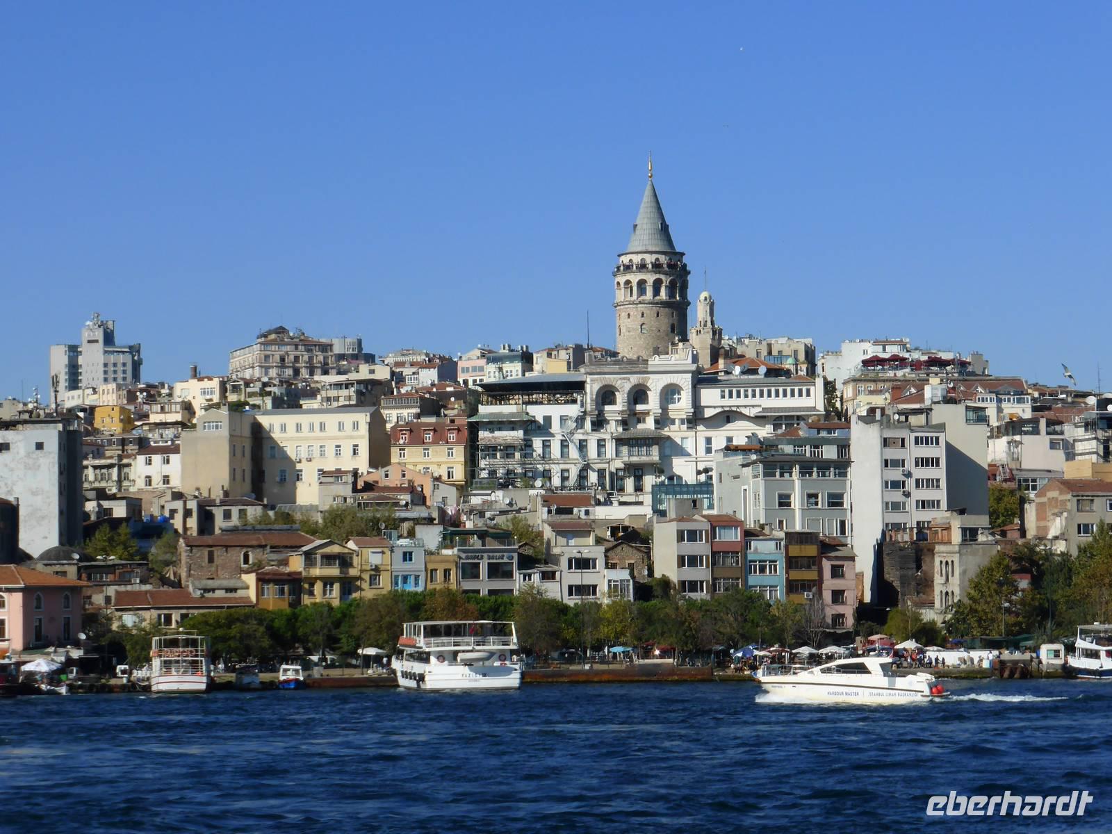 Von der Erlöserkirche, welche heute ein Museum ist, fuhren wir weiter zur 6,5 Kilometer langen Thedosianischen Landmauer, an der wir für einen Fotostopp anhielten. Diese doppelte Stadtmauer zwischen Marmarameer und Goldenen Horn ist noch in großen Teilen erhalten und wurde teilweise restauriert. Ursprünglich bestand sie aus 192 Türmen und mehreren Toren. Sie wurde unter Kaiser Theodosius II. zwischen 412-422 (n.Chr.) errichtet und erst im Jahre 1453 durch Mehmed II. überwunden. Am Marmarameer endet die Mauer in der Yedikule Festung, einer gewaltigen Festungsanlage, die ebenfalls aus dem 5. Jahrhundert stammt und in späterer Zeit mehrfach umgestaltet wurde. Von der Landmauer fuhren wir zum Schmuckgeschäft „Storks". Bei einem Getränk wurde uns die Firmengeschichte und das seriöse Auftreten des Unternehmens erläutert und anschließend bestand Gelegenheit, sich über die angebotenen Schmuckwaren zu informieren. Unser Mittagessen nahmen wir in der Nähe des „Goldenen Horns" im Kebab-Restaurant „Sultani" ein. Das Essen war gut, so dass wir uns danach auf den Weg zur Eyüb Moschee machen konnten. Eyüb Ensaru war der Bannerträger des Propheten und im Innenhof der Moschee befindet sich sein Grab. Die Moschee wurde fünf Jahre nach der Einnahme der Stadt durch die Osmanen unter Mehmed II. errichtet und ist die wichtigste Moschee in Istanbul. Ihr heutiges Aussehen erhielt sie allerdings erst unter Selim II. im 18. Jahrhundert. Von der Moschee gingen wir zur Talstation der Kabinenbahn, welche hoch zum Cafe Pierre Loti führt. Nach einer halbstündigen Wartezeit fuhren wir hinauf zur Bergstation und genossen den grandiosen Blick auf das Goldene Horn, die Neustadt und die Altstadt bei einem Glas Tee. Anschließend verabredeten wir uns zum gemeinsamen Gruppenbild auf der Aussichtsplattform vor dem Cafe und fuhren danach über das Goldene Horn hinüber in die Neustadt. Unser Ziel war der Galata-Turm, zu welchem es nach dem Ausstieg ein kurzer Spaziergang war. Er zählt zu den ältesten Türmen der Stadt und sein heutiges Aussehen erhielt er nach einem Umbau durch die Genuesen im Jahre 1348. Diese hatten im Jahre 1261 den byzantinischen Kaiser geholfen nach Konstantinopel zurückzukehren, nachdem sich die Regenten nach dem 4. Kreuzzug aus der Stadt nach Nicäa zurückgezogen hatten. Zum Dank wurde den Genuesen gestattet eine Handelsniederlassung aufzubauen, in deren Mitte sich auch der ursprüngliche Galata-Turm befand. Am Turm angekommen, fuhren wir mit dem Aufzug bis in den 7. Stock und von dort stiegen wir die zwei Stockwerke bis zur Aussichtsplattform hinauf. Es war ein atemberaubender Blick über Neu- und Altstadt, über das Goldene Horn, den Bosporus und sogar bis zum asiatischen Teil Istanbuls und zu den Prinzeninseln. Anschließend fuhren wir mit dem Bus zu unserem Hotel zurück. Nach einer Pause begaben wir uns dann zum Abendessen ins Nachtlokal „Karvansaray". Hier findet jeden Abend eine der faszinierendsten Shows Istanbuls statt. Die Musikgruppe spielte bereits, während wir den Veranstaltungsort betraten. Der Saal füllte sich mit immer neuen Reisegruppen, bis am Ende keine einziger Platz mehr frei war. Schon beim Essen begann die Show. Zuerst kam eine Bauchtänzerin, danach eine Folkloregruppe vom Schwarzen Meer. Im Verlaufe des Abends folgten dann weitere Bauchtänzerinnen, darunter die beste der Türkei, eine Trachtengruppe mit Messerakrobatik und Feuerwerfer sowie ein Entertainer, der die Stimmung unter den einzelnen Nationalitäten so richtig anheizte. Am Ende bat er eine Gruppe aus Brasilien auf der Tanzfläche Samba zu tanzen und verschwand. So fand der Tag ein stimmungsvolles Ende.