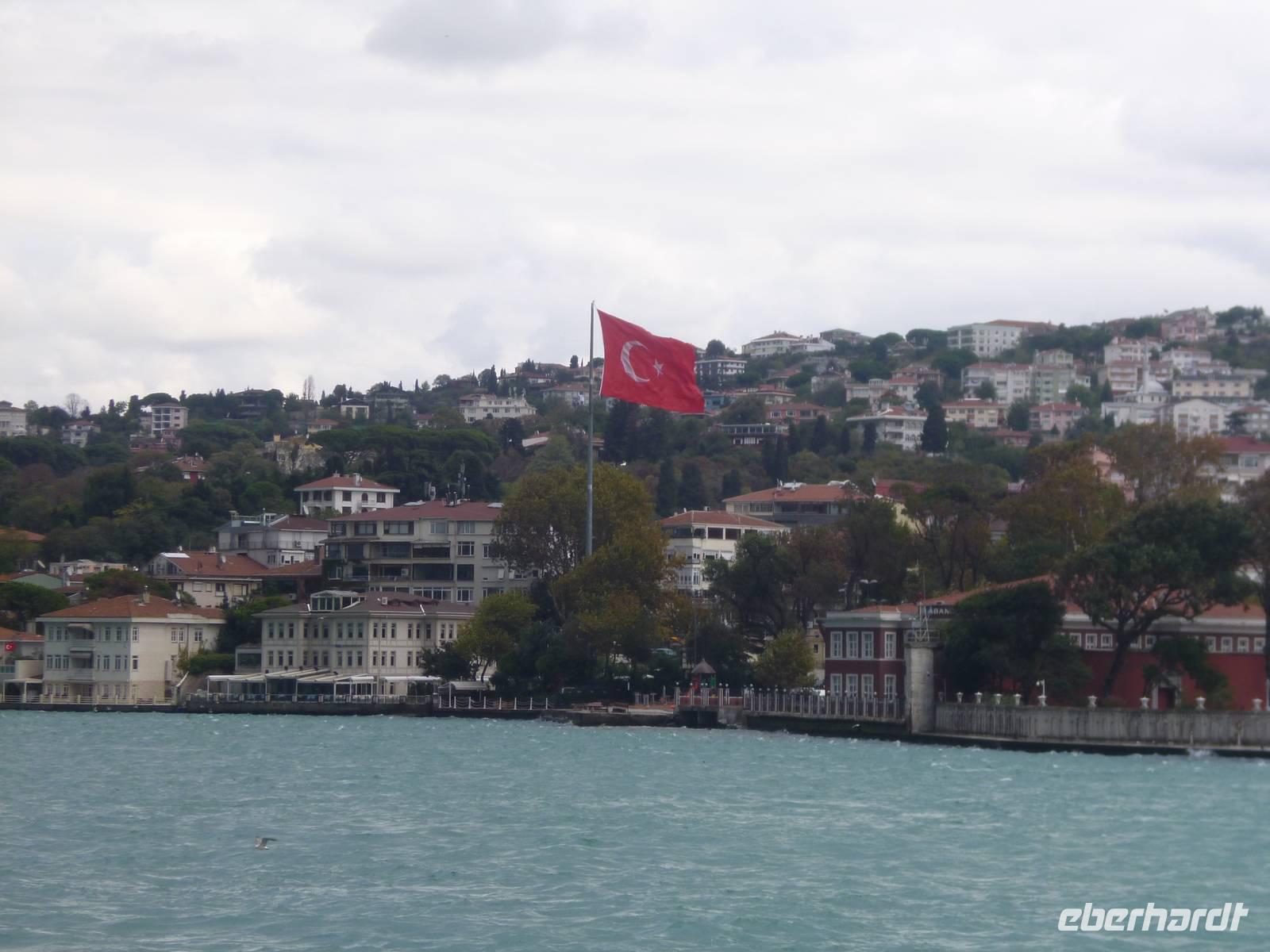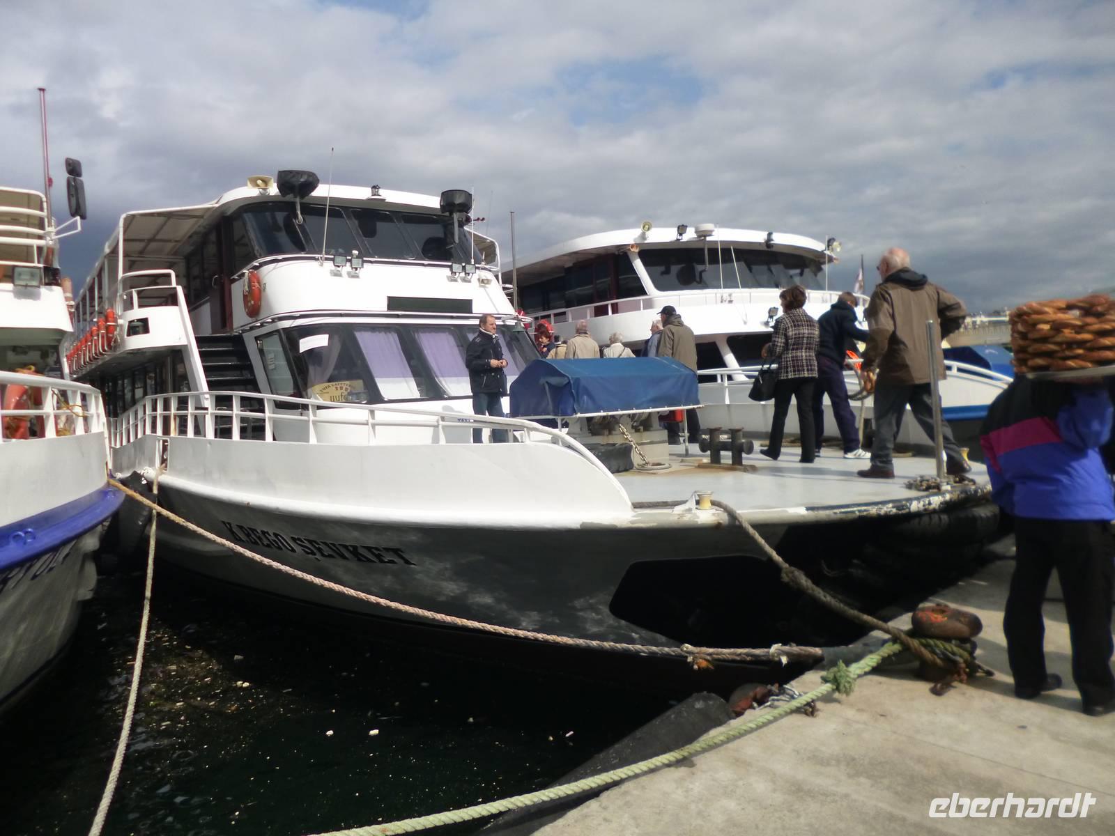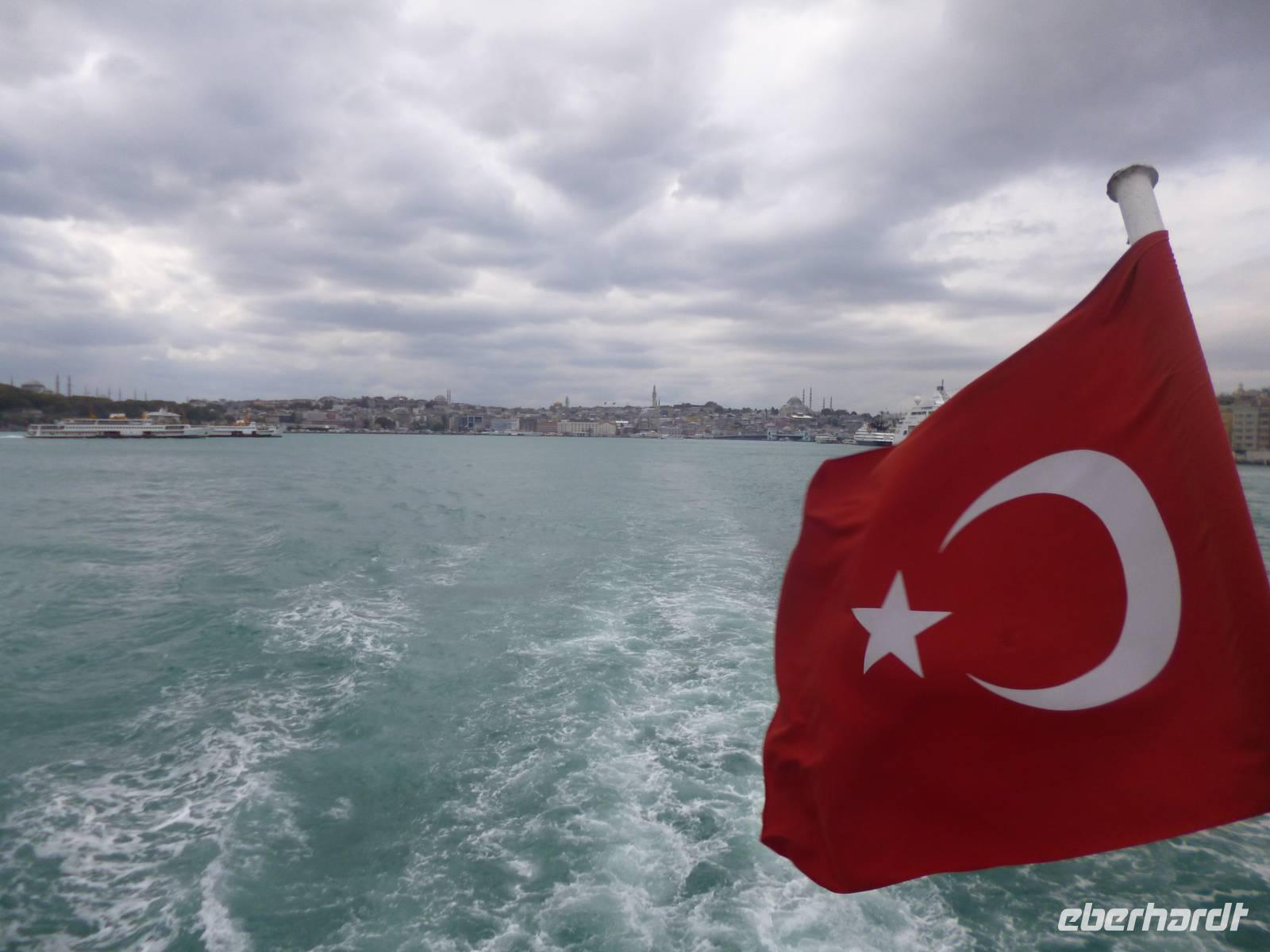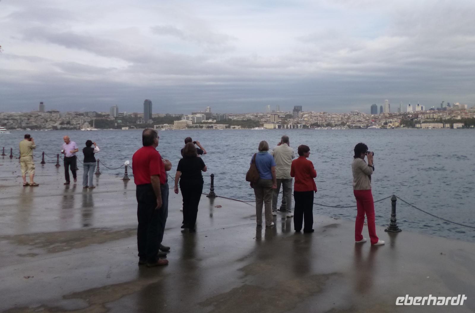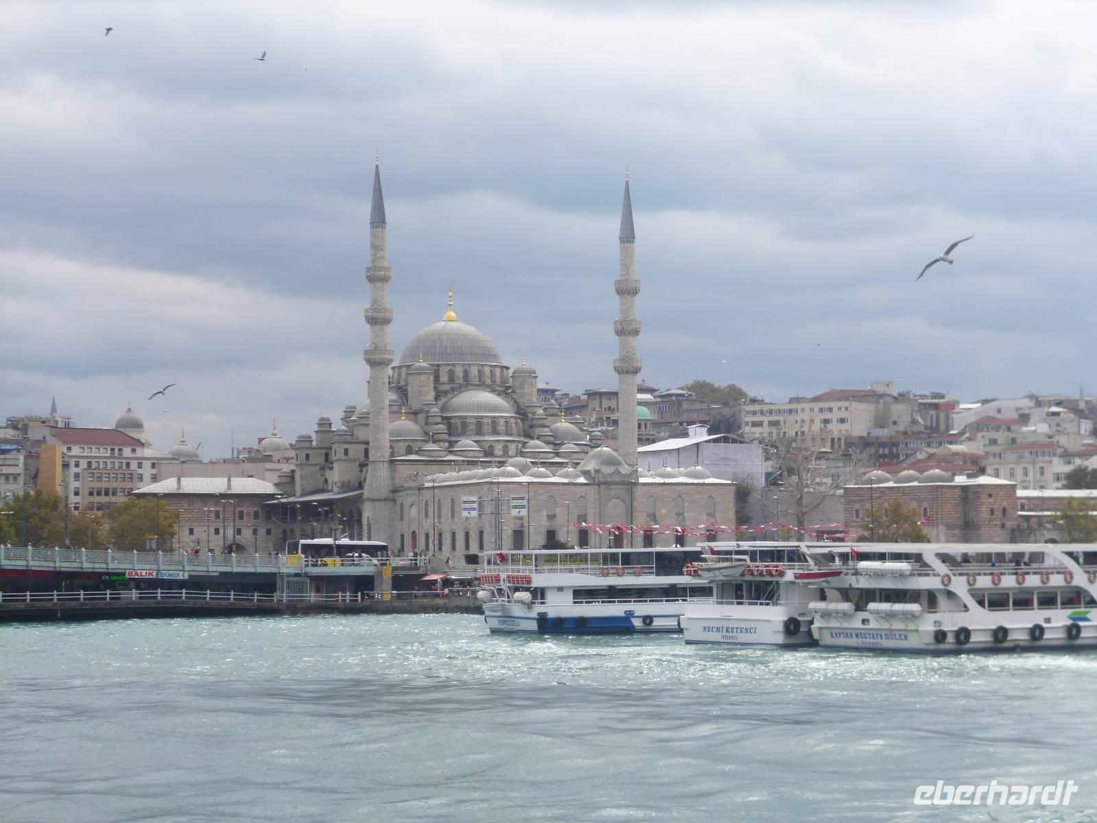 Heute zeigt sich sogar die Sonne, was noch einmal ein anderes Licht auf die Stadt wirft. Am Vormittag besuchen wir die Chora-Kirche, die um 1320 erbaut wurde und ursprünglich Teil eines im 6. Jh. gegründeten Klosters war. Heute ist sie ein Museum, in dem prächtige byzantinische Kirchenmosaiken zu bestaunen sind. Entlang der Stadtmauer fahren wir zum Schmuckgeschäft Storcks. Das Angebot reicht von Kettenanhänger, und Kettchen über Broschen, Armreifen, Ringe und Ohrringe. Wir schauen uns kurz um und lassen uns gleich im Anschluss von Ahmed zum Schiffsanleger bringen. Wir sind nämlich für eine Bootsfahrt auf dem Bosporus verabredet. Die Meerenge zwischen Europa und Kleinasien, die das Schwarze Meer mit dem Marmarameer verbindet, gilt als eine der weltweit wichtigsten Wasserstraßen. Bisher gibt es zwei Hängebrücken, die Europa und Asien verbinden. An der engsten Stelle befindet sich mittlerweile eine dritte Brücke trotz heftiger Proteste vieler Umweltschützer im Bau. Wir lassen die Neu- und Altstadt hinter uns. Serdar kommentiert die Bootsfahrt. Wir erhalten ein ganz anderes Bild der Metropole. Prächtige Villen und kleine Ferienhäuser mit Swimmingpool im Garten säumen die Ufer. Die Festungsanlage Rumeli Hisari, die in nur 4 Monaten gebaut wurde, den Dolmabahce-Palast und Çiragan-Palast sehen wir vom Schiff aus. Nach 90 Minuten haben wir wieder festen Boden unter den Füßen. Mit Blick auf den Bosporus lassen wir uns das Mittagessen schmecken. Zur Verdauung gibt es Raki. Natürlich nur einen Schluck, denn noch haben wir unser Programm für heute nicht geschafft. Zurück in der Stadt geht's mit der Seilbahn hinauf auf den Pierre-Loti-Hügel, benannt nach dem französischen Marineoffizier und Schriftsteller Pierre Loti, der hier oft zu Gast war. Und wieder liegt uns die Stadt zu Füßen, wieder ein beeindruckender Ausblick. Nach ein wenig Zeit, um die Aussicht zu genießen, spazieren wir gemeinsam zurück über den Friedhof ins Tal. Am Fuße des Hügels befindet sich die Eyüp Camii oder auch Eyüp-Sultan-Moschee, die heiligste Moschee Istanbuls. Hier befinden sich die Reliquien des Fahnenträgers von Mohammed. Nachdem wir die Hagia Sophia und Blaue Moschee als eher touristische Sehenswürdigkeiten kennengelernt haben, werden wir in dieser Moschee von der ganz besonderen Atmosphäre eingenommen. Auch hier müssen wir uns an die Kleiderordnung halten. Zum Abschluss lächeln wir vor der Eyüp-Sultan-Moschee für unser Gruppenfoto, denn dieses war unser letzter „offizieller" Programmpunkt. Für diejenigen, die das heutige Abendessen dazu gebucht haben, geht die „Show" weiter, bzw. erst so richtig los. Im Nachtlokal „Kervansaray" werden wir während eines köstlichen 5-Gang-Menus von attraktiven Bauchtänzerinnen, Folkloregruppen und einem internationalen Sänger abwechslungsreich unterhalten. Stimmungsvoll lassen wir den Abend und Aufenthalt in der Metropole Istanbul ausklingen.