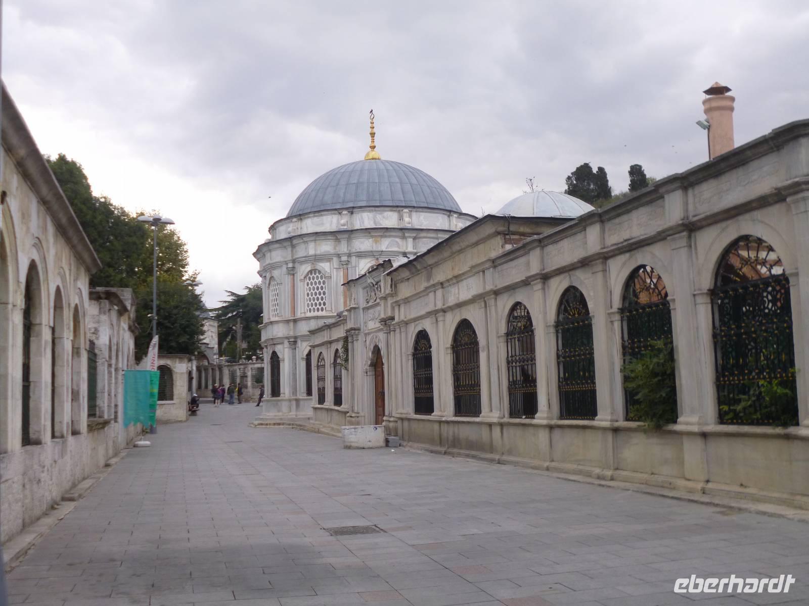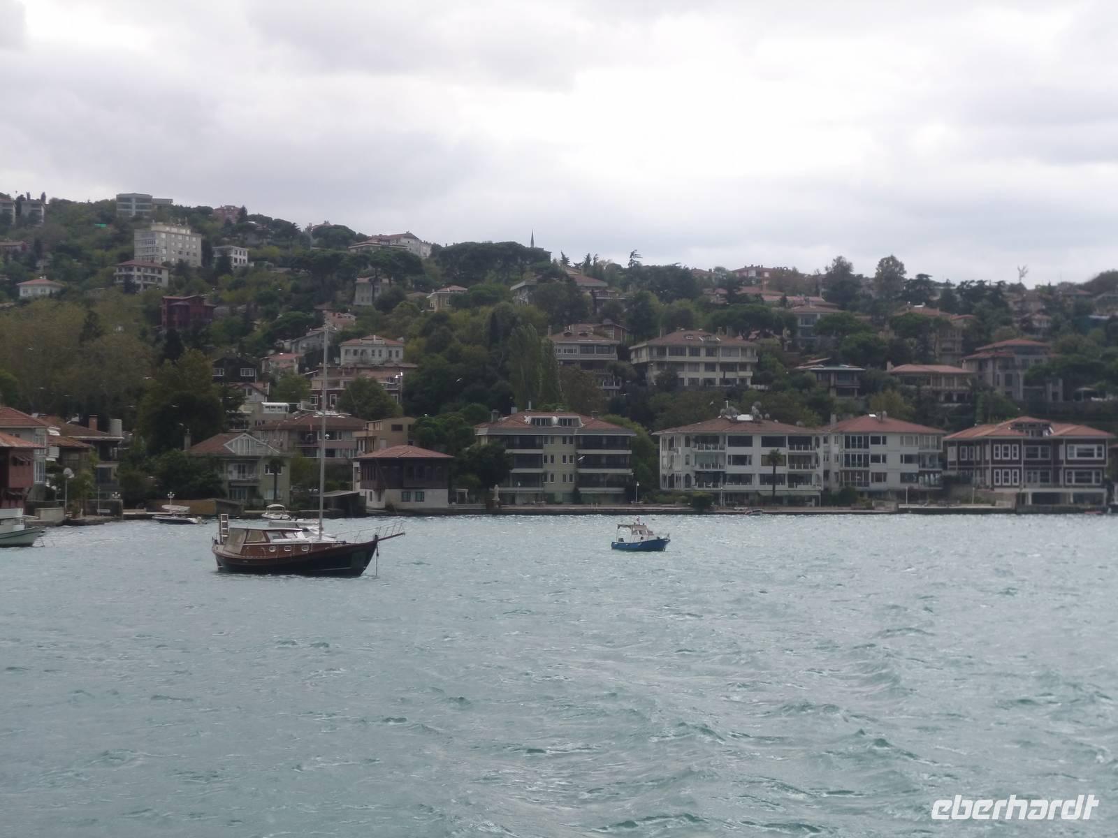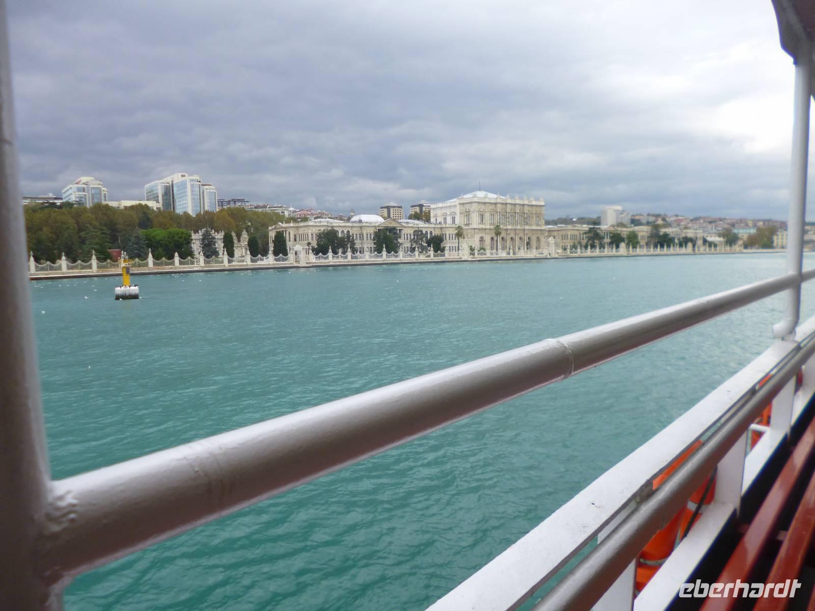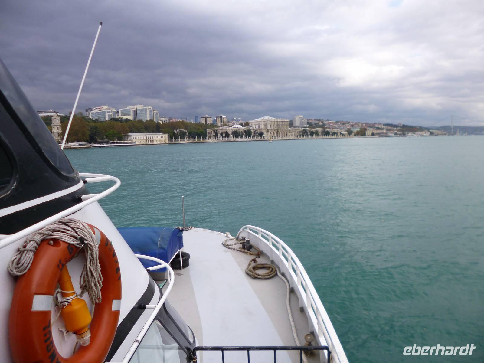 Heute zeigt sich sogar die Sonne, was noch einmal ein anderes Licht auf die Stadt wirft. Am Vormittag besuchen wir die Chora-Kirche, die um 1320 erbaut wurde und ursprünglich Teil eines im 6. Jh. gegründeten Klosters war. Heute ist sie ein Museum, in dem prächtige byzantinische Kirchenmosaiken zu bestaunen sind. Entlang der Stadtmauer fahren wir zum Schmuckgeschäft Storcks. Das Angebot reicht von Kettenanhänger, und Kettchen über Broschen, Armreifen, Ringe und Ohrringe. Wir schauen uns kurz um und lassen uns gleich im Anschluss von Ahmed zum Schiffsanleger bringen. Wir sind nämlich für eine Bootsfahrt auf dem Bosporus verabredet. Die Meerenge zwischen Europa und Kleinasien, die das Schwarze Meer mit dem Marmarameer verbindet, gilt als eine der weltweit wichtigsten Wasserstraßen. Bisher gibt es zwei Hängebrücken, die Europa und Asien verbinden. An der engsten Stelle befindet sich mittlerweile eine dritte Brücke trotz heftiger Proteste vieler Umweltschützer im Bau. Wir lassen die Neu- und Altstadt hinter uns. Serdar kommentiert die Bootsfahrt. Wir erhalten ein ganz anderes Bild der Metropole. Prächtige Villen und kleine Ferienhäuser mit Swimmingpool im Garten säumen die Ufer. Die Festungsanlage Rumeli Hisari, die in nur 4 Monaten gebaut wurde, den Dolmabahce-Palast und Çiragan-Palast sehen wir vom Schiff aus. Nach 90 Minuten haben wir wieder festen Boden unter den Füßen. Mit Blick auf den Bosporus lassen wir uns das Mittagessen schmecken. Zur Verdauung gibt es Raki. Natürlich nur einen Schluck, denn noch haben wir unser Programm für heute nicht geschafft. Zurück in der Stadt geht's mit der Seilbahn hinauf auf den Pierre-Loti-Hügel, benannt nach dem französischen Marineoffizier und Schriftsteller Pierre Loti, der hier oft zu Gast war. Und wieder liegt uns die Stadt zu Füßen, wieder ein beeindruckender Ausblick. Nach ein wenig Zeit, um die Aussicht zu genießen, spazieren wir gemeinsam zurück über den Friedhof ins Tal. Am Fuße des Hügels befindet sich die Eyüp Camii oder auch Eyüp-Sultan-Moschee, die heiligste Moschee Istanbuls. Hier befinden sich die Reliquien des Fahnenträgers von Mohammed. Nachdem wir die Hagia Sophia und Blaue Moschee als eher touristische Sehenswürdigkeiten kennengelernt haben, werden wir in dieser Moschee von der ganz besonderen Atmosphäre eingenommen. Auch hier müssen wir uns an die Kleiderordnung halten. Zum Abschluss lächeln wir vor der Eyüp-Sultan-Moschee für unser Gruppenfoto, denn dieses war unser letzter „offizieller" Programmpunkt. Für diejenigen, die das heutige Abendessen dazu gebucht haben, geht die „Show" weiter, bzw. erst so richtig los. Im Nachtlokal „Kervansaray" werden wir während eines köstlichen 5-Gang-Menus von attraktiven Bauchtänzerinnen, Folkloregruppen und einem internationalen Sänger abwechslungsreich unterhalten. Stimmungsvoll lassen wir den Abend und Aufenthalt in der Metropole Istanbul ausklingen.