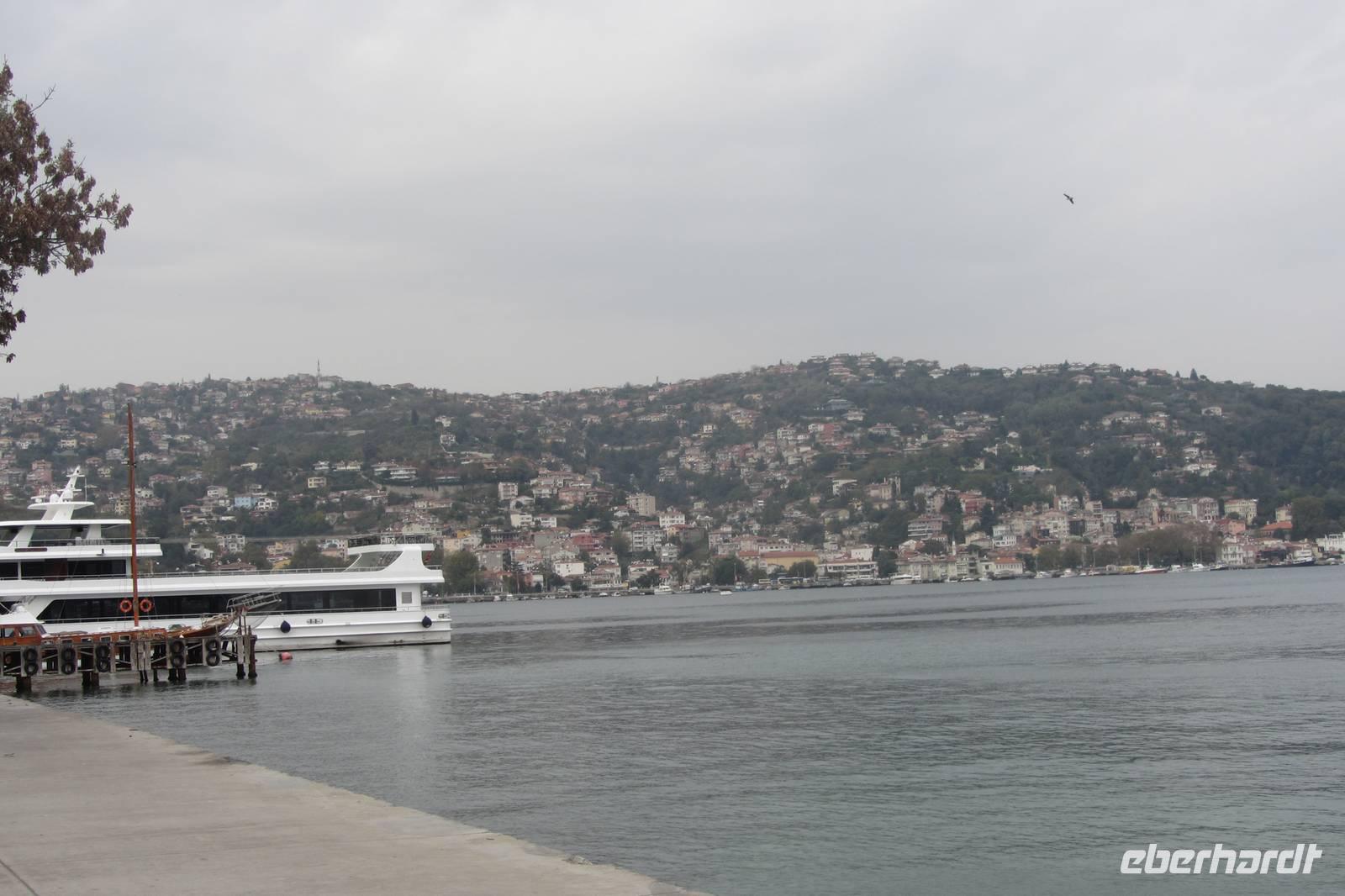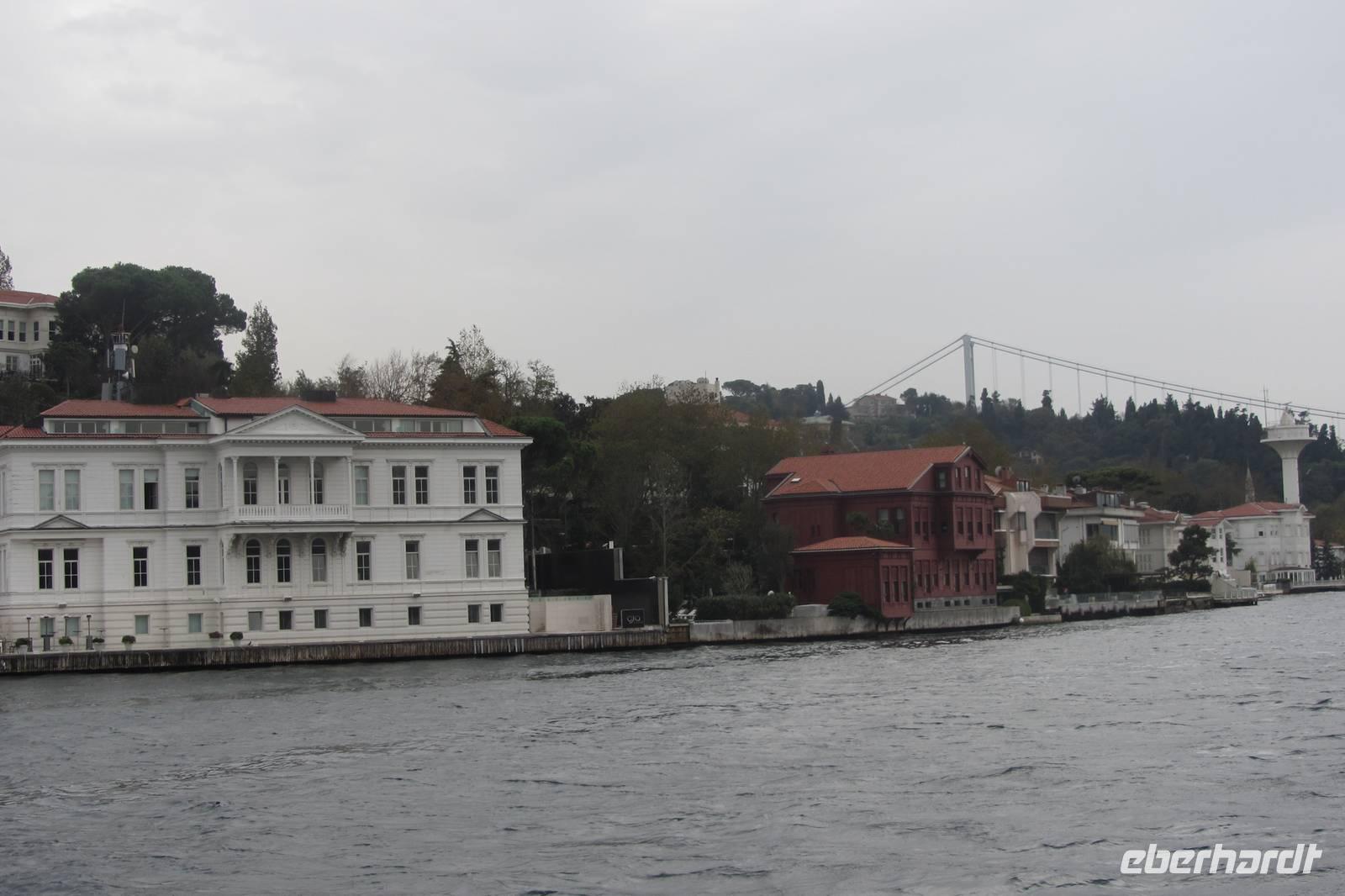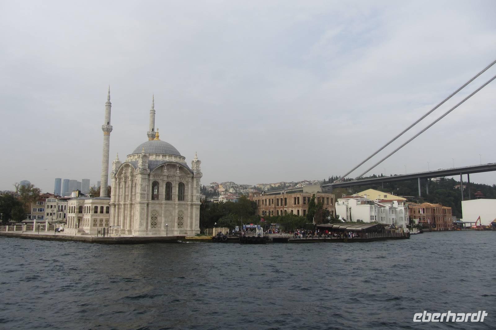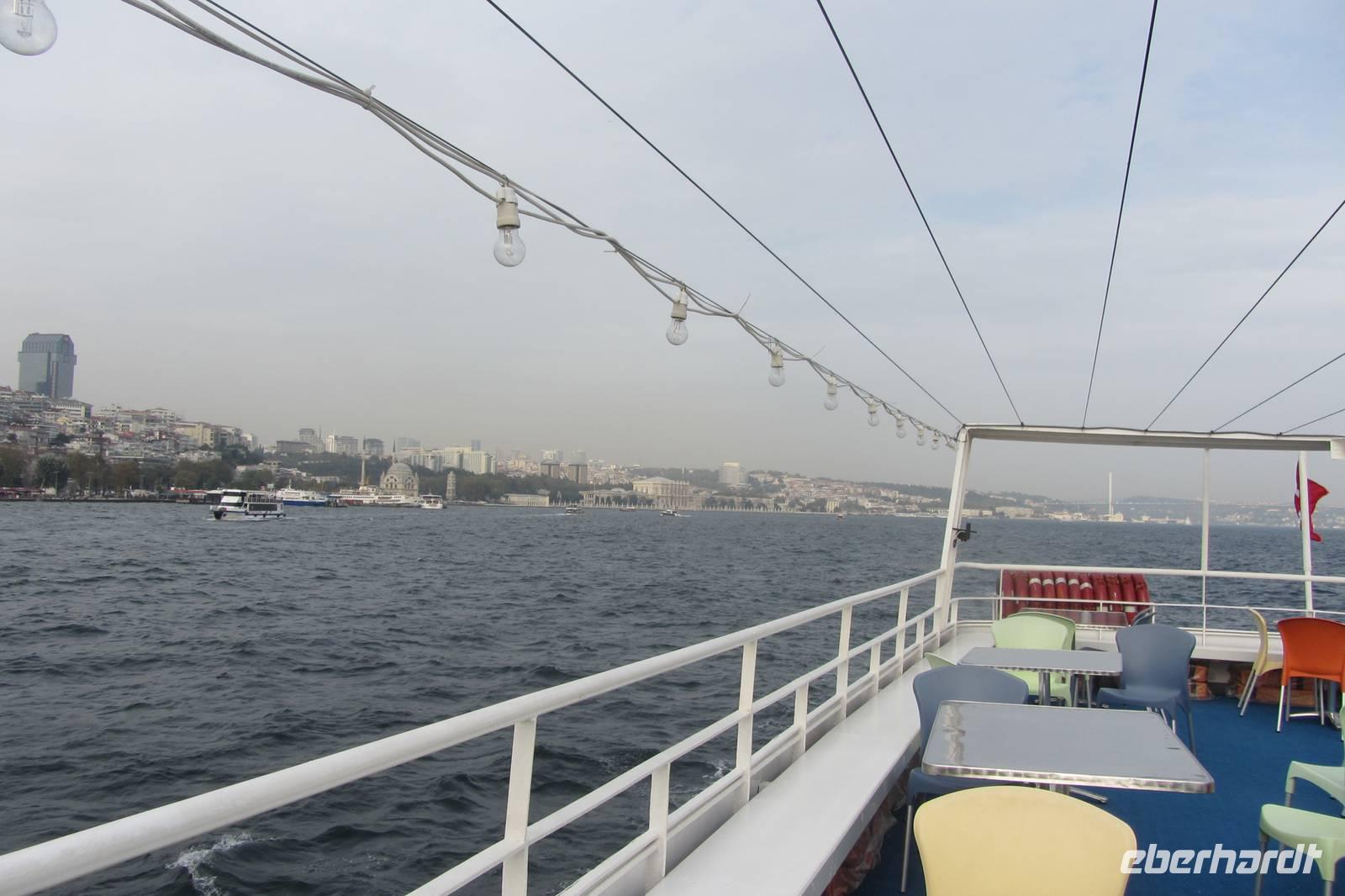 Nach einer urigen Mittagspause in einem kleinen Fischerdorf wartet nun eine Bootsfahrt auf dem Bosporus auf uns. Die Meerenge zwischen Europa und Kleinasien, die das Schwarze Meer mit dem Marmarameer verbindet, gilt als eine der weltweit wichtigsten Wasserstraßen. Wir schippern auf unserem Boot, was wir nur für uns haben, ca. 2 Stunden entlang der Stadt. Wir genießen türkisches Gebäck und Kaffee oder Tee und natürlich die Ausblicke. Wir durchqueren die imposanten Brücken und lassen die Neu- und Altstadt hinter uns. Serdar kommentiert die Bootsfahrt. Wir erhalten ein ganz anderes Bild der Metropole. Prächtige Villen und kleine Ferienhäuser mit Swimmingpool im Garten säumen die Ufer. Die Festungsanlage Rumeli Hisari, die in nur 4 Monaten gebaut wurde, den Dolmabahce-Palast und Çiragan-Palast sehen wir vom Schiff aus.