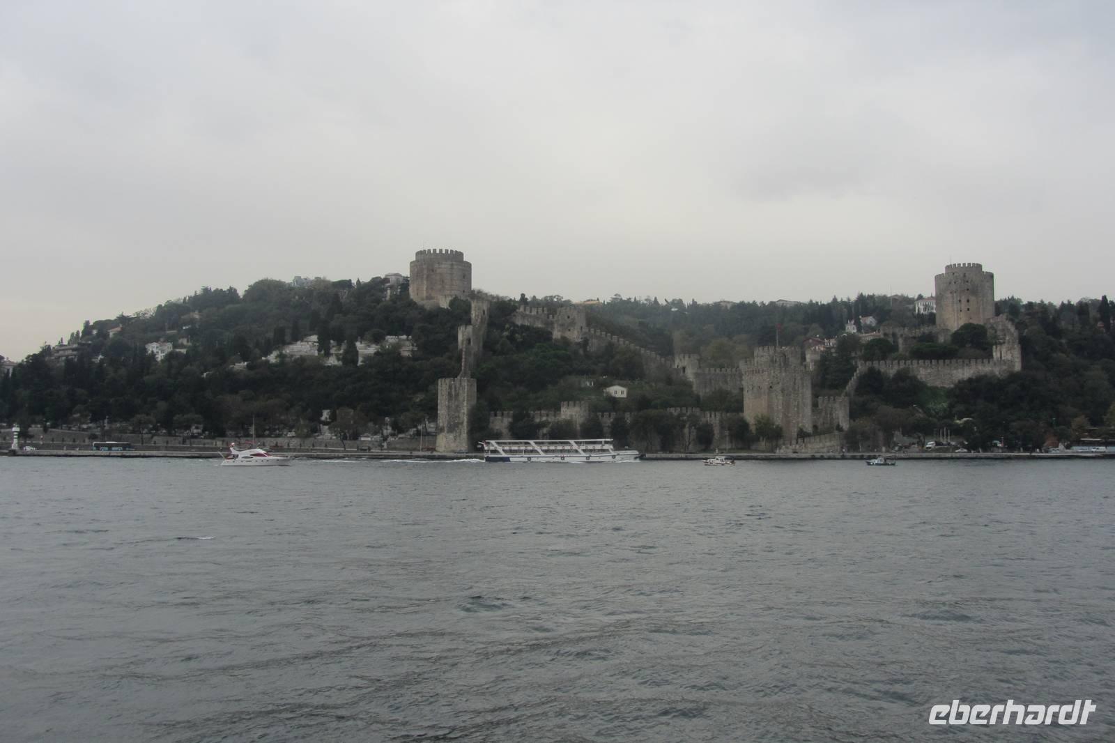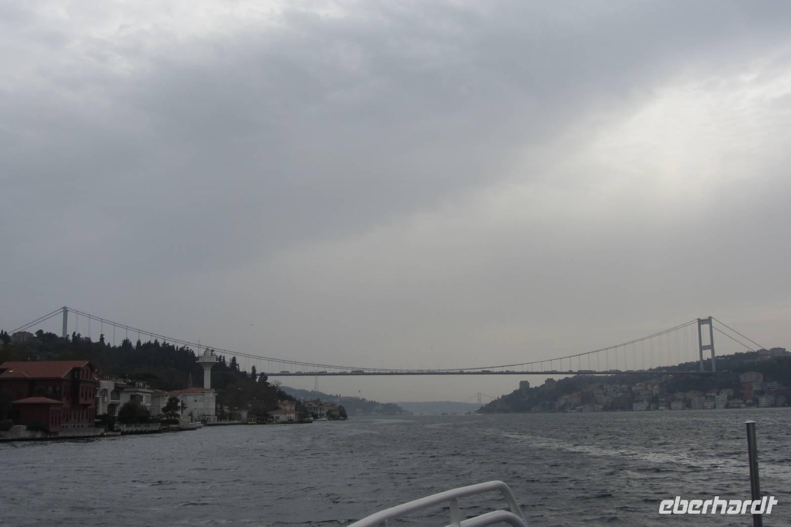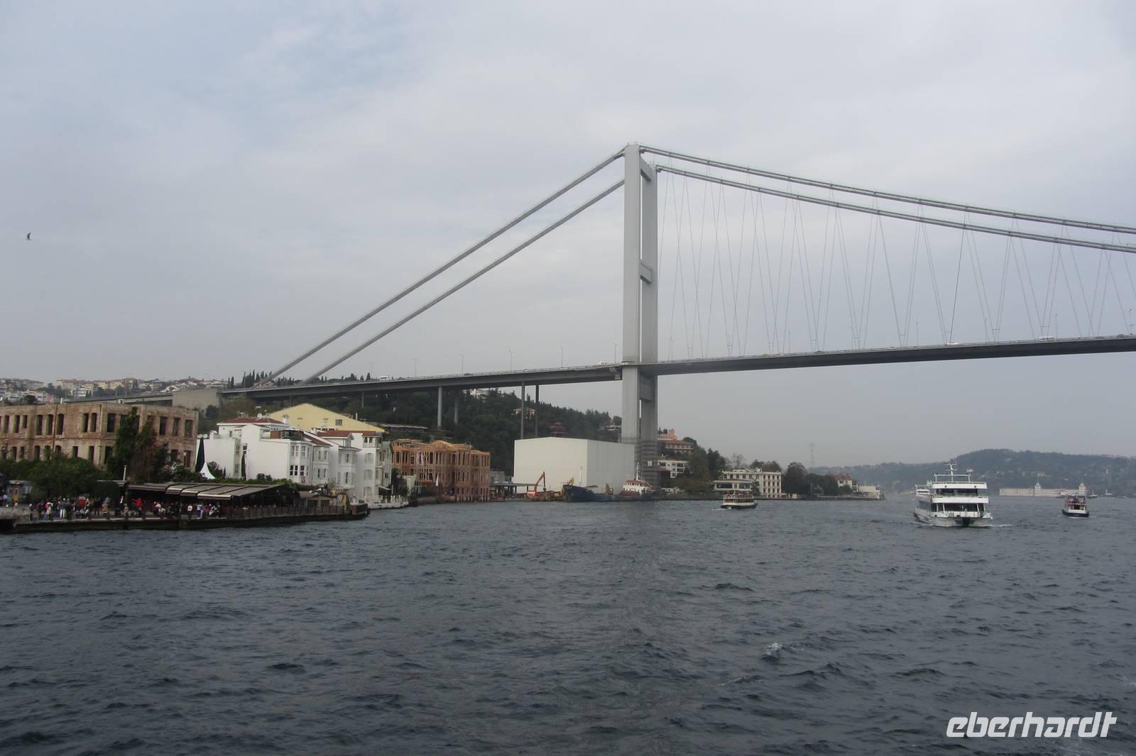 Nach einer urigen Mittagspause in einem kleinen Fischerdorf wartet nun eine Bootsfahrt auf dem Bosporus auf uns. Die Meerenge zwischen Europa und Kleinasien, die das Schwarze Meer mit dem Marmarameer verbindet, gilt als eine der weltweit wichtigsten Wasserstraßen. Wir schippern auf unserem Boot, was wir nur für uns haben, ca. 2 Stunden entlang der Stadt. Wir genießen türkisches Gebäck und Kaffee oder Tee und natürlich die Ausblicke. Wir durchqueren die imposanten Brücken und lassen die Neu- und Altstadt hinter uns. Serdar kommentiert die Bootsfahrt. Wir erhalten ein ganz anderes Bild der Metropole. Prächtige Villen und kleine Ferienhäuser mit Swimmingpool im Garten säumen die Ufer. Die Festungsanlage Rumeli Hisari, die in nur 4 Monaten gebaut wurde, den Dolmabahce-Palast und Çiragan-Palast sehen wir vom Schiff aus.