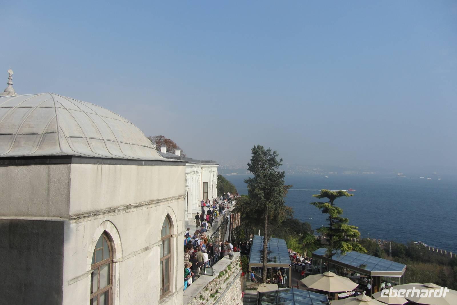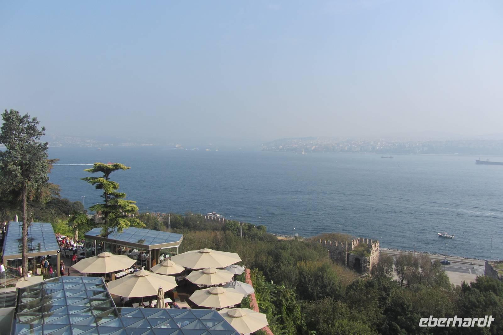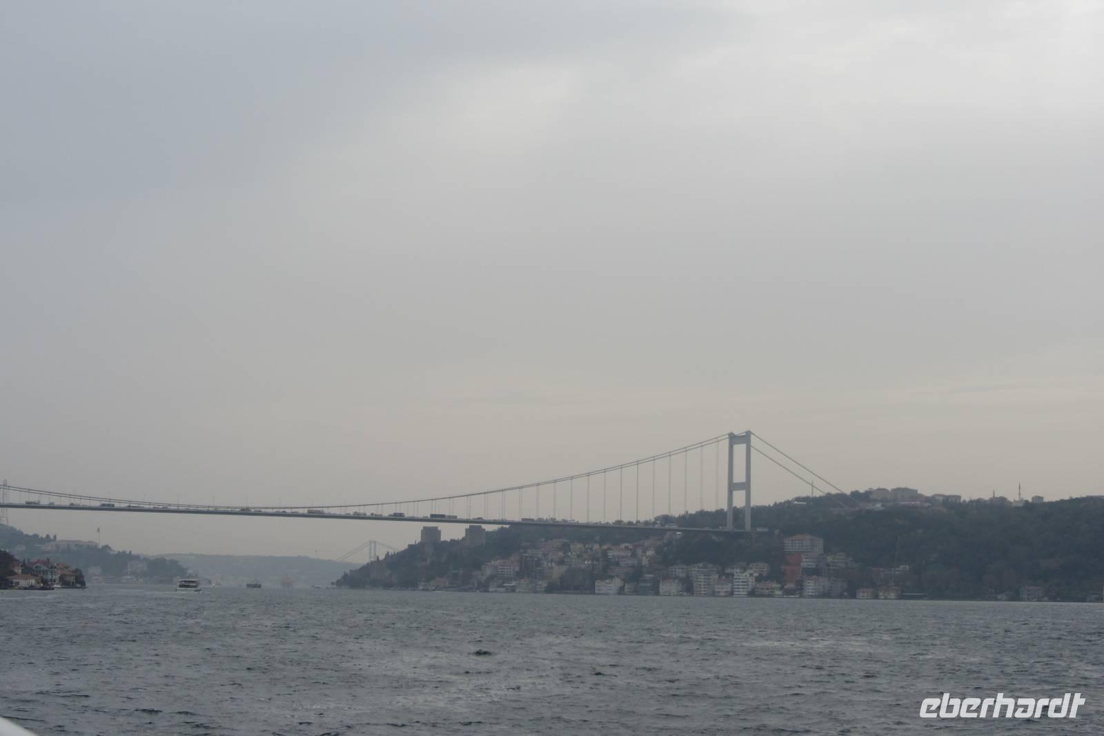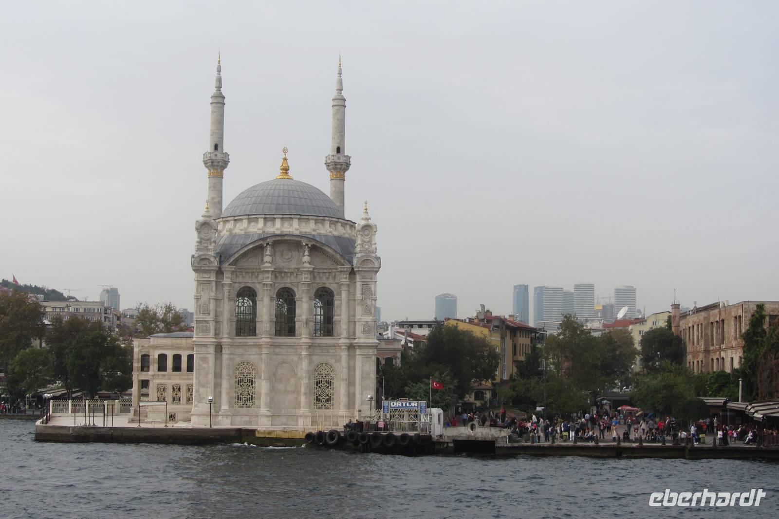 Nach einer urigen Mittagspause in einem kleinen Fischerdorf wartet nun eine Bootsfahrt auf dem Bosporus auf uns. Die Meerenge zwischen Europa und Kleinasien, die das Schwarze Meer mit dem Marmarameer verbindet, gilt als eine der weltweit wichtigsten Wasserstraßen. Wir schippern auf unserem Boot, was wir nur für uns haben, ca. 2 Stunden entlang der Stadt. Wir genießen türkisches Gebäck und Kaffee oder Tee und natürlich die Ausblicke. Wir durchqueren die imposanten Brücken und lassen die Neu- und Altstadt hinter uns. Serdar kommentiert die Bootsfahrt. Wir erhalten ein ganz anderes Bild der Metropole. Prächtige Villen und kleine Ferienhäuser mit Swimmingpool im Garten säumen die Ufer. Die Festungsanlage Rumeli Hisari, die in nur 4 Monaten gebaut wurde, den Dolmabahce-Palast und Çiragan-Palast sehen wir vom Schiff aus.