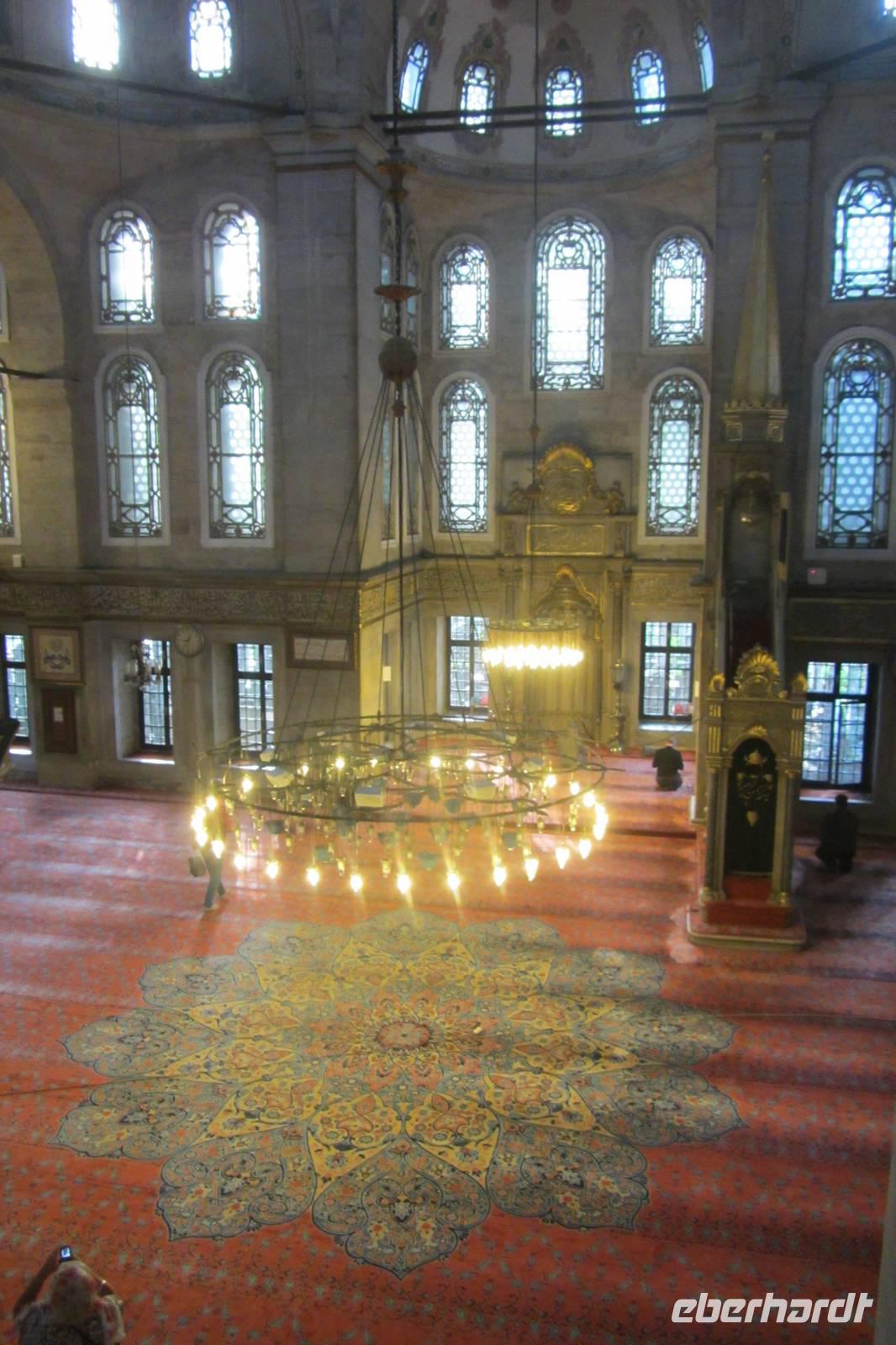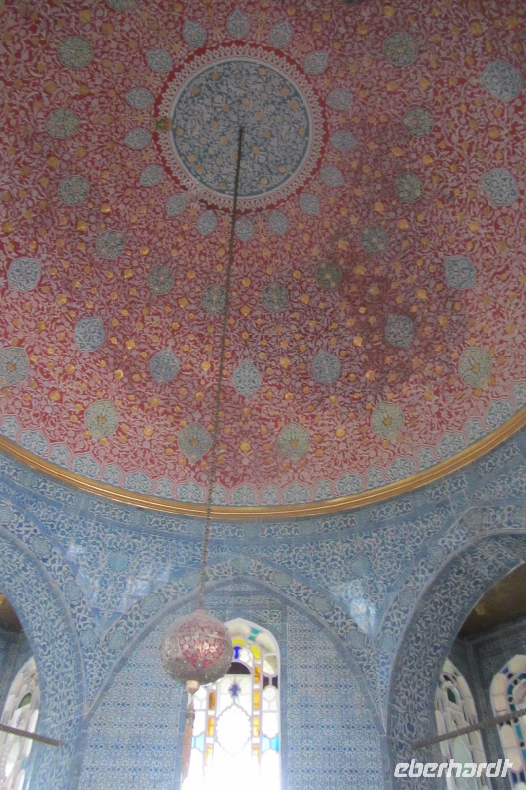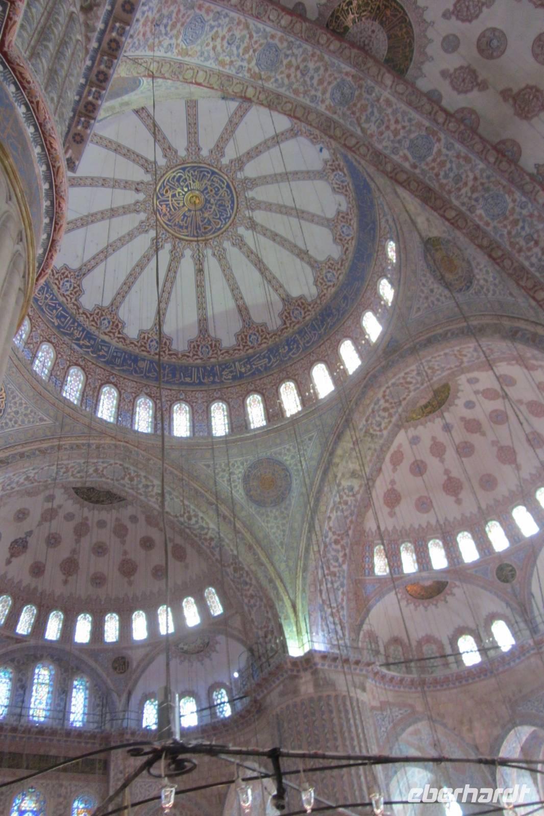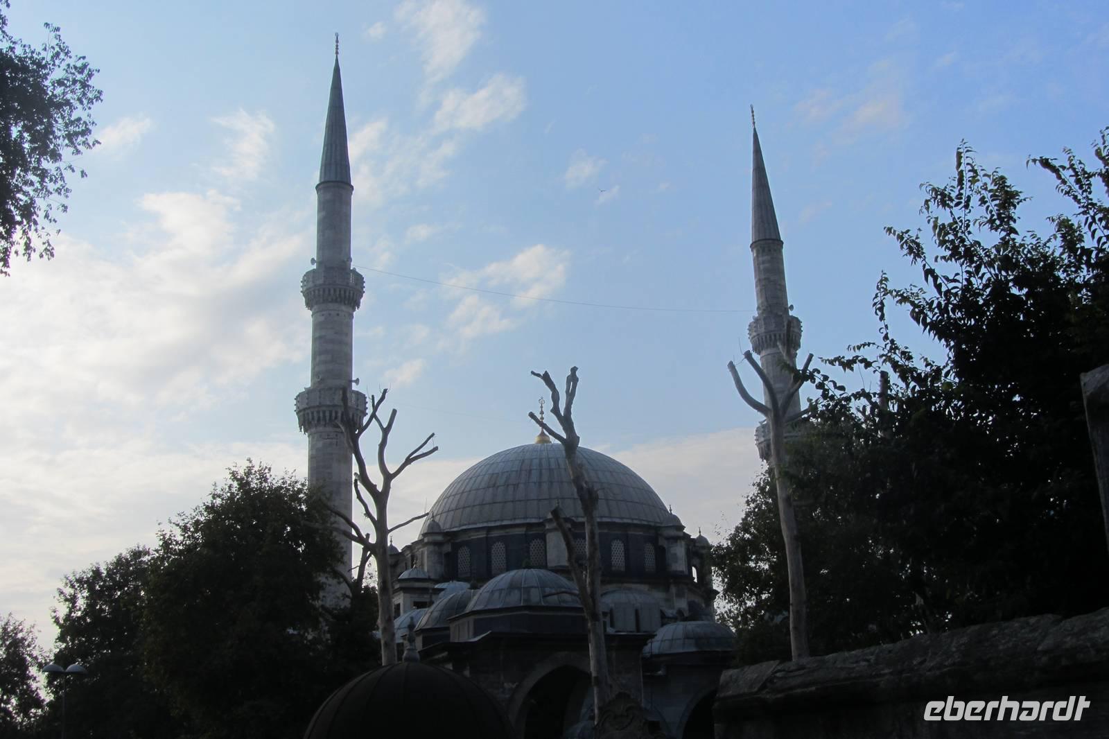 Entlang des Hippodroms, den Platz, den wir später noch näher kennen lernen, gehen wir direkt zur Sultan-Ahmet-Moschee, besser bekannt als Blaue Moschee. Warum sie so heißt, erfahren wir im Inneren der Moschee, nachdem wir unsere Schuhe ausgezogen und die Damen ihre Haare unter einem Kopftuch verdeckt haben. Im Innern fallen sofort die blauen Kacheln, der rote Teppich und die riesigen Leuchter auf, die von der Kuppel herunterhängen. Beim genaueren Hinsehen stellen wir fest, dass die Farben und Muster der Fliesen sich unterscheiden. Kein Wunder, denn sie stammen von verschiedenen Fabriken der Stadt. Wir durchqueren die Blaue Moschee und verlassen sie auf der anderen Seite.