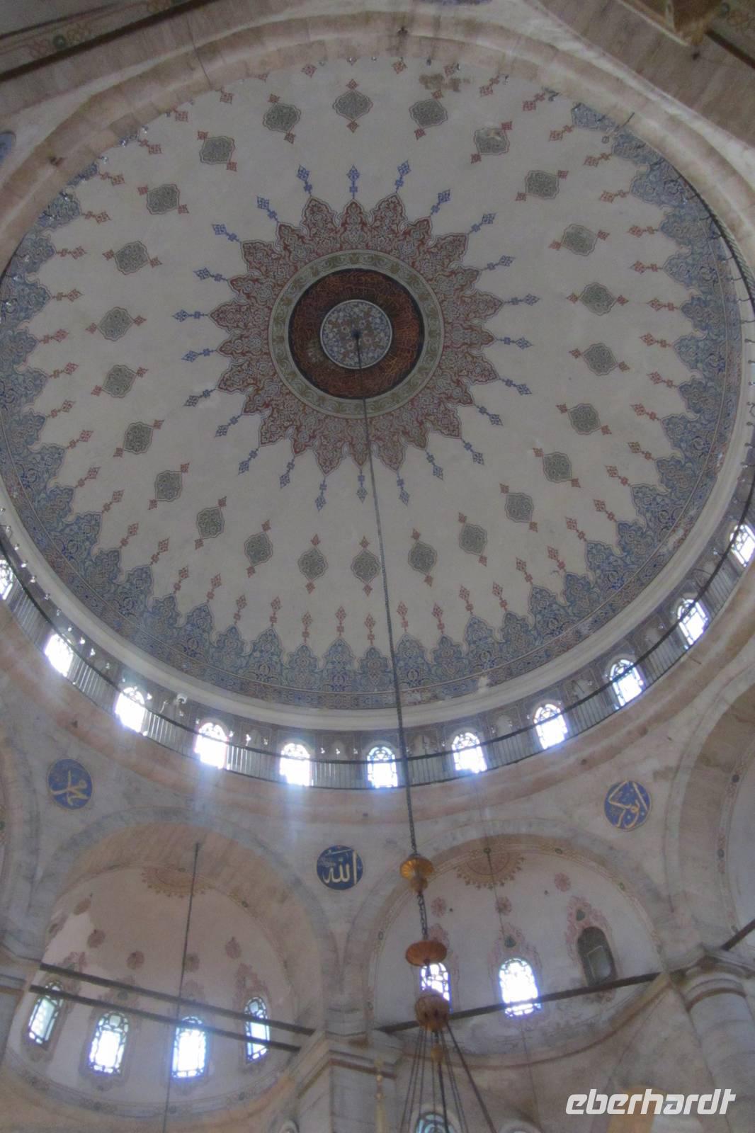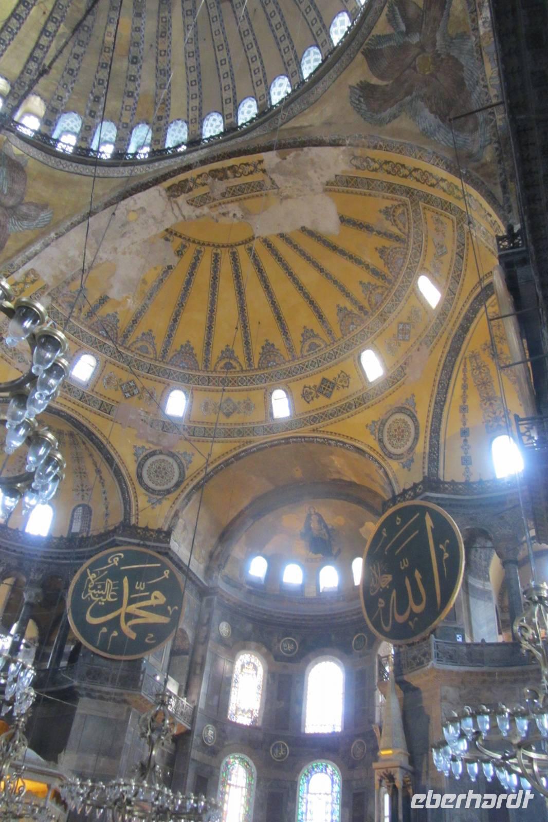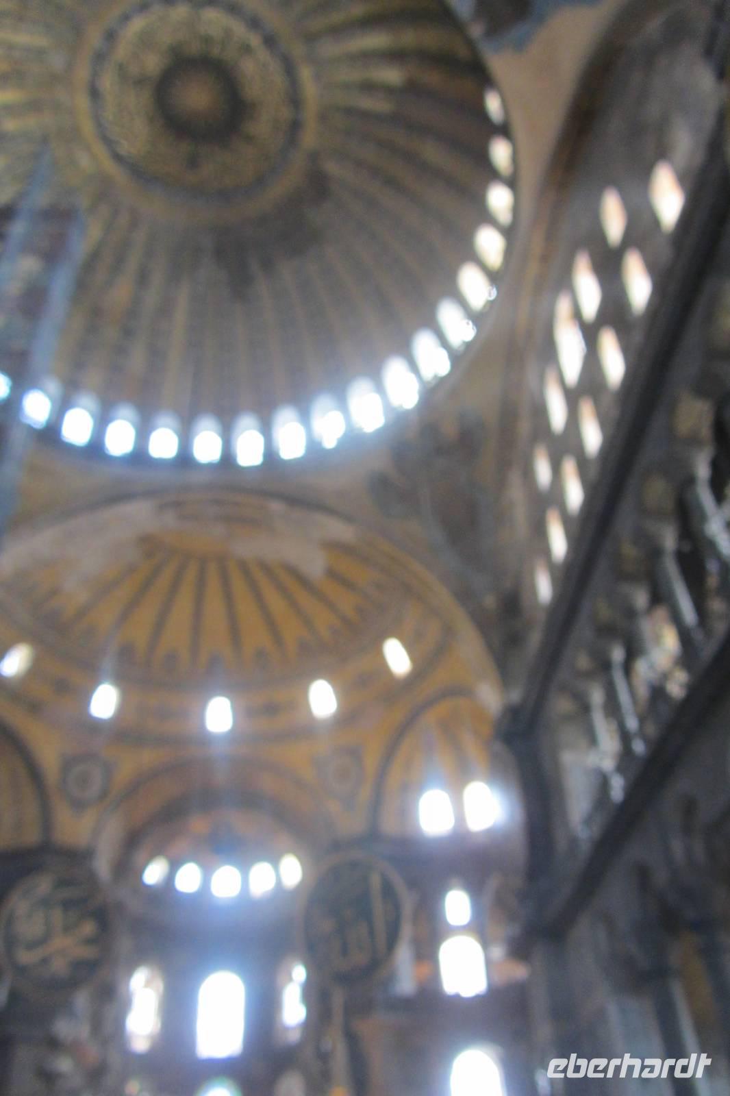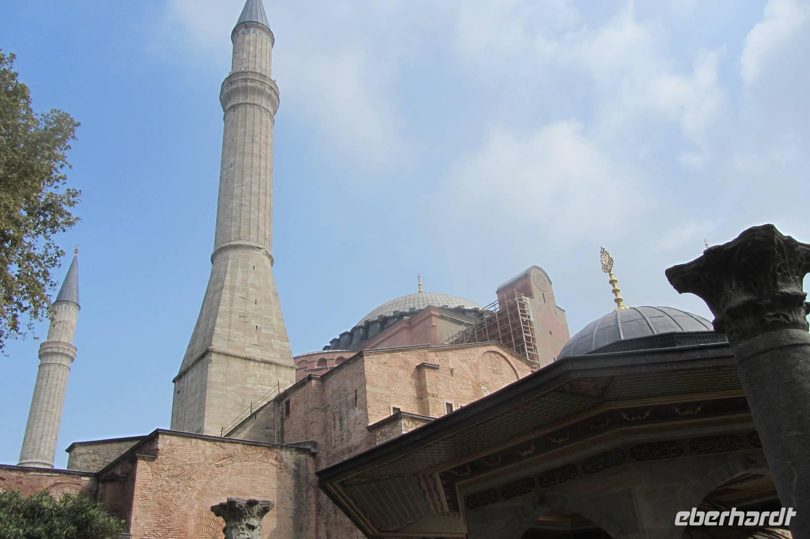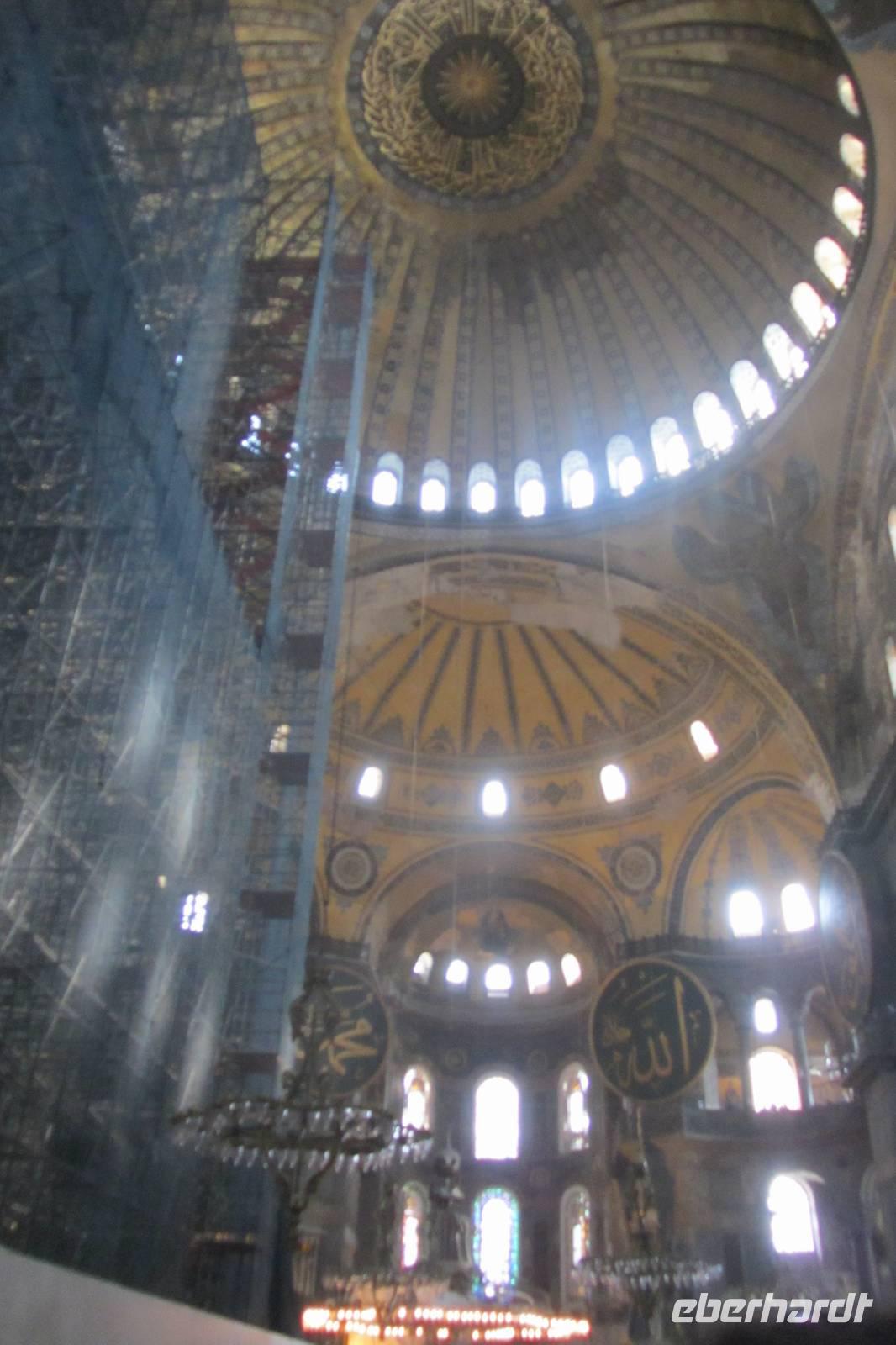 Entlang des Hippodroms, den Platz, den wir später noch näher kennen lernen, gehen wir direkt zur Sultan-Ahmet-Moschee, besser bekannt als Blaue Moschee. Warum sie so heißt, erfahren wir im Inneren der Moschee, nachdem wir unsere Schuhe ausgezogen und die Damen ihre Haare unter einem Kopftuch verdeckt haben. Im Innern fallen sofort die blauen Kacheln, der rote Teppich und die riesigen Leuchter auf, die von der Kuppel herunterhängen. Beim genaueren Hinsehen stellen wir fest, dass die Farben und Muster der Fliesen sich unterscheiden. Kein Wunder, denn sie stammen von verschiedenen Fabriken der Stadt. Wir durchqueren die Blaue Moschee und verlassen sie auf der anderen Seite.