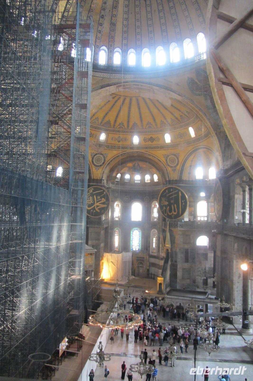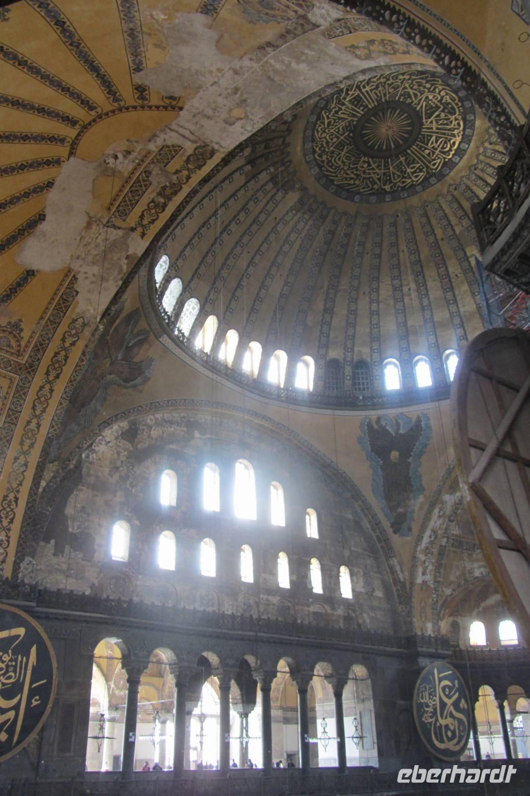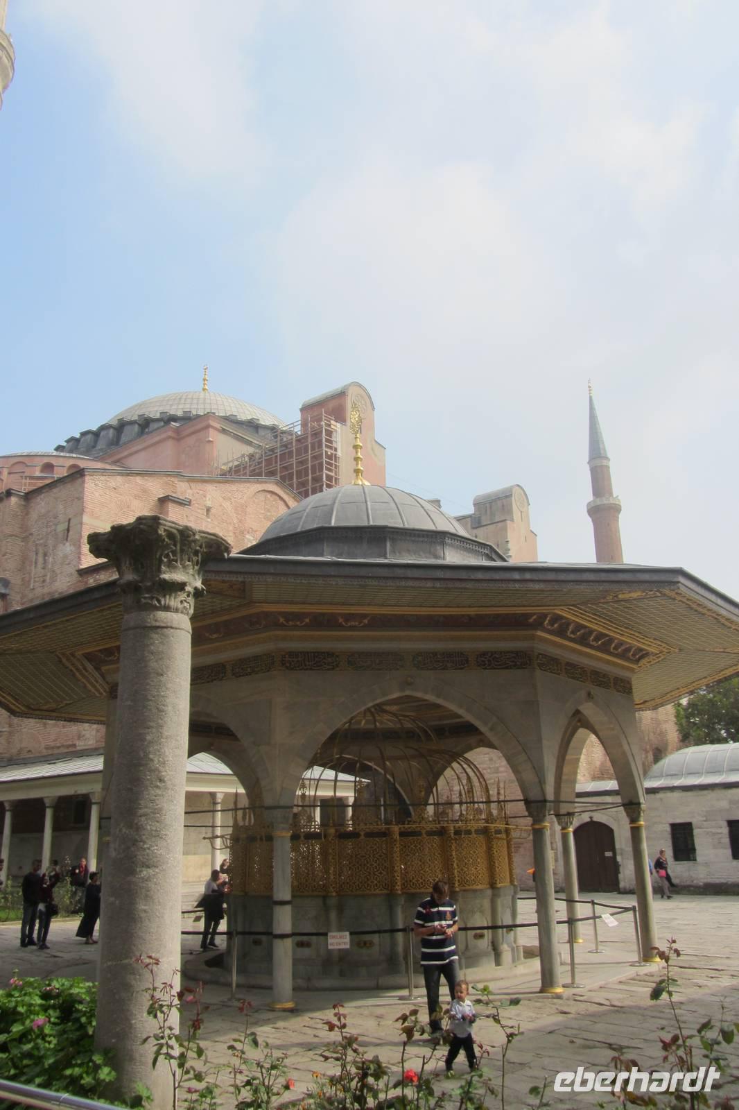 Bereits von Weitem erstrahlt die Hagia Sophia, das letzte große Bauwerk der Spätantike und Wahrzeichen Istanbuls. Wir überqueren den Platz mit dem erst neu erbauten Brunnen und betreten das ursprünglich größte christliche Gotteshaus der Welt. Die Hagia Sophia ist eine ehemalige Kirche des Byzantinischen Reiches, war anschließend Moschee und ist heute ein Museum. Den Großteil der Informationen erhalten wir vorab, da im Inneren nur beschränkt geführt werden darf. Imposant. Prunkvoll. Sehr beeindruckend.