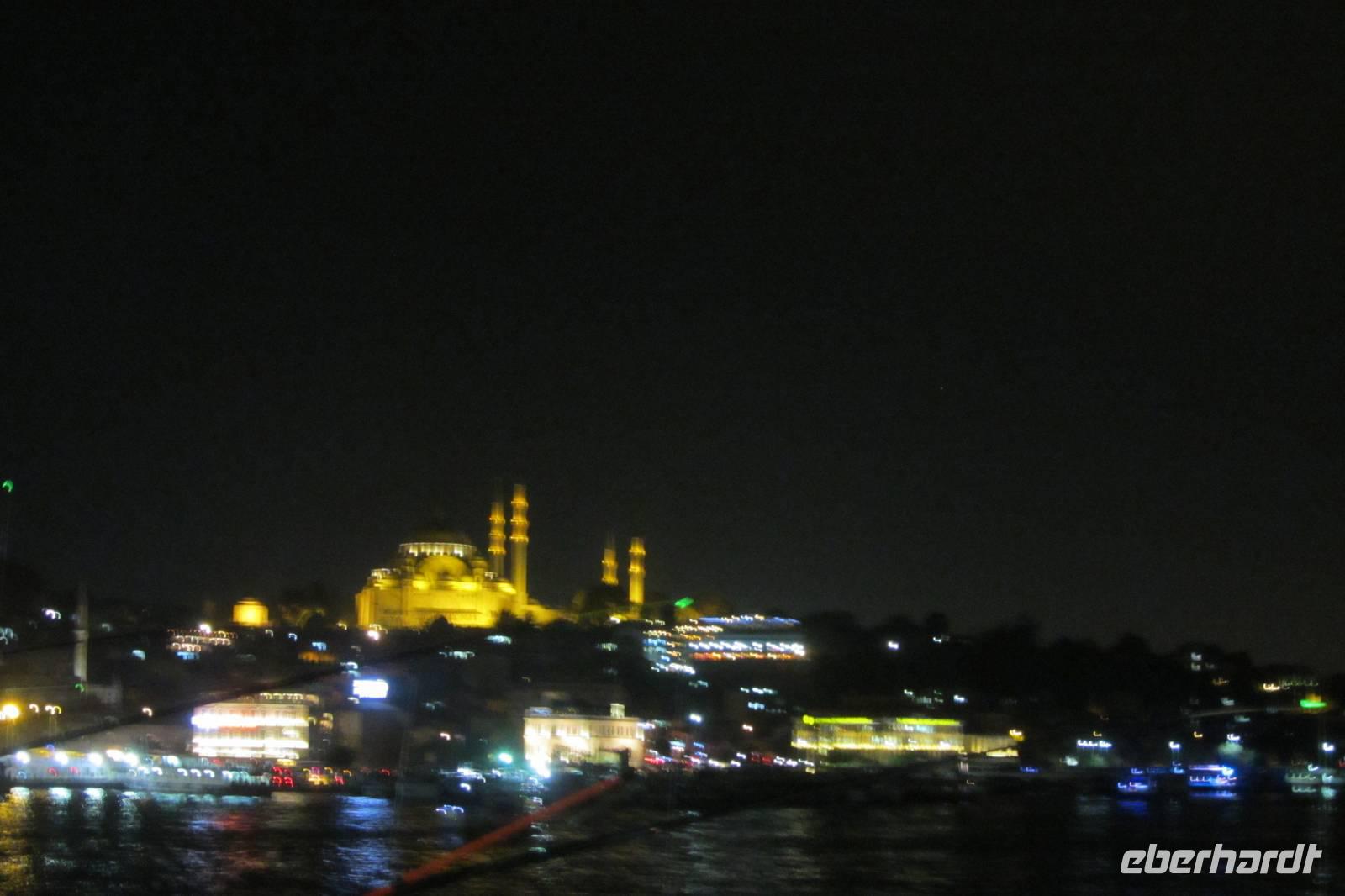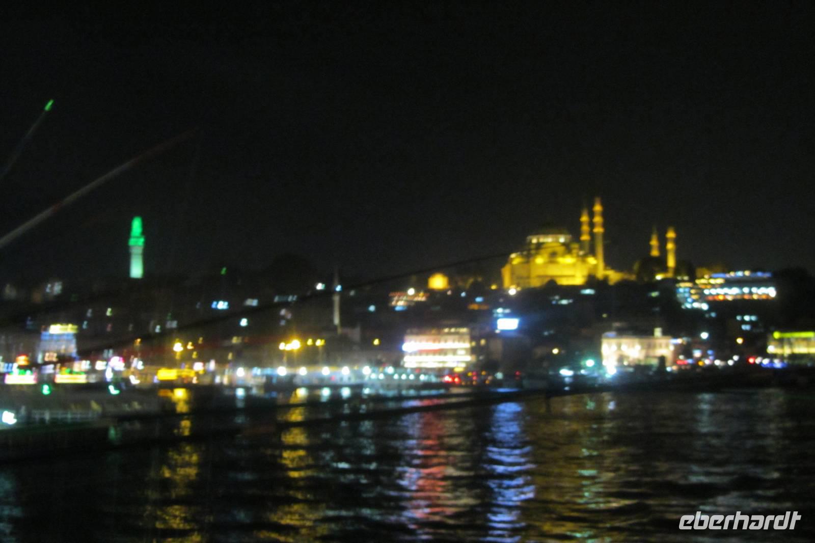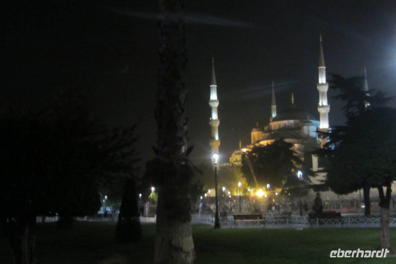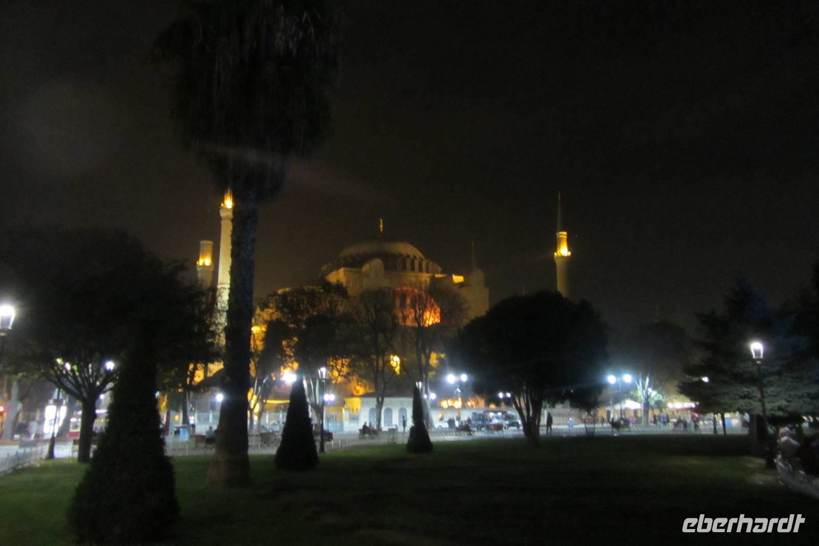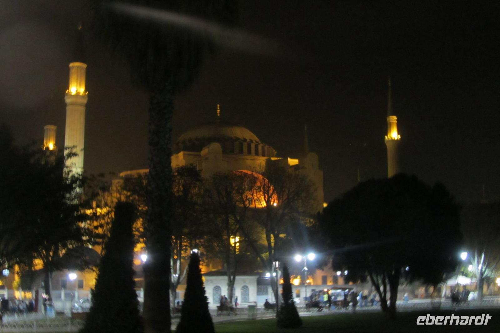 Wer das Abendessen zusätzlich gebucht hat, macht sich kurz frisch, und schon sitzen wir wieder im Bus. Heute Abend werden wir in einem der bekanntesten Fischrestaurants speisen und das Nachtleben kennen lernen. In Istanbul steht frischer Fisch ganz oben auf der Speisekarte. Entweder kommt er ganz frisch vom Bosporus oder aber aus der Ägäis. Nach leckeren Vorspeisen stehen uns Dorade und Seebarsch zur Auswahl. Das Essen schmeckt sehr gut. Anschließend fahren wir nochmals zum Hippodrom, das nachts beleuchtet einen ganz anderen Eindruck vermittelt. Wir können die Hagia Sophia und die Blaue Moschee nun auch beleuchtet fotografieren. Anschließend kehren wir zurück zum Hotel.
