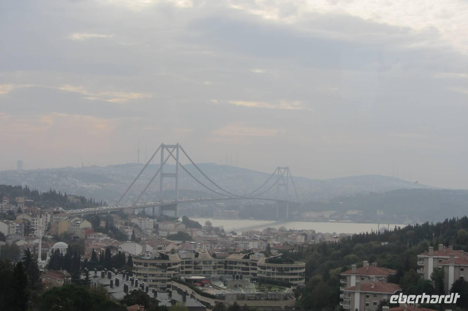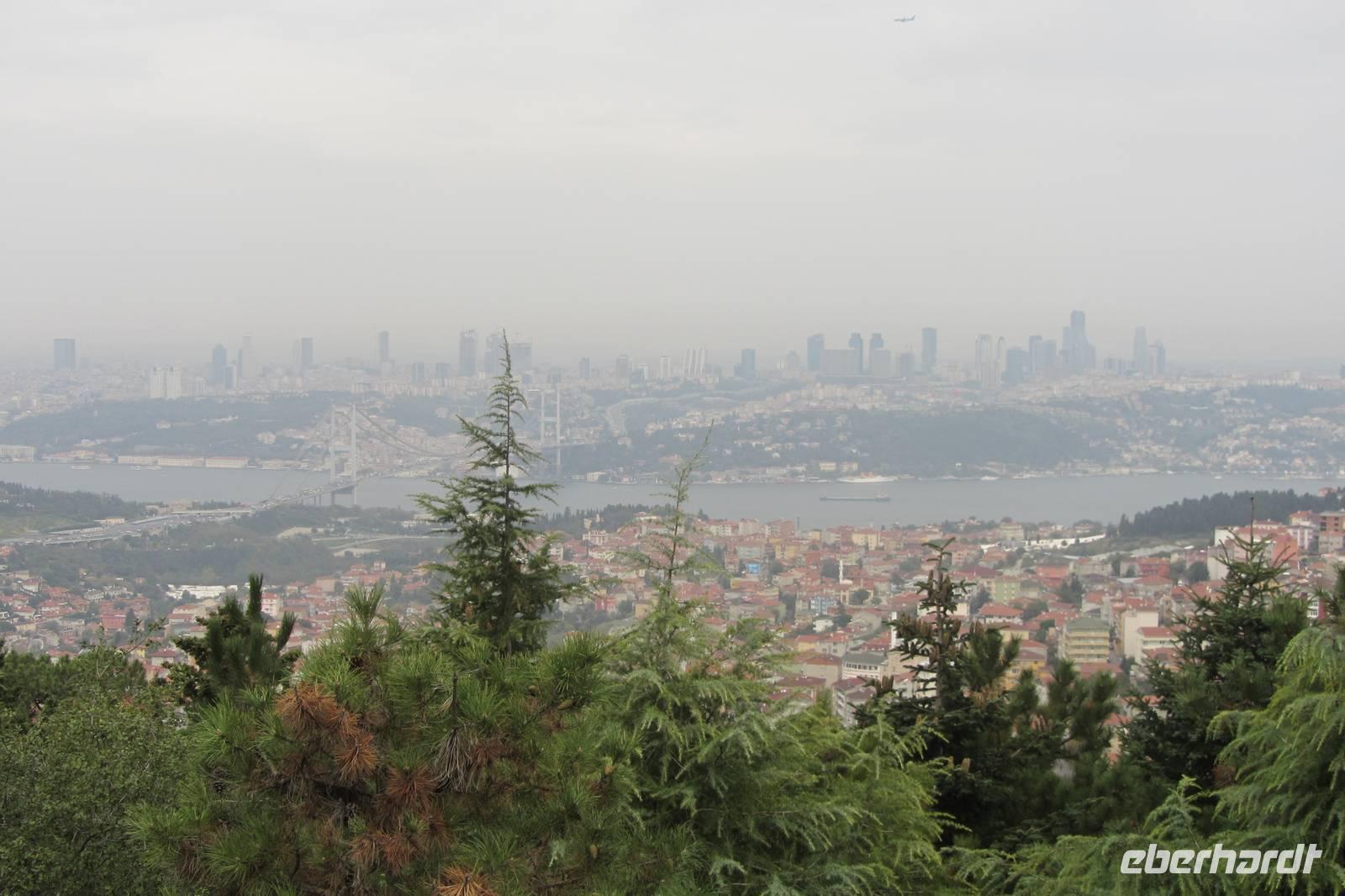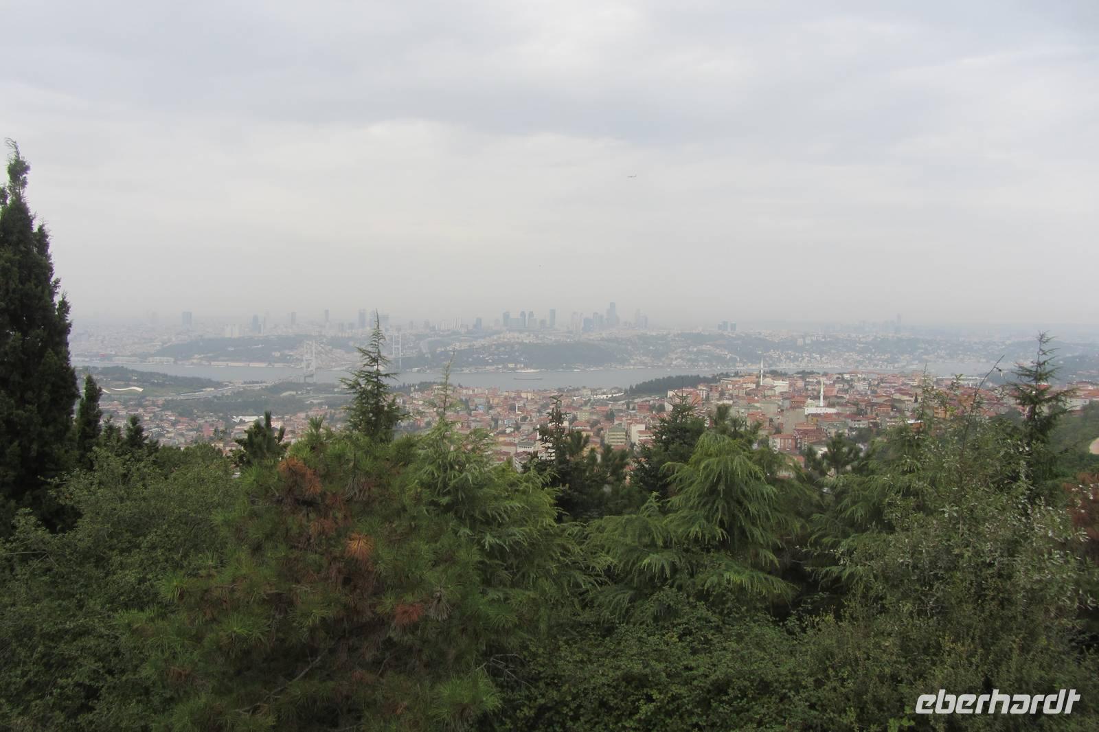 Heute fahren wir quer durch die Stadt und besuchen einen anderen Kontinent. Es geht über die lange Bosporusbrücke nach Anatolien. Nirgends sonst auf der Welt kann man so schnell die Kontinente wechseln. Wir erfahren, dass in Asien gewohnt und in Europa gearbeitet wird, und dadurch immer reger Verkehr auf den Brücken herrscht. Ein herrlicher Anblick bietet sich vom asiatischen Teil Istanbuls auf die Altstadt. In der Nähe des Mädchenturms machen wir einen Fotostopp. Eine Sage erzählt von Sultans Tochter, welches in diesem Turm vor einer gefährlichen Schlange geschützt werden sollte. Aus Unachtsamkeit beim Bringen von Obst, konnte die Schlange dennoch zum Turm gelangen und biss das arme Mädchen. Wahrscheinlicher ist jedoch, dass von diesem Turm aus die Ein- und Ausfahrt auf dem Bosporus bewacht wurde. Vorbei an Wochenmärkten, am Fußballstadion Fenerbahçe, entlang der Bagdad-Straße und den Luxusgeschäften fahren wir durch Kleinasien. Wir merken schnell, dass sich das Stadtbild nur geringfügig geändert hat im Gegensatz zur europäischen Seite. Unterwegs klärt uns Serdar über Schulpflicht, Rente, und andere landestypischen Fakten auf. Nach längerer Wartezeit im Stau und anschließendem steilen Anstieg eröffnet sich vor uns von der höchsten Erhebung Istanbuls, vom sogenannten Tannenhügel, ein imposanter Blick über die Megastadt. Trotz der diesigen Sicht können wir recht weit schauen, wodurch uns die Ausmaße erst so richtig bewusst werden.