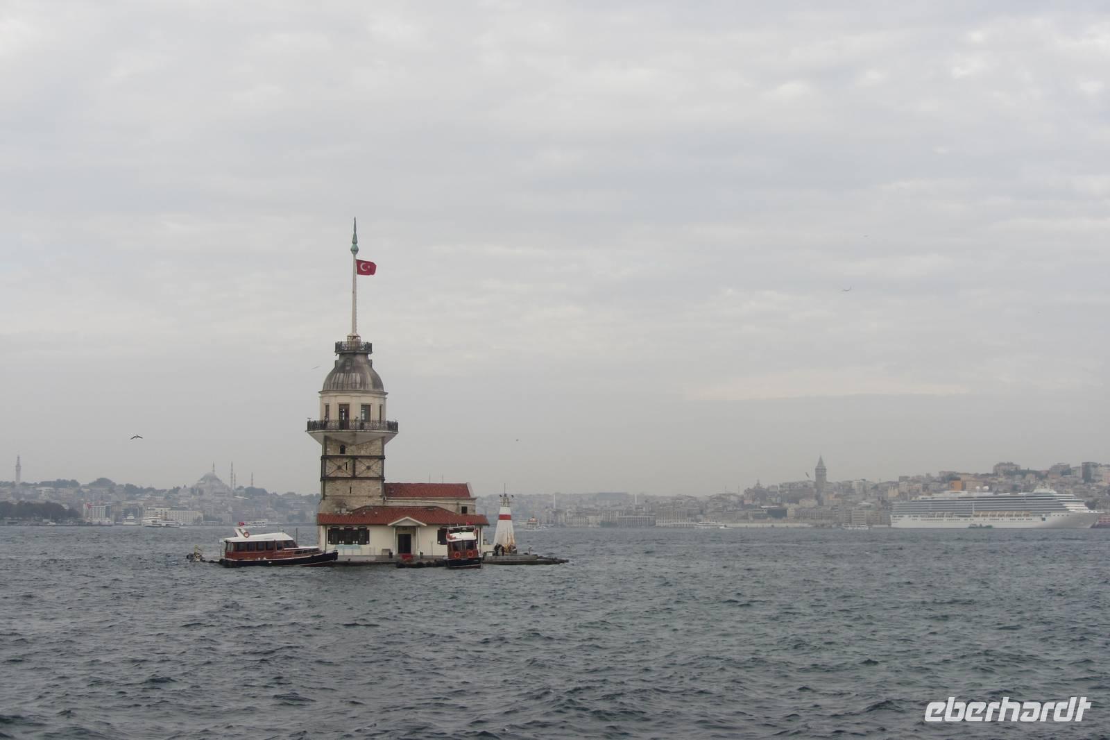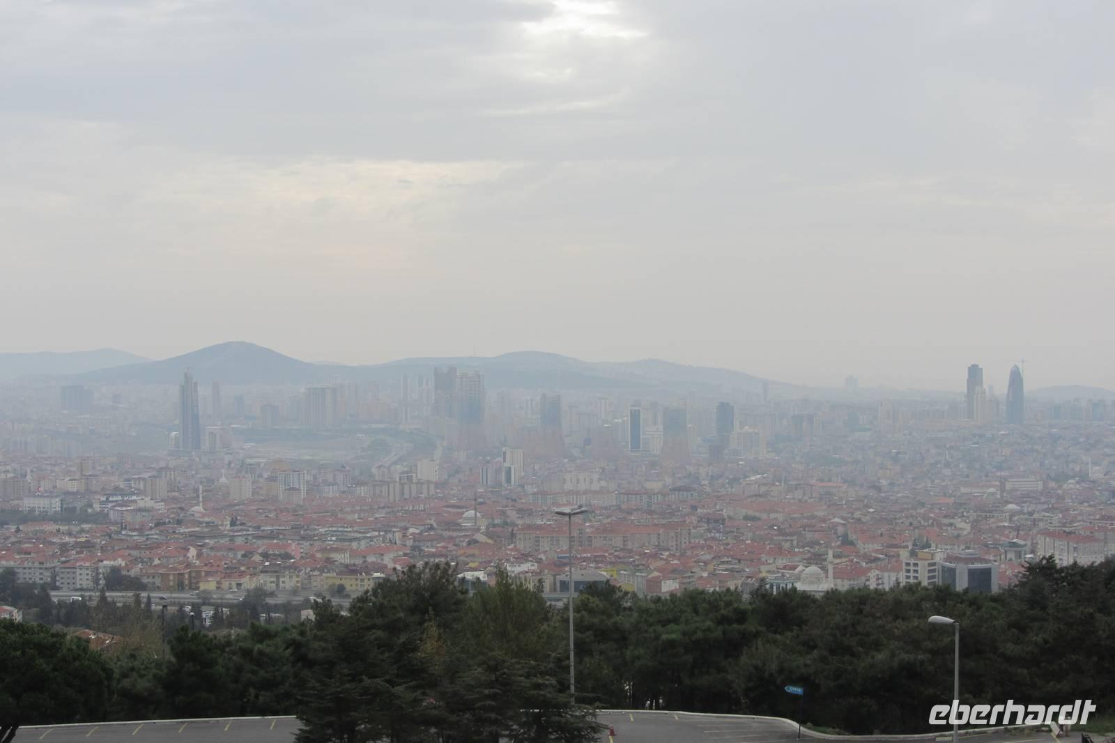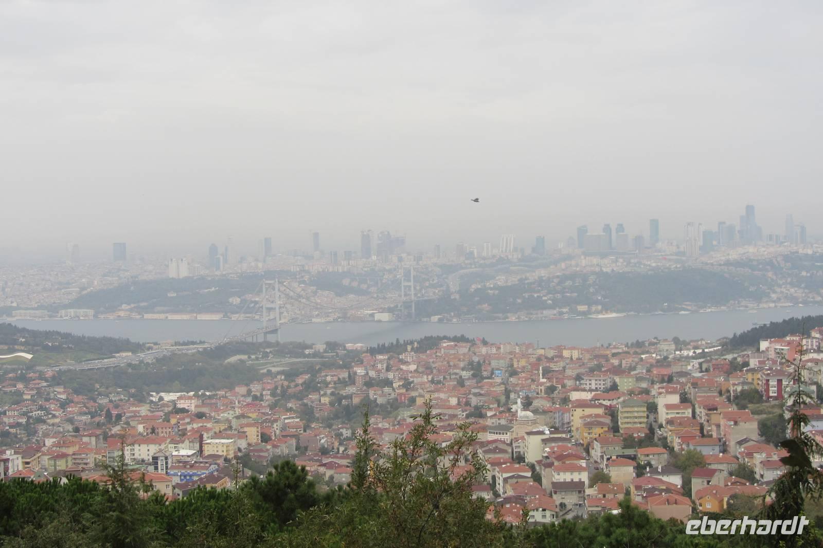 Heute fahren wir quer durch die Stadt und besuchen einen anderen Kontinent. Es geht über die lange Bosporusbrücke nach Anatolien. Nirgends sonst auf der Welt kann man so schnell die Kontinente wechseln. Wir erfahren, dass in Asien gewohnt und in Europa gearbeitet wird, und dadurch immer reger Verkehr auf den Brücken herrscht. Ein herrlicher Anblick bietet sich vom asiatischen Teil Istanbuls auf die Altstadt. In der Nähe des Mädchenturms machen wir einen Fotostopp. Eine Sage erzählt von Sultans Tochter, welches in diesem Turm vor einer gefährlichen Schlange geschützt werden sollte. Aus Unachtsamkeit beim Bringen von Obst, konnte die Schlange dennoch zum Turm gelangen und biss das arme Mädchen. Wahrscheinlicher ist jedoch, dass von diesem Turm aus die Ein- und Ausfahrt auf dem Bosporus bewacht wurde. Vorbei an Wochenmärkten, am Fußballstadion Fenerbahçe, entlang der Bagdad-Straße und den Luxusgeschäften fahren wir durch Kleinasien. Wir merken schnell, dass sich das Stadtbild nur geringfügig geändert hat im Gegensatz zur europäischen Seite. Unterwegs klärt uns Serdar über Schulpflicht, Rente, und andere landestypischen Fakten auf. Nach längerer Wartezeit im Stau und anschließendem steilen Anstieg eröffnet sich vor uns von der höchsten Erhebung Istanbuls, vom sogenannten Tannenhügel, ein imposanter Blick über die Megastadt. Trotz der diesigen Sicht können wir recht weit schauen, wodurch uns die Ausmaße erst so richtig bewusst werden.