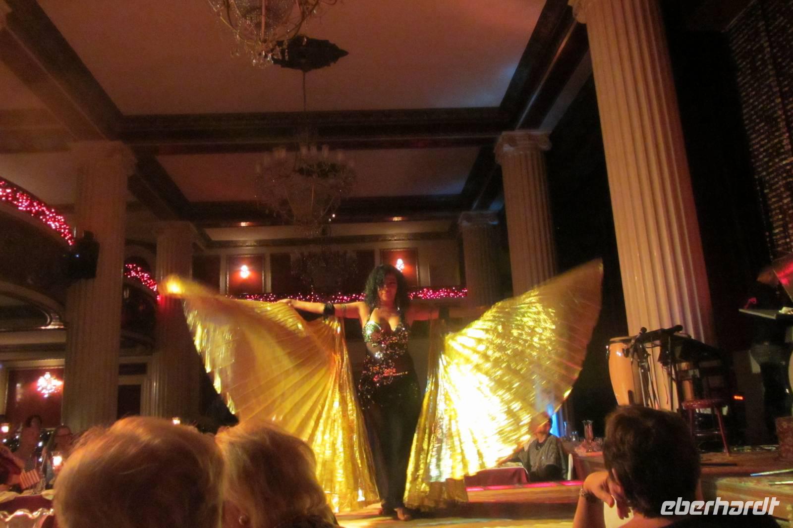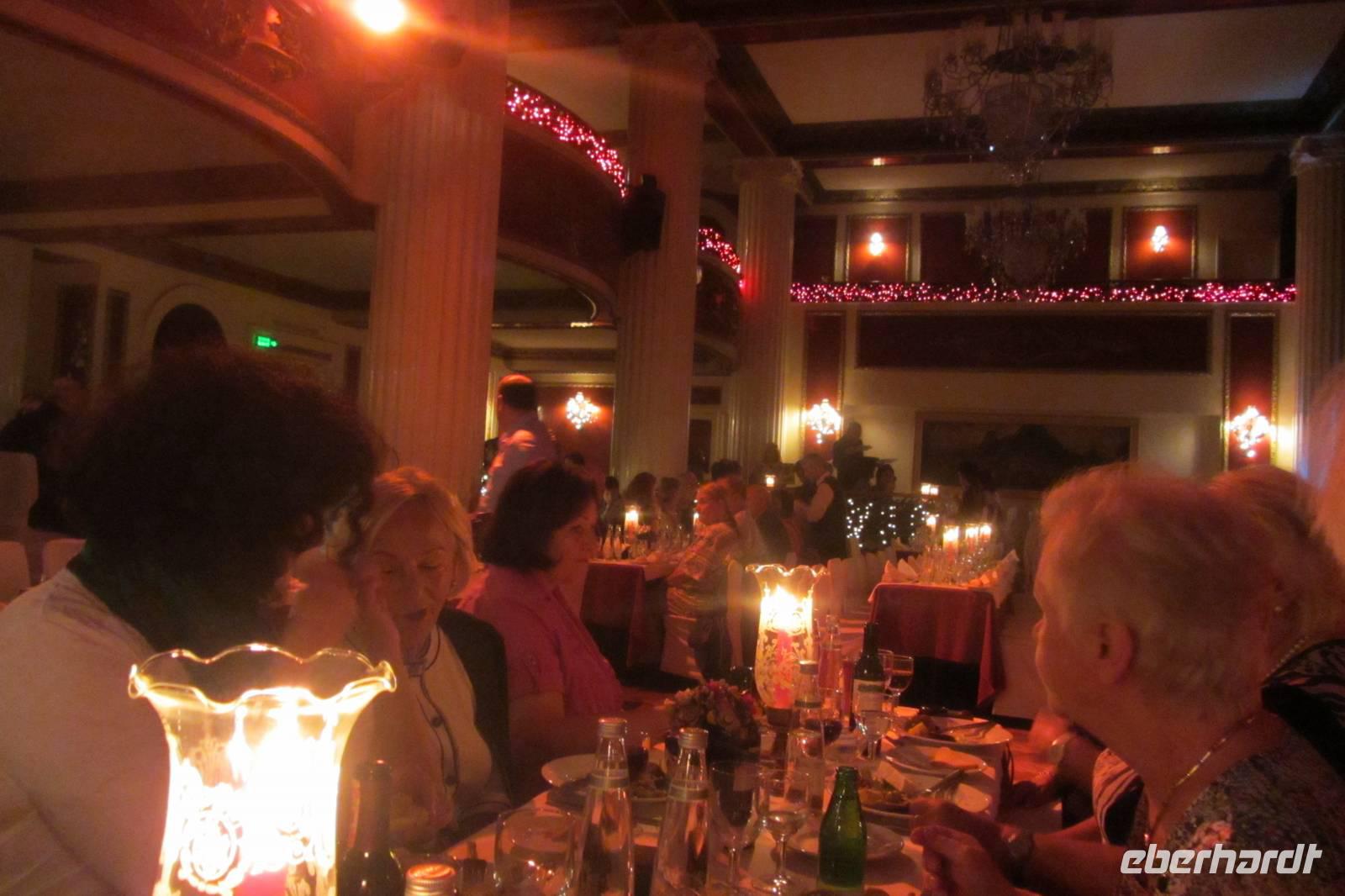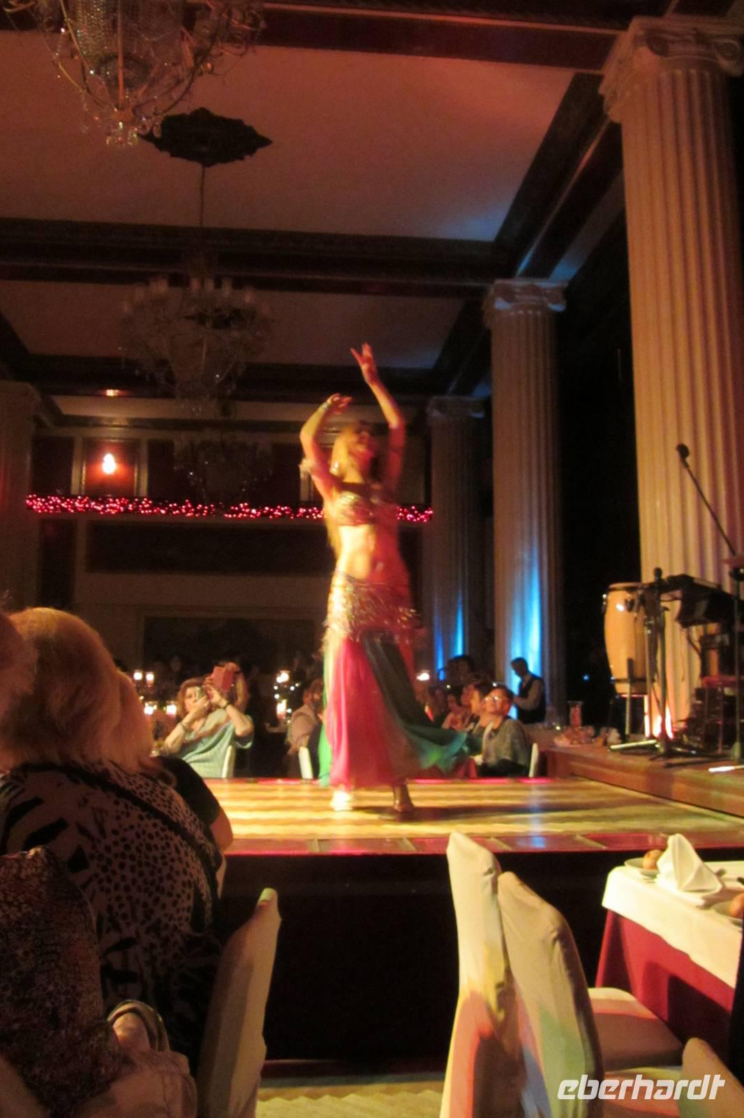Im Nachtlokal „Kervansaray" werden wir während eines schmackhaften Essens von attraktiven Bauchtänzerinnen, Folkloregruppen und einem internationalen Sänger abwechslungsreich unterhalten. Arsenna, die beste Bauchtänzerin der Türkei, zeigt Ihre Show und zieht alle, aber besonders die Männer, in ihren Bann. Aber der Abend hat noch viel mehr zu bieten: verschiedene Folklore-Darbietungen, Tänzer und Sänger bieten eine tolle Show. Am Schluss wird jedes angereiste Land mit typischer Musik begrüßt. Wir Deutsche werden mit dem Lied „Mein Hut der hat drei Ecken" überrascht - was natürlich alle mitsingen. Stimmungsvoll lassen wir den Abend ausklingen.