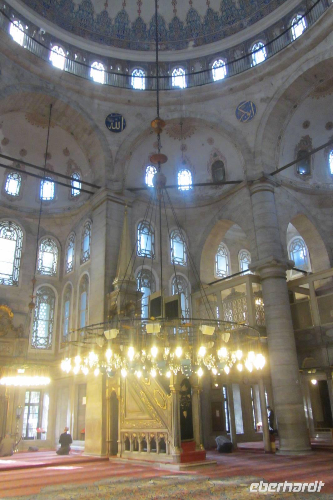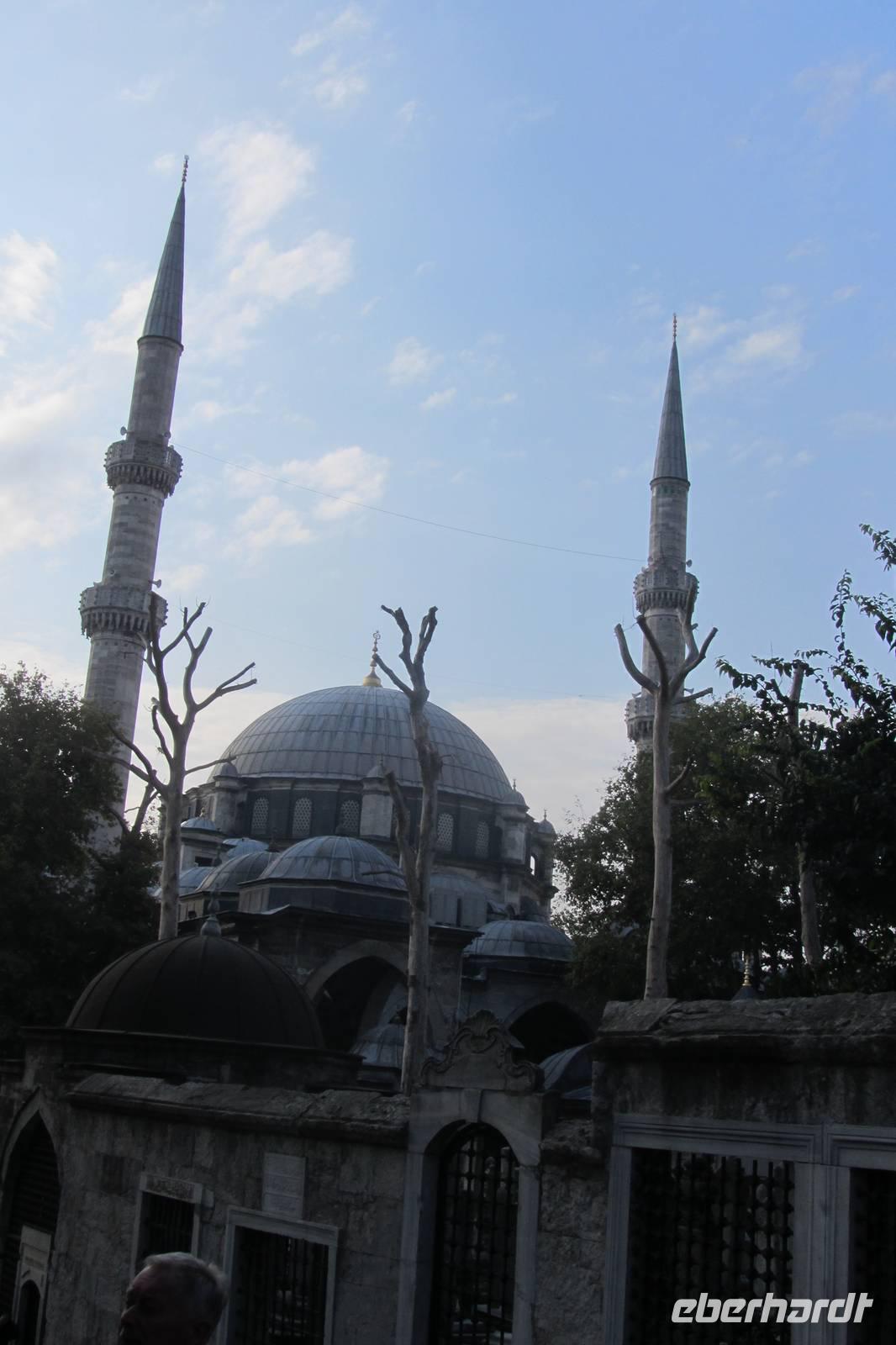 Heute ist Freitag, der „Sonntag" in Istanbul. Da wir heute eine Moschee besuchen möchten, müssen wir das zeitig am Morgen machen. Wir besuchen die Eyüp-Moschee, die heiligste Moschee Istanbuls. Hier befinden sich die Reliquien des Fahnenträgers von Mohammed. Nachdem wir die Hagia Sophia und Blaue Moschee als eher touristische Sehenswürdigkeiten kennengelernt haben, werden wir in dieser Moschee von der ganz besonderen Atmosphäre eingenommen. Auch hier müssen wir uns an die Kleiderordnung halten.