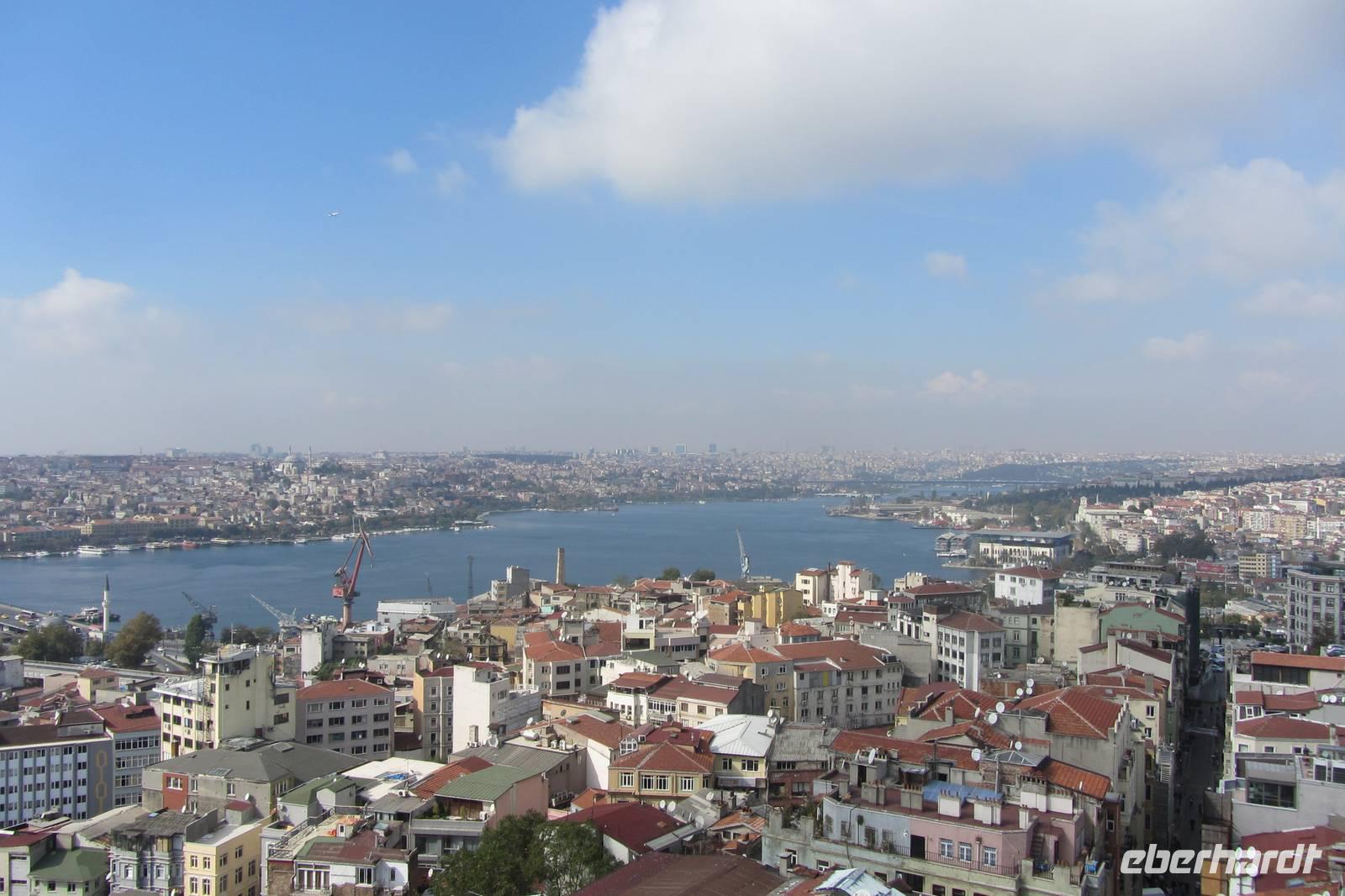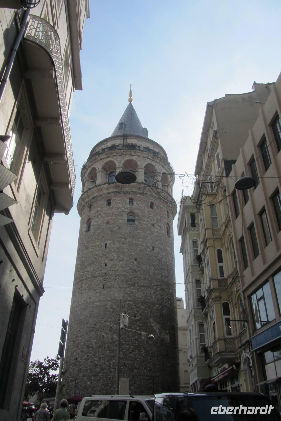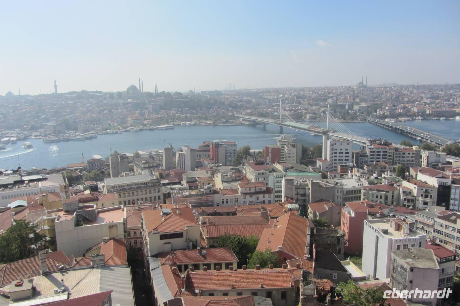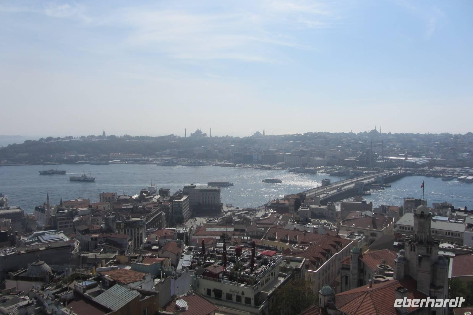 Unser nächstes Ziel ist der Galataturm. Wir fahren wir mit dem Fahrstuhl zur 7. Etage und steigen die letzten Treppenstufen empor. Die Sonne lacht und wir genießen die Aussicht bei strahlend blauem Himmel. Wir lassen unsere Blicke über all die imposanten Bauwerke Istanbuls schweifen. Danach genießen wir unsere Mittagspause in den umliegenden Straßen mit einem Essen oder auch einem Bummel durch die Geschäfte. Nun ist das offizielle Programm beendet. Doch da es noch früh am Tage ist, fahren wir noch zum Taksim-Platz, wo noch etwas Zeit für einen Kaffee, einen Döner oder einen Einkaufsbummel ist.