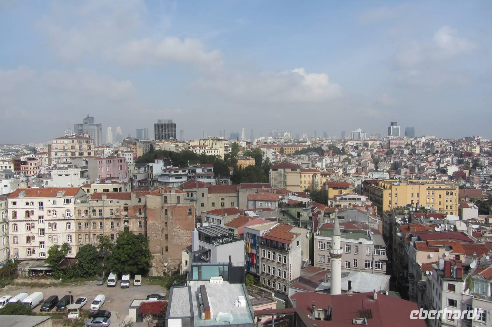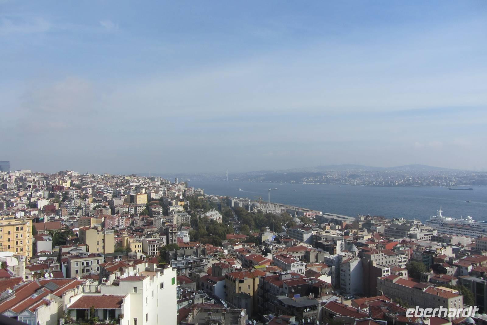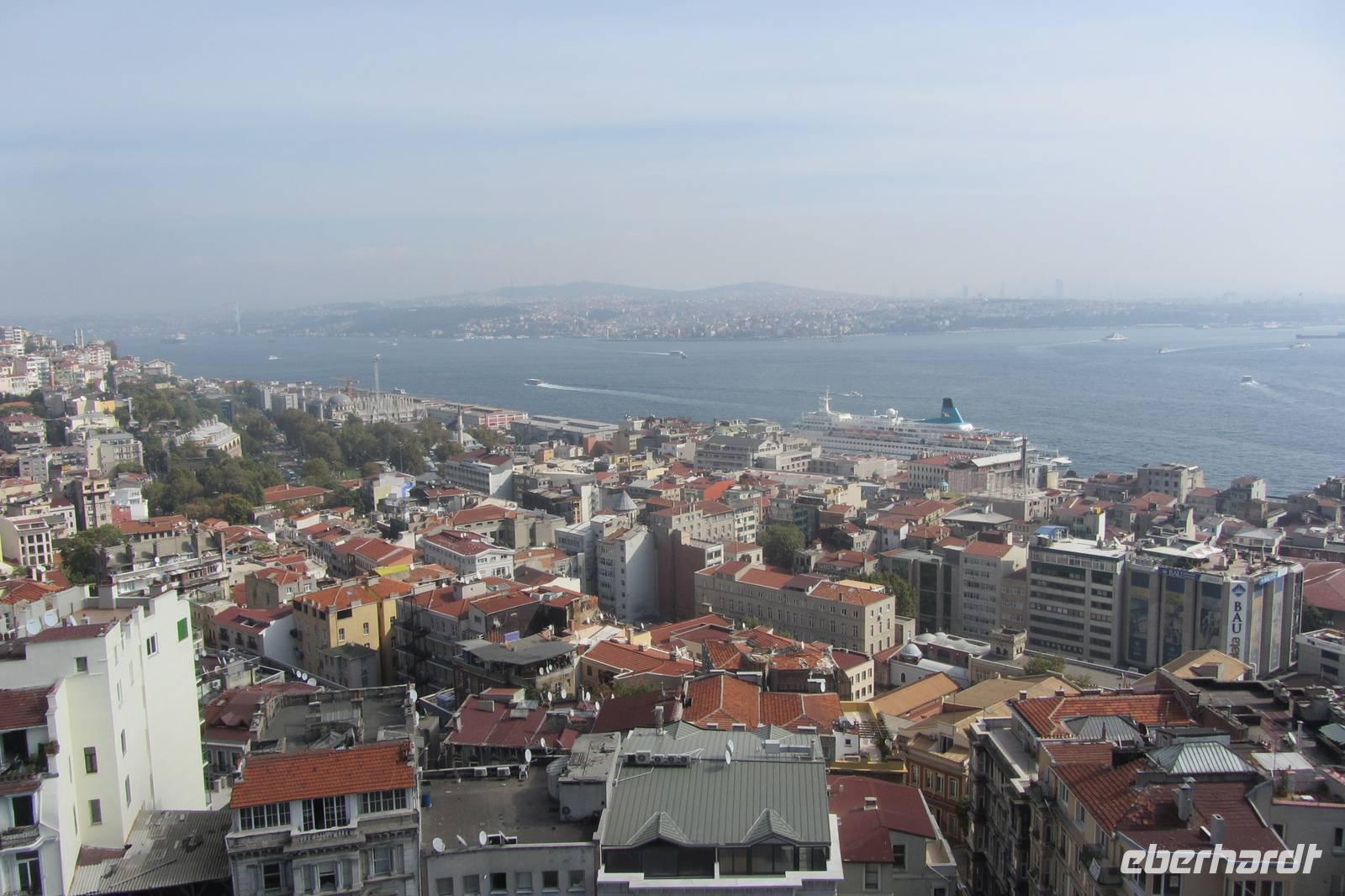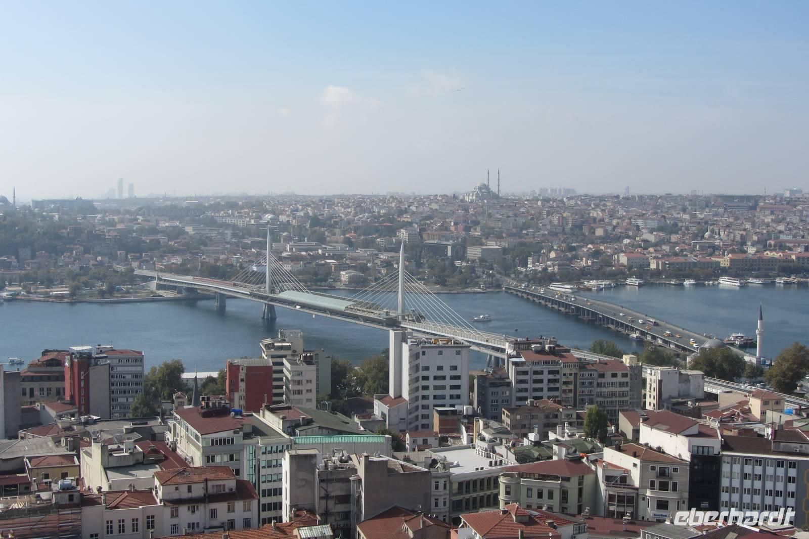 Unser nächstes Ziel ist der Galataturm. Wir fahren wir mit dem Fahrstuhl zur 7. Etage und steigen die letzten Treppenstufen empor. Die Sonne lacht und wir genießen die Aussicht bei strahlend blauem Himmel. Wir lassen unsere Blicke über all die imposanten Bauwerke Istanbuls schweifen. Danach genießen wir unsere Mittagspause in den umliegenden Straßen mit einem Essen oder auch einem Bummel durch die Geschäfte. Nun ist das offizielle Programm beendet. Doch da es noch früh am Tage ist, fahren wir noch zum Taksim-Platz, wo noch etwas Zeit für einen Kaffee, einen Döner oder einen Einkaufsbummel ist.