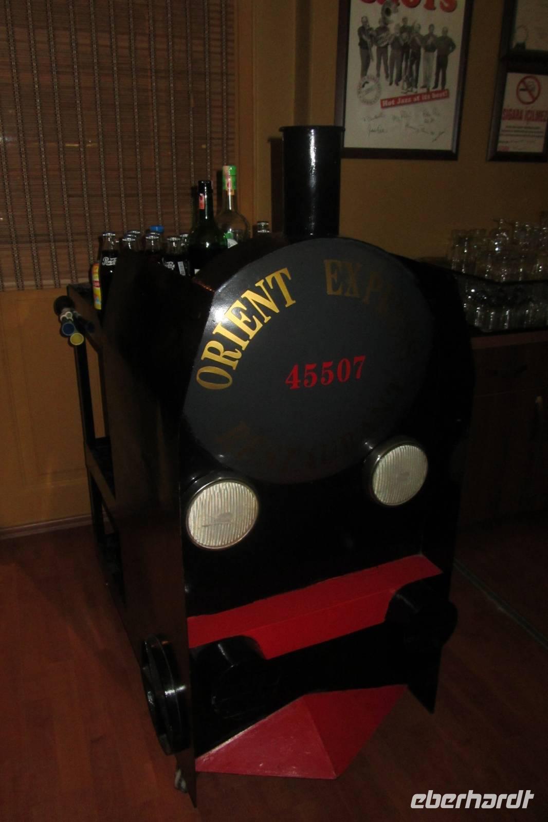 Am späten Nachmittag geht es zurück zum Hotel. Wieder gibt es eine kurze Pause, bevor wir an diesem Abend in längst vergangene Zeiten eintauchen. Wir sind zu Gast im Restaurant „Orient Express". Der damalige Wartesaal wurde zu einem Speisesaal umgestaltet. Liebevolle Details, Zeitungsausschnitte und nostalgische Poster erinnern an die Zeit als der Orient Express noch von Paris nach Istanbul verkehrte und hier im Bahnhof Sirkeci ankam. Mit kleiner Lok und Schaffnermütze werden uns die Getränke serviert. Nach dem Essen erzählt uns Serdar am Bahnsteig noch kleine Anekdoten. Einen Geburtstag haben wir an diesem Abend auch noch zu feiern.