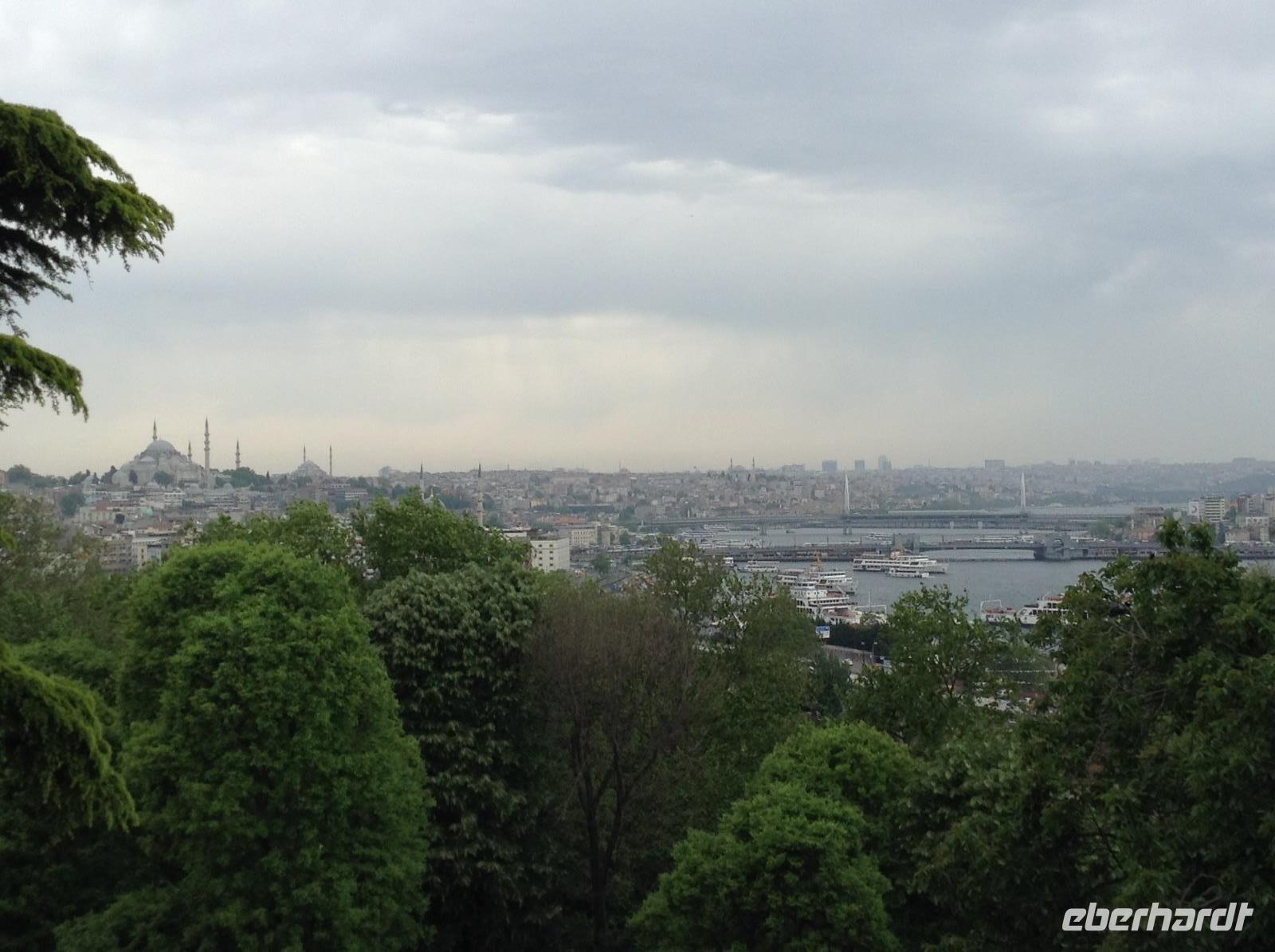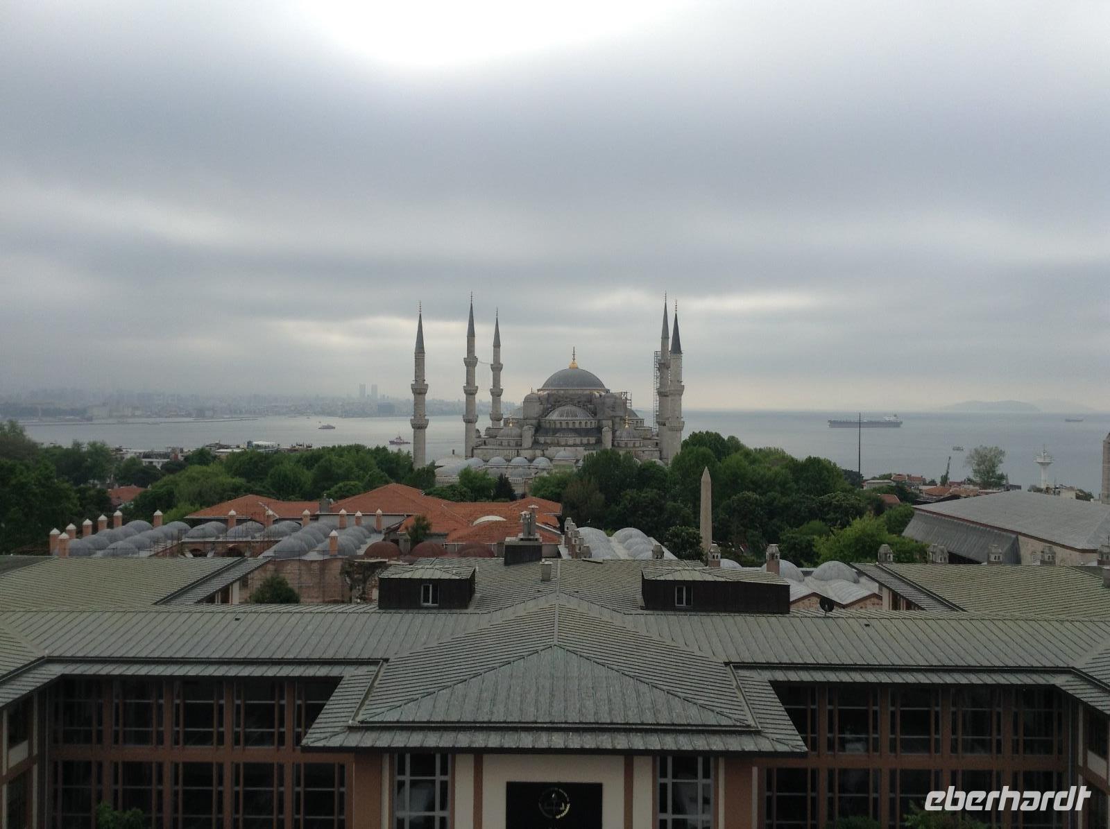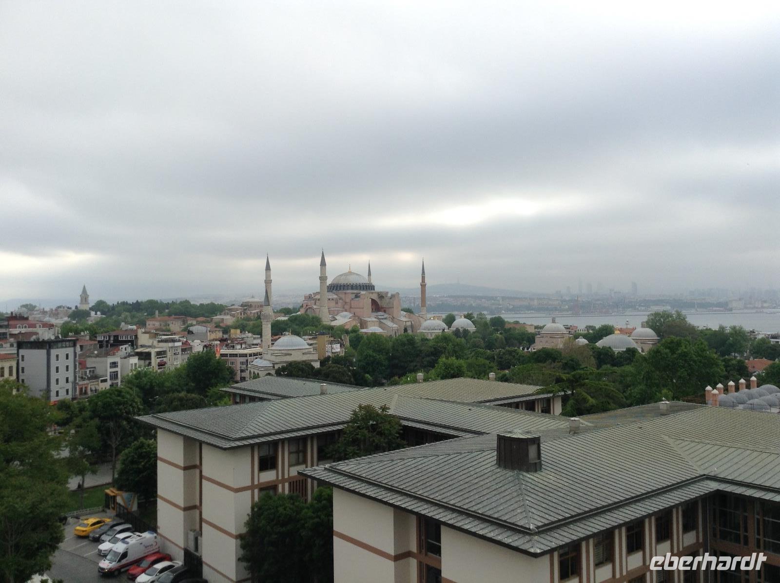 Das erste Frühstücken im Hotel hielt dann das nächste Wow für uns bereit. Das Restaurant lag in der 6. Etage und hatte eine Terasse mit einem fantastischen Ausblick. Wir konnten direkt auf die Hagia Sophia und die blaue Moschee sehen, sahen das Goldene Horn und das Wasser.