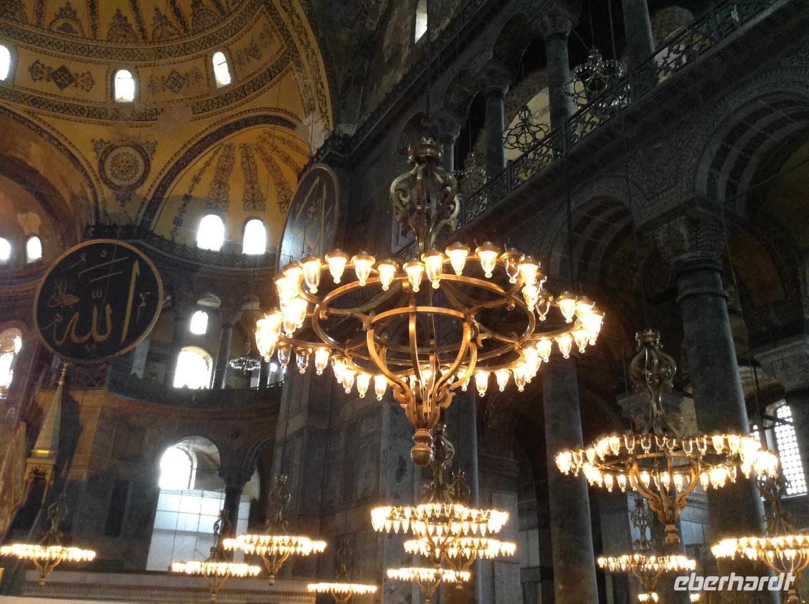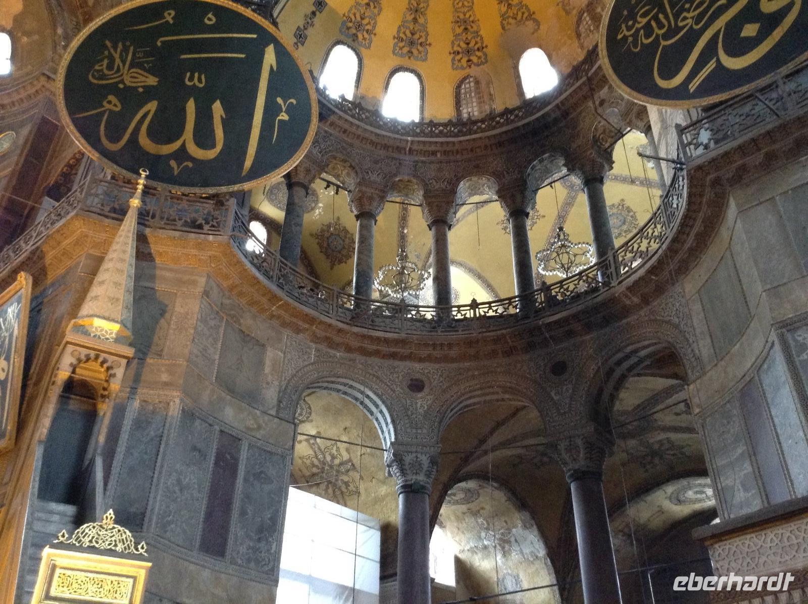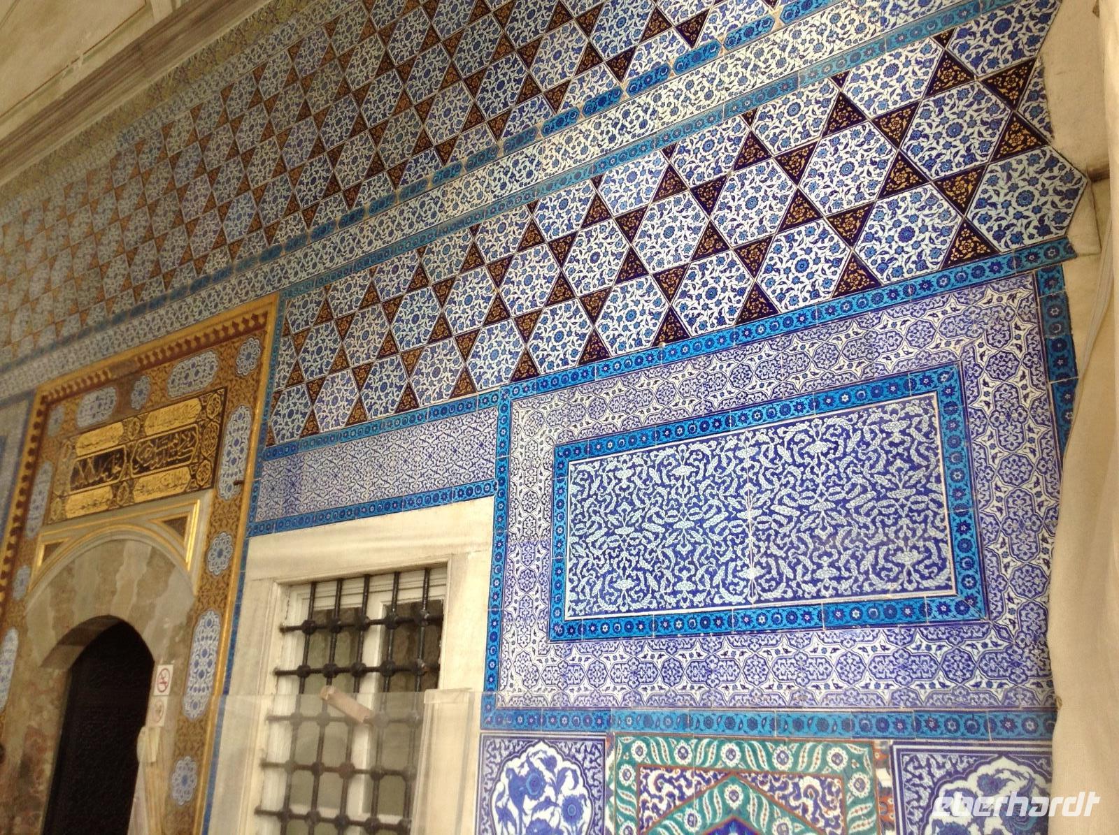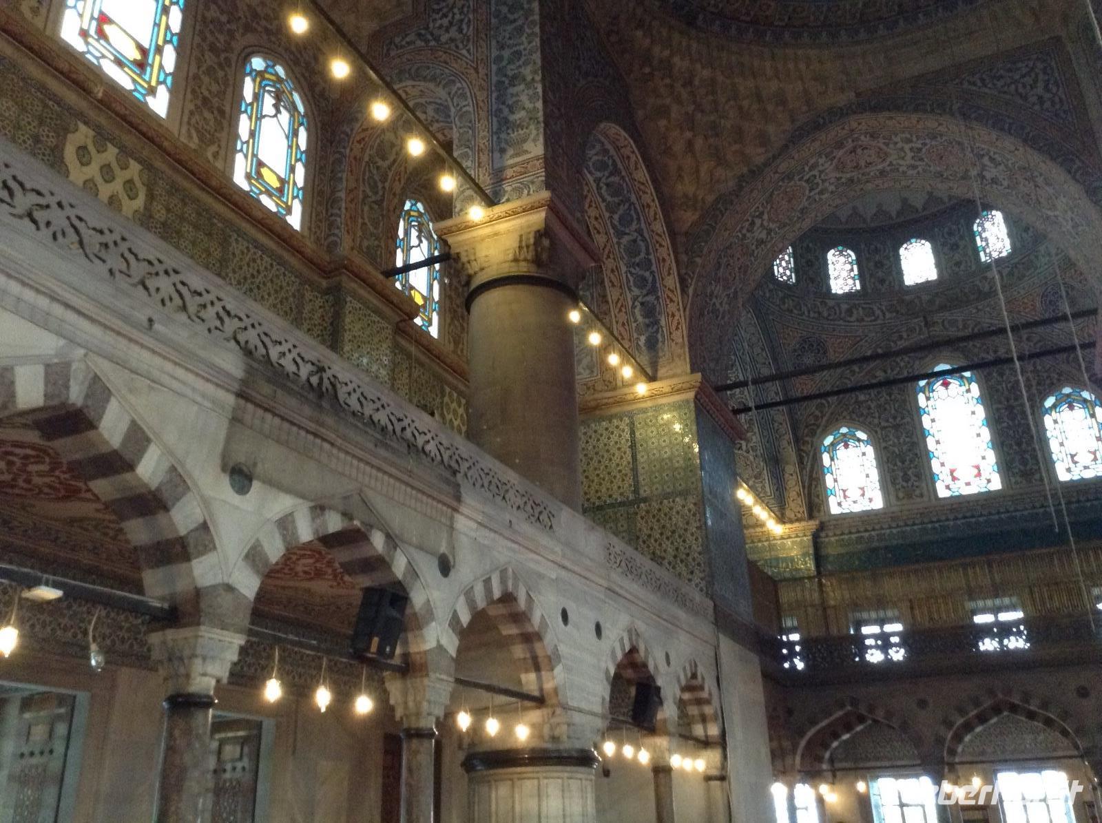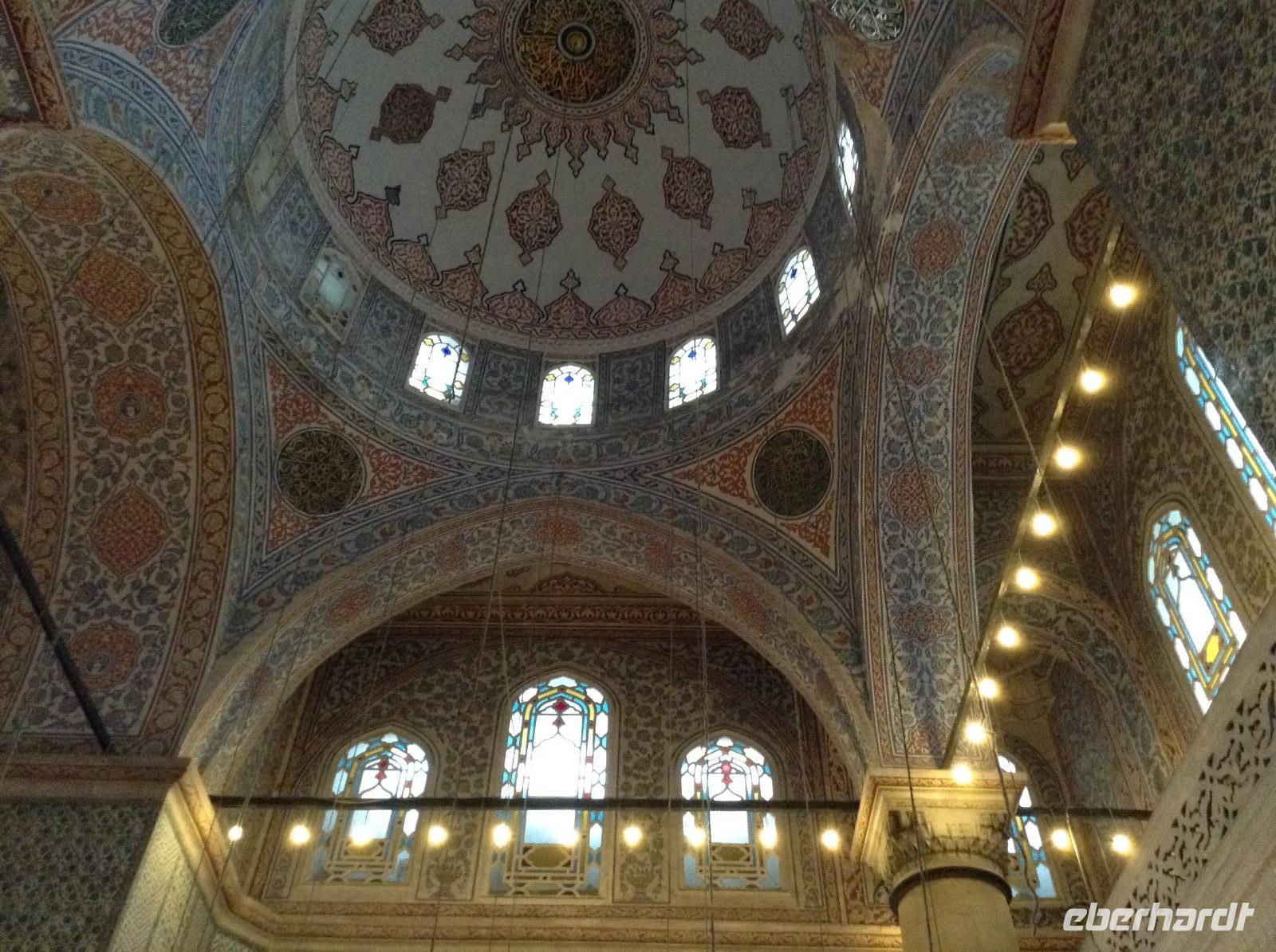 Gut gestärkt ging es dann zu Fuß in die unmittelbare Umgebung des Hotels. Unser erster Besichtigungspunkt war das Hippodrom mit seinen Säulen. Cerdar erklärte uns die Geschichte der Stadt und der ältesten Rennbahn. Von da aus ging es zum wohl bedeutendsten Bauwerk des byzantinischen Reiches, der Hagia Sophia. Wir bestaunten zunächst das einstige Zentrum der Christenheit von außen, ehe es dann, gemeinsam mit Kopfhörern ausgestattet, zur Innenbesichtigung ging. Die einstige Hauptmoschee Istanbuls ist heute Museum. Wir waren sehr beeindruckt, hatten auch etwas Zeit, uns alles in Ruhe und auch im Obergeschoß ansehen zu können. Nach einer kurzen Pause ging es dann zum nächsten Höhepunkt an diesem Tag: dem Topkapi-Palast. Der Palast mit seinen vielen Nebengebäuden wurde einst von den osmanischen Sultanen bewohnt. Er zählt zu den größten Anlagen dieser Art und beherbergt heute eines der umfangreichsten Museen weltweit. Und er bietet einige der schönsten Ausblicke auf Istanbul und das Wasser. Der letzte wichtige Programmpunkt an diesem Tag war dann noch der Besuch in der berühmten Sultan-Ahmet-Moschee, die auch die Blaue Moschee genannt wird. Leider war ein großer Teil der Moschee wegen Restaurationsarbeiten nicht zu sehen, aber wir bekamen einen tollen Eindruck vom Inneren. In den späten Nachmittagstunden endete unsere Führung und wir bummelten gemütlich durch die Altstadtgassen zum Hotel zurück. Wer abends mit zum typisch türkischen Kebab-Essen gehen wollte, der traf sich mit einem Teil der Gruppe am Hotel. Gemeinsam verbrachten wir einen sehr schönen 2. Abend.