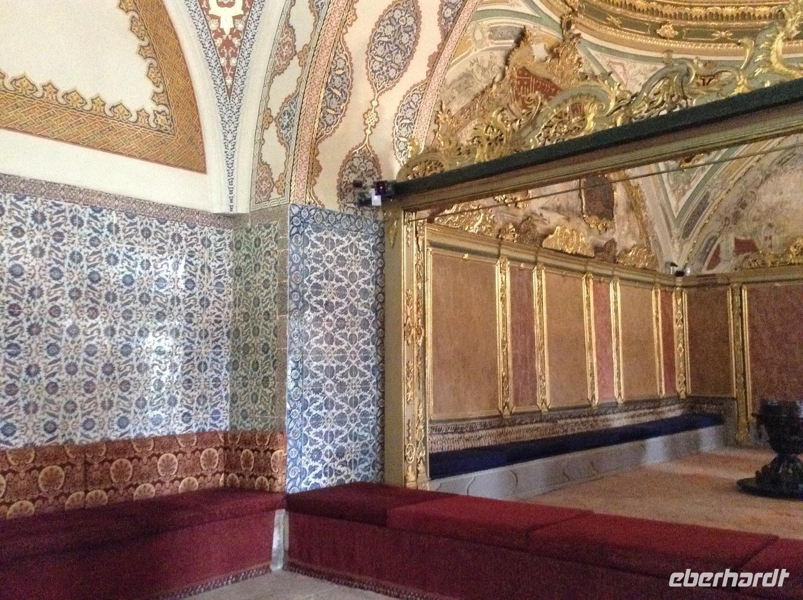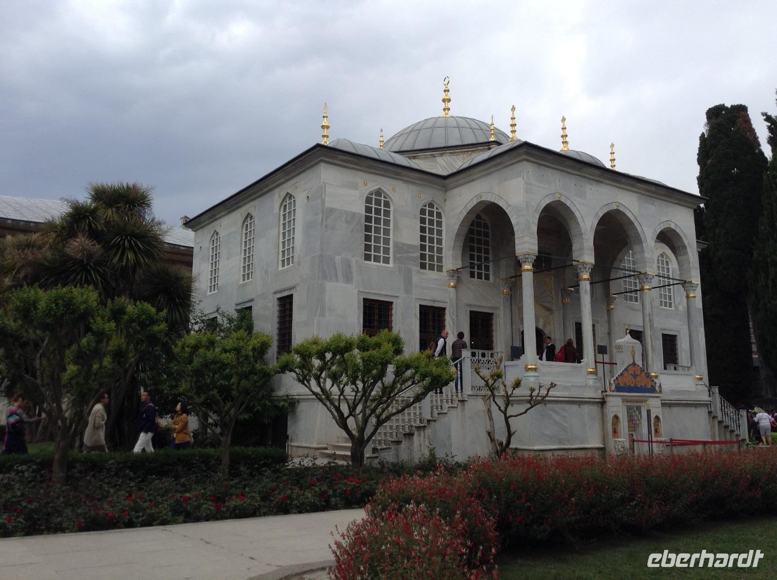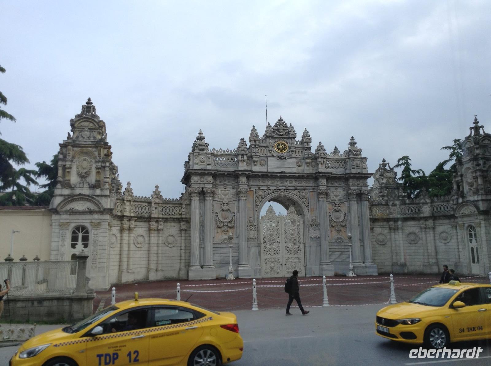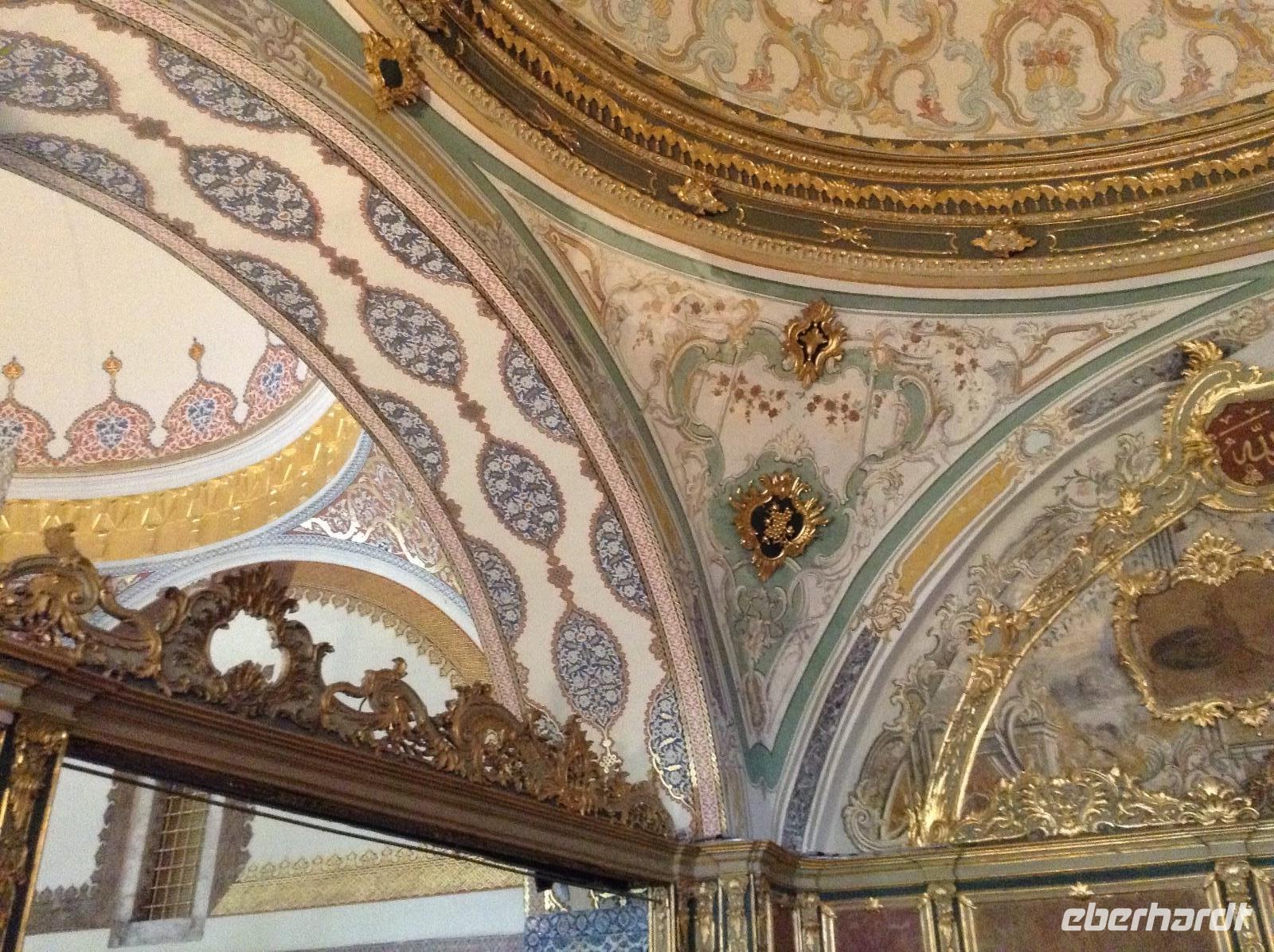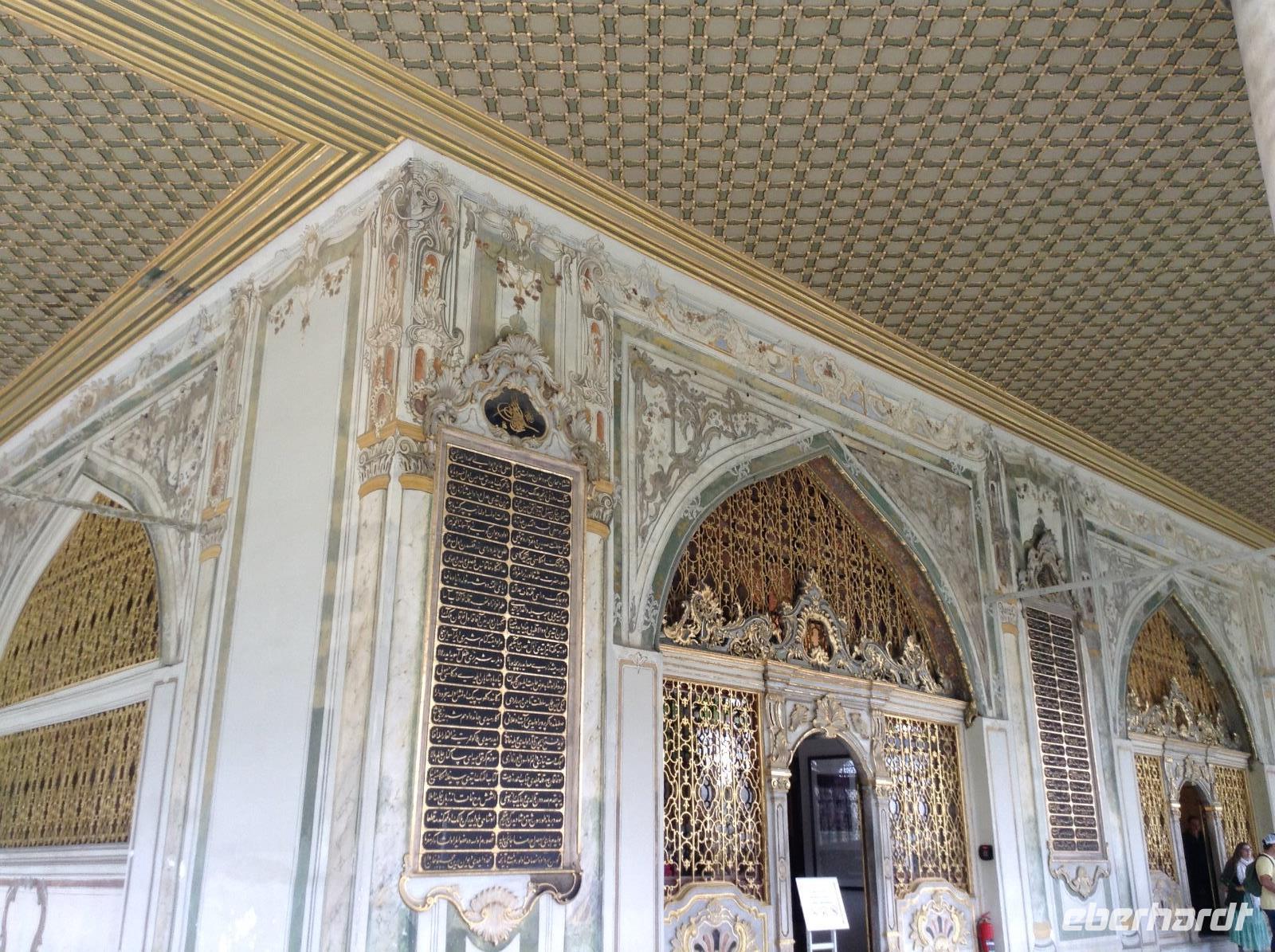 Gut gestärkt ging es dann zu Fuß in die unmittelbare Umgebung des Hotels. Unser erster Besichtigungspunkt war das Hippodrom mit seinen Säulen. Cerdar erklärte uns die Geschichte der Stadt und der ältesten Rennbahn. Von da aus ging es zum wohl bedeutendsten Bauwerk des byzantinischen Reiches, der Hagia Sophia. Wir bestaunten zunächst das einstige Zentrum der Christenheit von außen, ehe es dann, gemeinsam mit Kopfhörern ausgestattet, zur Innenbesichtigung ging. Die einstige Hauptmoschee Istanbuls ist heute Museum. Wir waren sehr beeindruckt, hatten auch etwas Zeit, uns alles in Ruhe und auch im Obergeschoß ansehen zu können. Nach einer kurzen Pause ging es dann zum nächsten Höhepunkt an diesem Tag: dem Topkapi-Palast. Der Palast mit seinen vielen Nebengebäuden wurde einst von den osmanischen Sultanen bewohnt. Er zählt zu den größten Anlagen dieser Art und beherbergt heute eines der umfangreichsten Museen weltweit. Und er bietet einige der schönsten Ausblicke auf Istanbul und das Wasser. Der letzte wichtige Programmpunkt an diesem Tag war dann noch der Besuch in der berühmten Sultan-Ahmet-Moschee, die auch die Blaue Moschee genannt wird. Leider war ein großer Teil der Moschee wegen Restaurationsarbeiten nicht zu sehen, aber wir bekamen einen tollen Eindruck vom Inneren. In den späten Nachmittagstunden endete unsere Führung und wir bummelten gemütlich durch die Altstadtgassen zum Hotel zurück. Wer abends mit zum typisch türkischen Kebab-Essen gehen wollte, der traf sich mit einem Teil der Gruppe am Hotel. Gemeinsam verbrachten wir einen sehr schönen 2. Abend.