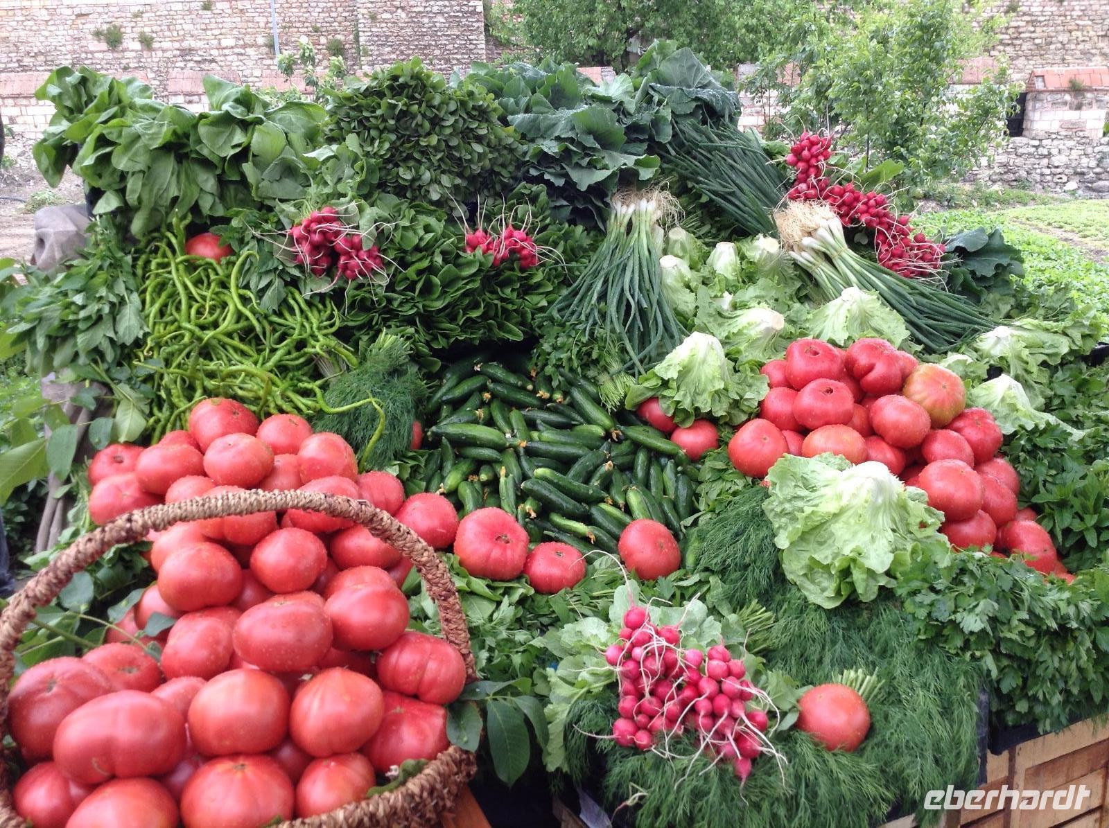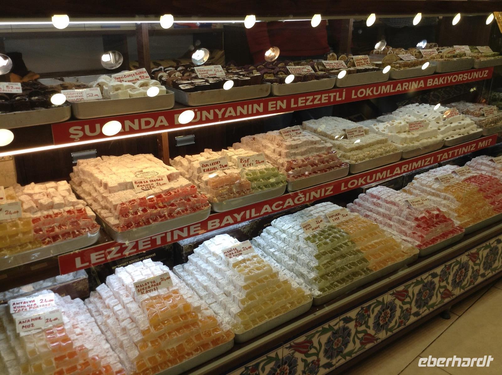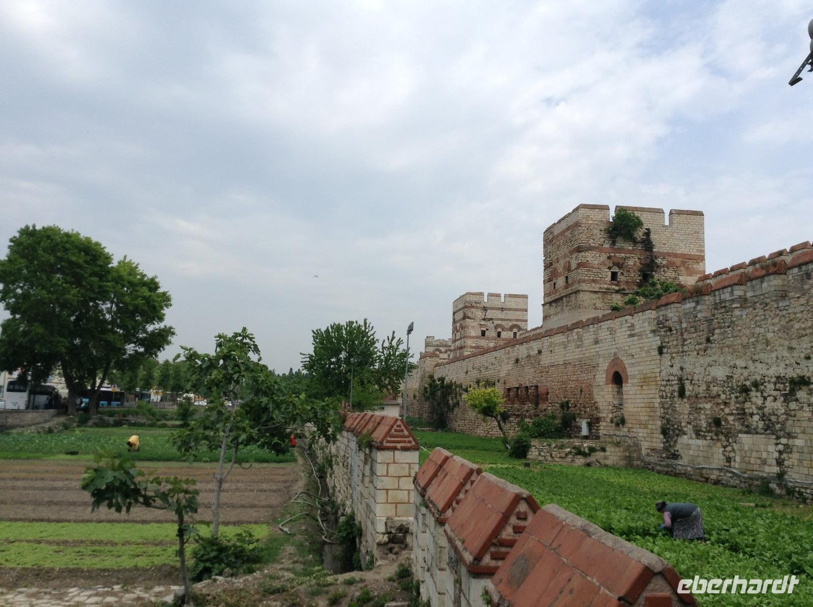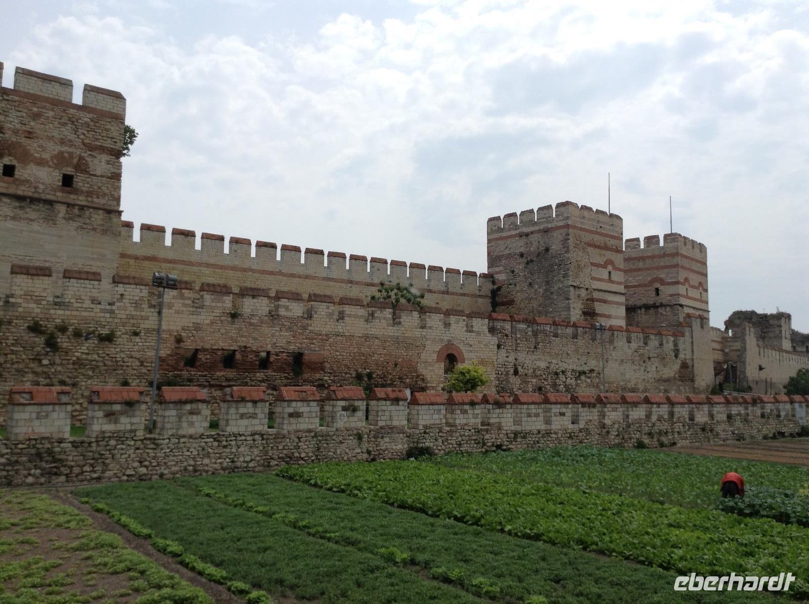 Nach dem guten Frühstück auf der Sonnenterasse holte uns der Bus ab und wir fuhren zunächst zum großen überdachten Basar der Stadt. Wir hatten etwas den Programmablauf für diesen Tag wegen angekündigtem Regen umgestellt. Aber es tröpfelte nur. Gemeinsam betraten wir das Tor zum Basar und staunten, gingen ein Stück gemeinsam hinein, bevor jeder die Gelegenheit hatte, sich individuell zwischen diesen vielen Geschäften umzusehen. Da gab es praktisch alles. Verschiedene Düfte stiegen uns in die Nasen, es roch nach Gewürzen, getrockneten Früchten und Tees, aber auch nach türkischem Honig und Süßigkeiten. Gemeinsam spazierten wir durch die engen Gassen hinaus und weiter bis zum Ägyptischen Markt, wo vor allem die Einheimischen frische Produkte kaufen gehen. Am Ausgang fanden wir dann auch unseren Bus wieder. Zunächst zeigte uns Cerdar ein langes Stück der alten Stadtmauer um Istanbul. Zum Fotostop hielten wir an und sahen, wie zwischen den 3 hintereinander gebauten alten Befestigungen heute überall Gemüsefelder sind. Da wuchsen Tomaten, Lauch, frische Kräuter usw. Dann brachte uns der Bus zur Haltestelle der Marmaray-Bahn und unter dem Bosporus ging es hinüber zur asiatischen Seite der Stadt, nach Üsküdar.