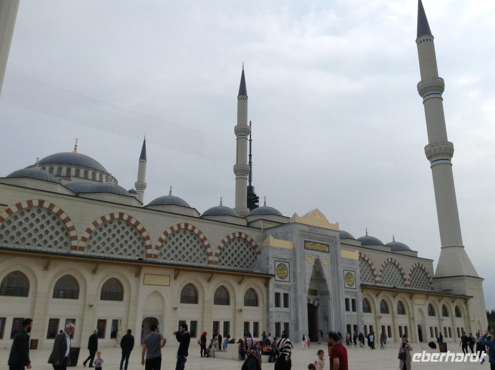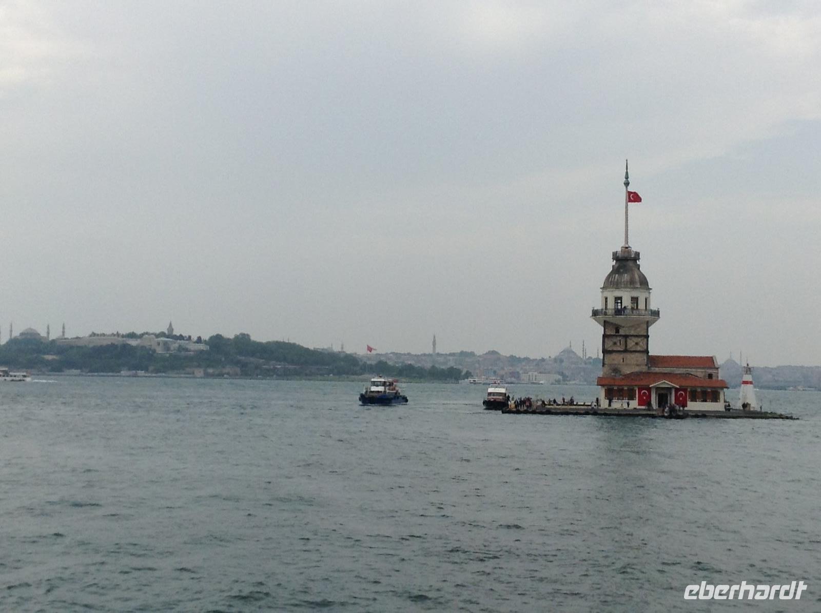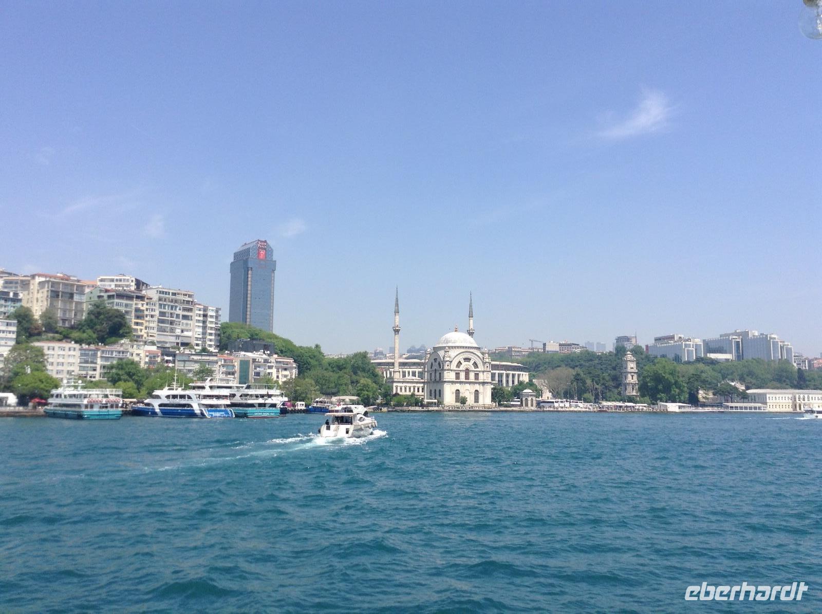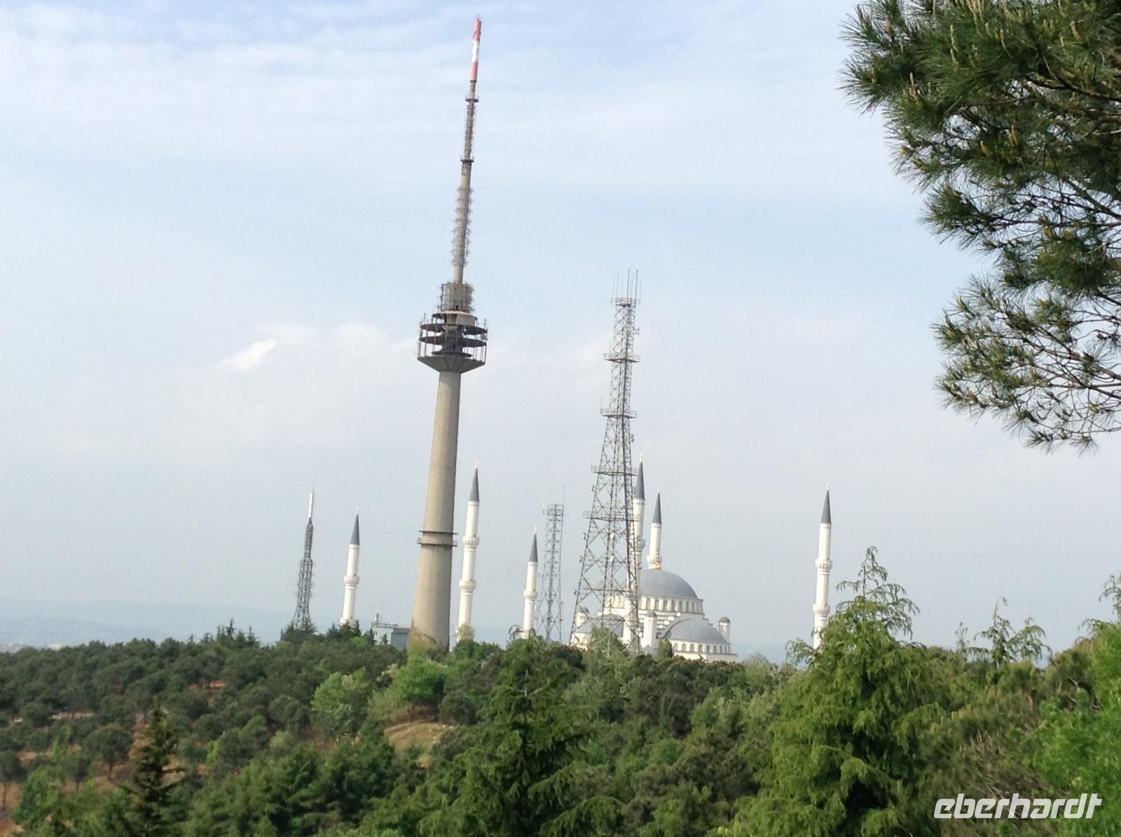 Unser kurzer Bummel führte uns von der U-Bahn-Station an einer hübschen Moschee vorbei zum Basar. Es war Mittagszeit und wir hatten die Möglichkeit auch eine Kleinigkeit zum Essen dort zu bekommen. Inzwischen war der Bus auch auf der asiatischen Seite angekommen und holte uns vor dem Basar ab. Es ging zum Mädchenturm, der schon von Weitem gut im Wasser sichtbar war. Ein kleines Boot brachte uns zur Insel mit dem Turm hinüber. Wir genossen die Sonne und die schöne Aussicht. Vom Turm aus gab es einen tollen Rundumblick. Ein weiterer Höhepunkt an diesem Tag war dann die Fahrt vorbei an ganz modernen neuen Gebäuden und Hochhäusern hinauf zur höchsten Erhebung von Istanbul, dem Camlica, oder auch Tannen-hügel genannt. Cerdar lud die Gruppe auf einen türkischen Tee und einen Sesamkringel ein und war nahmen direkt vor dem Restaurant auf dem Hügel Platz, genossen den Tee und eine fantastische Aussicht. Der ganze Bosporus war zu sehen, die uns inzwischen bekannten Plätze und Moscheen der Stadt und auch der gerade neu im Bau befindliche Turm, der bald die vielen Antennenmasten auf dem Hügel ablösen soll. In der Ferne sahen wir auch die Minarette und die Kuppel der ganz neu gebauten Moschee ganz in der Nähe und unser aller Wunsch war es, sich noch dieses Bauwerk kurz anzusehen. Cerdar und der Busfahrer ermöglichten uns einen kurzen Besuch des gewaltigen Bauwerkes, wir standen da und staunten. Der Heimweg zum Hotel führte uns dann über die Bosporusbrücke zurück. Voller neuer Eindrücke kamen wir abends zurück. Zum Abendessen ging es in ein bekanntes Fischrestaurant, wer wollte. Auch dieser Abend in einer kleinen Bucht war wunderschön, wir genossen das tolle Essen und die Gastfreundschaft.