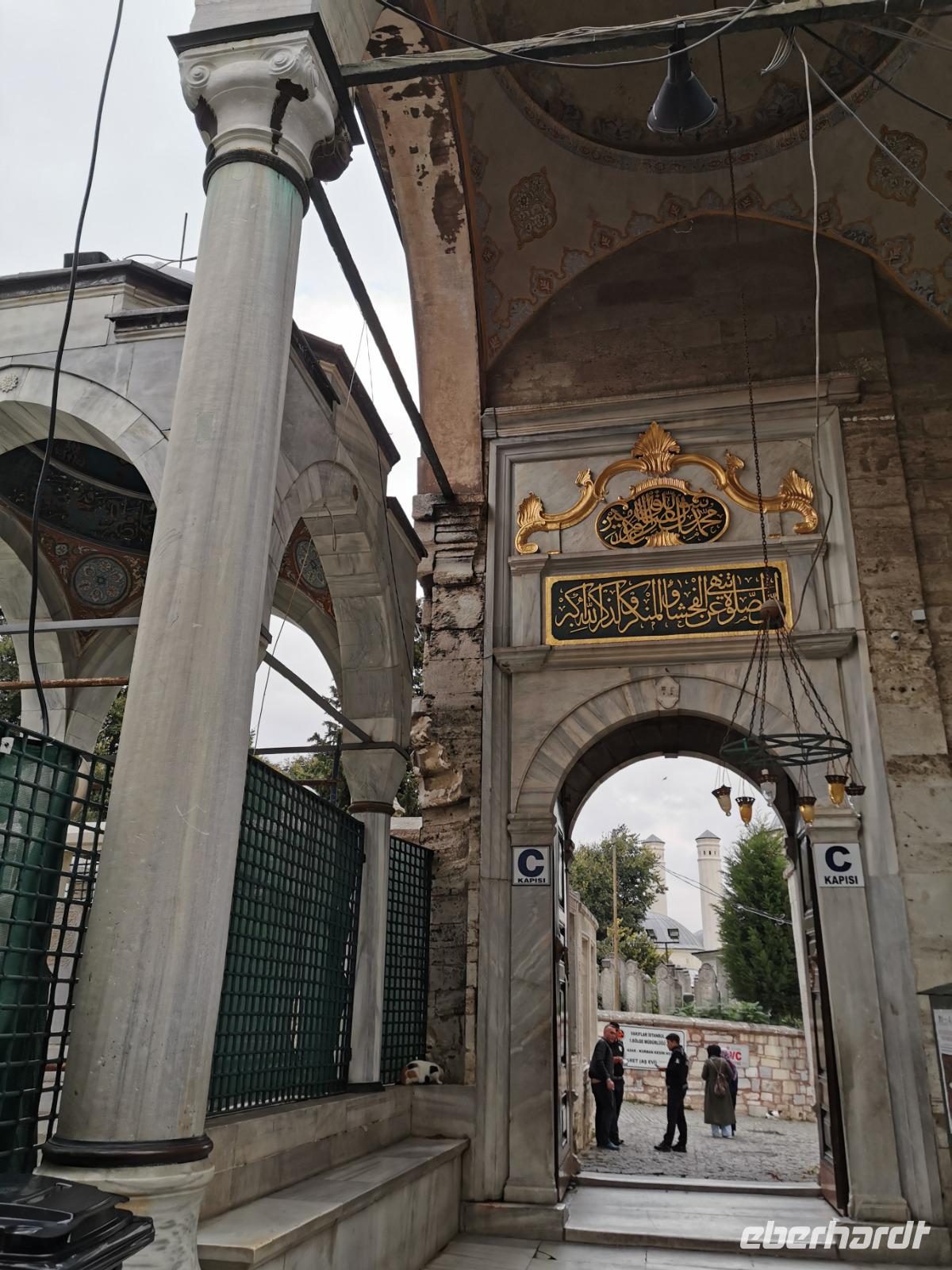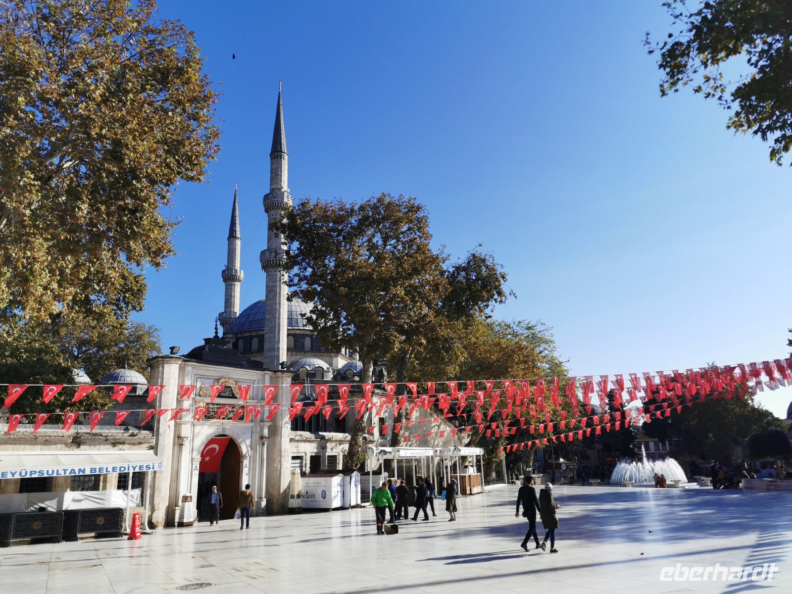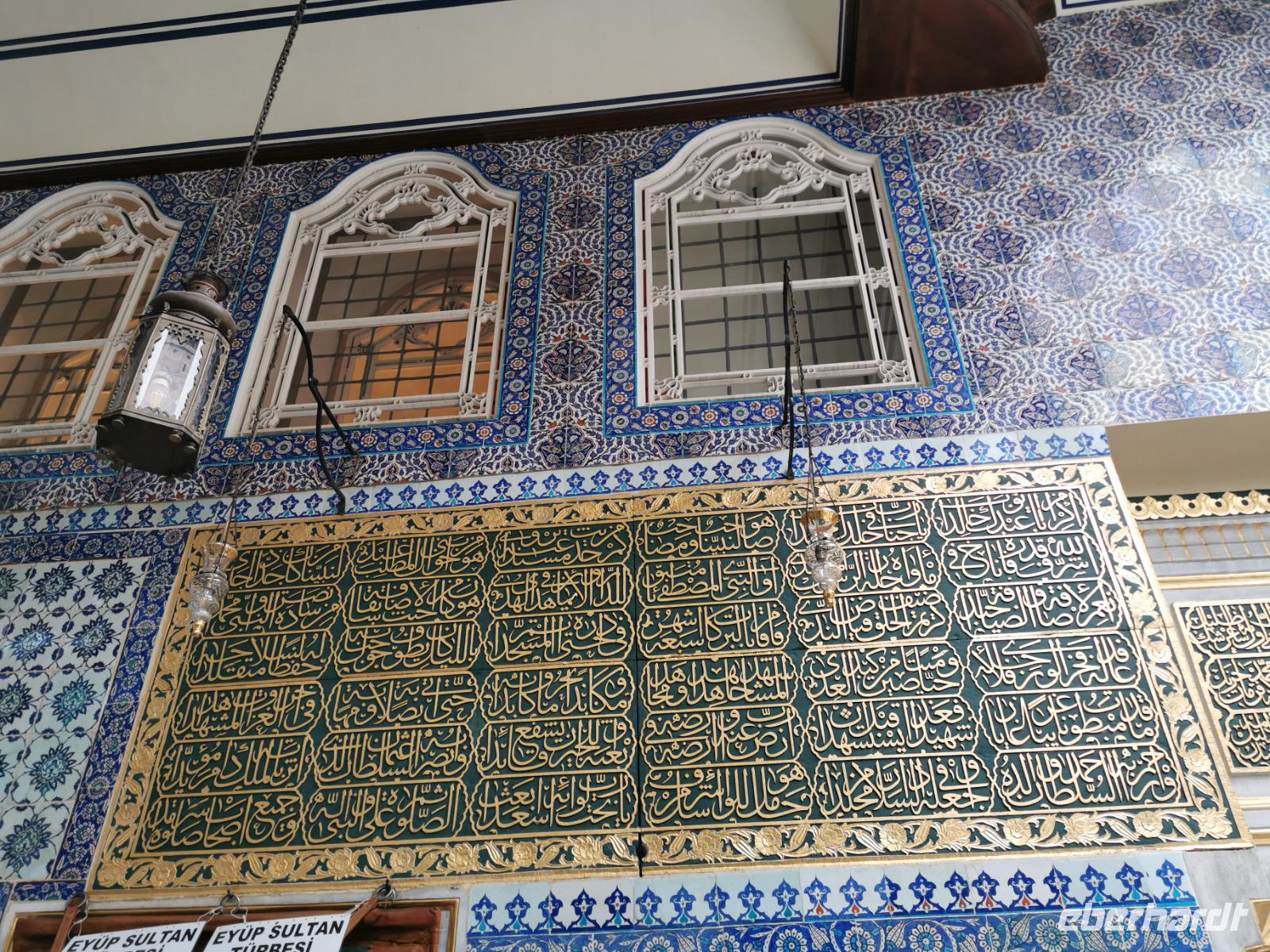 Hier befindet sich eine weitere berühmte Moschee Istanbuls: Die Eyüp Sultan Camii. Um diese Mosche rankt sich eine der vielen Legenden dieser Stadt. Einst soll das Grab Abu Ayyub al-Ansaris (türkischer Name Eyüp), eines Gefährten des Propheten Mohammeds, an der Stelle der heutigen Moschee wieder gefunden worden sein. Er ist bei einer erfolglosen Belagerung der Stadt durch die Muslime im Jahre 674 gefallen und man fand sein Grab erst nach der osmanischen Eroberung im Jahre 1453 wieder. Heute noch kann man die Türbe (das Grab) mitten im Moscheekomplex besichtigen und nachdem wir die Schuhe abgestreift hatten und die Damen die Schals zu Kopftüchern umfunktioniert hatten, besichtigten wir diese schöne mit unzähligen Kacheln geschmückte Anlage. Im Gegensatz zur von vielen Touristen besuchten Blauen Moschee, beten die Gläubigen hier ganz ungestört und so gelang uns ein Einblick in die Gebetszeremonien in einer Moschee.