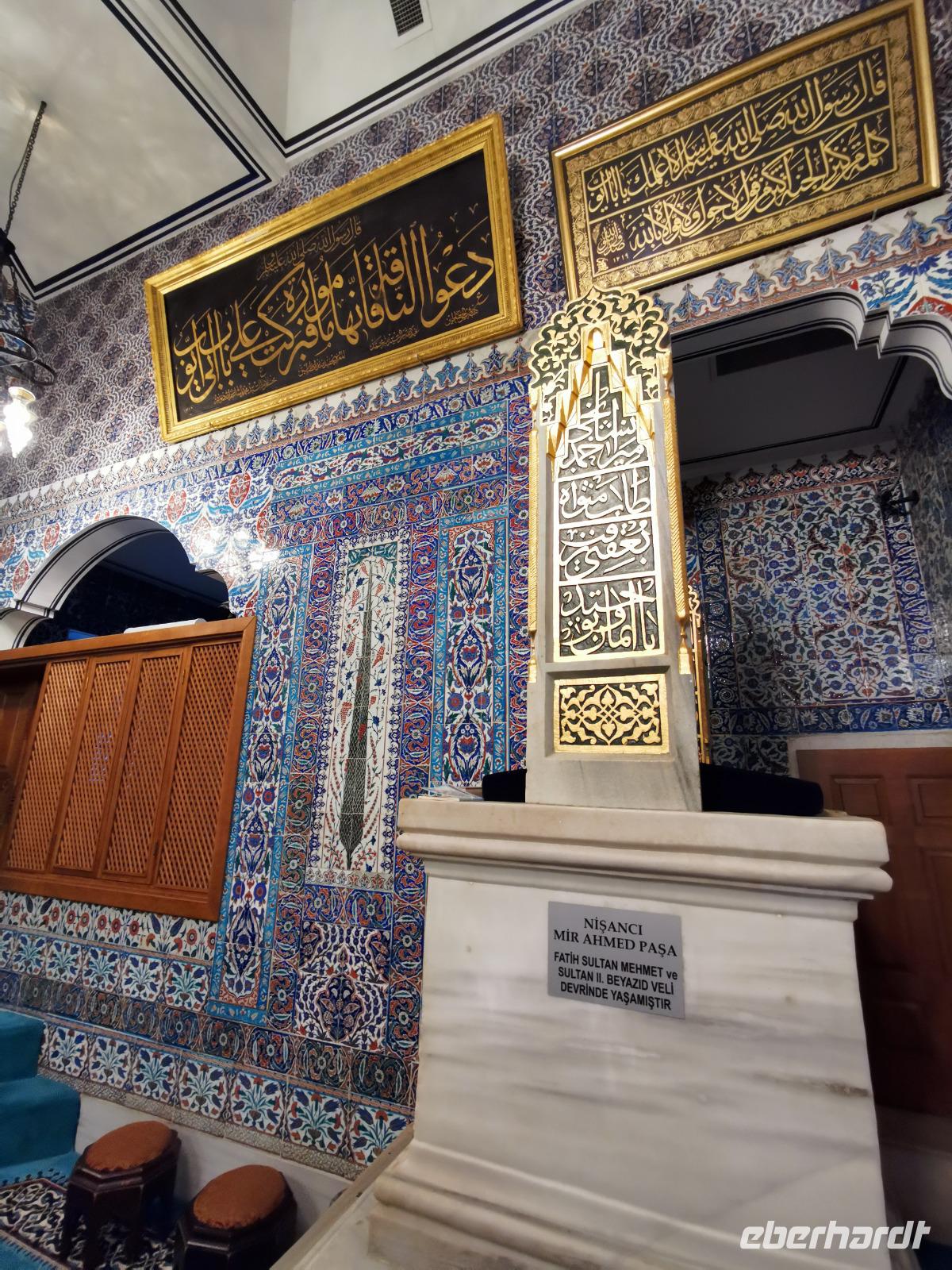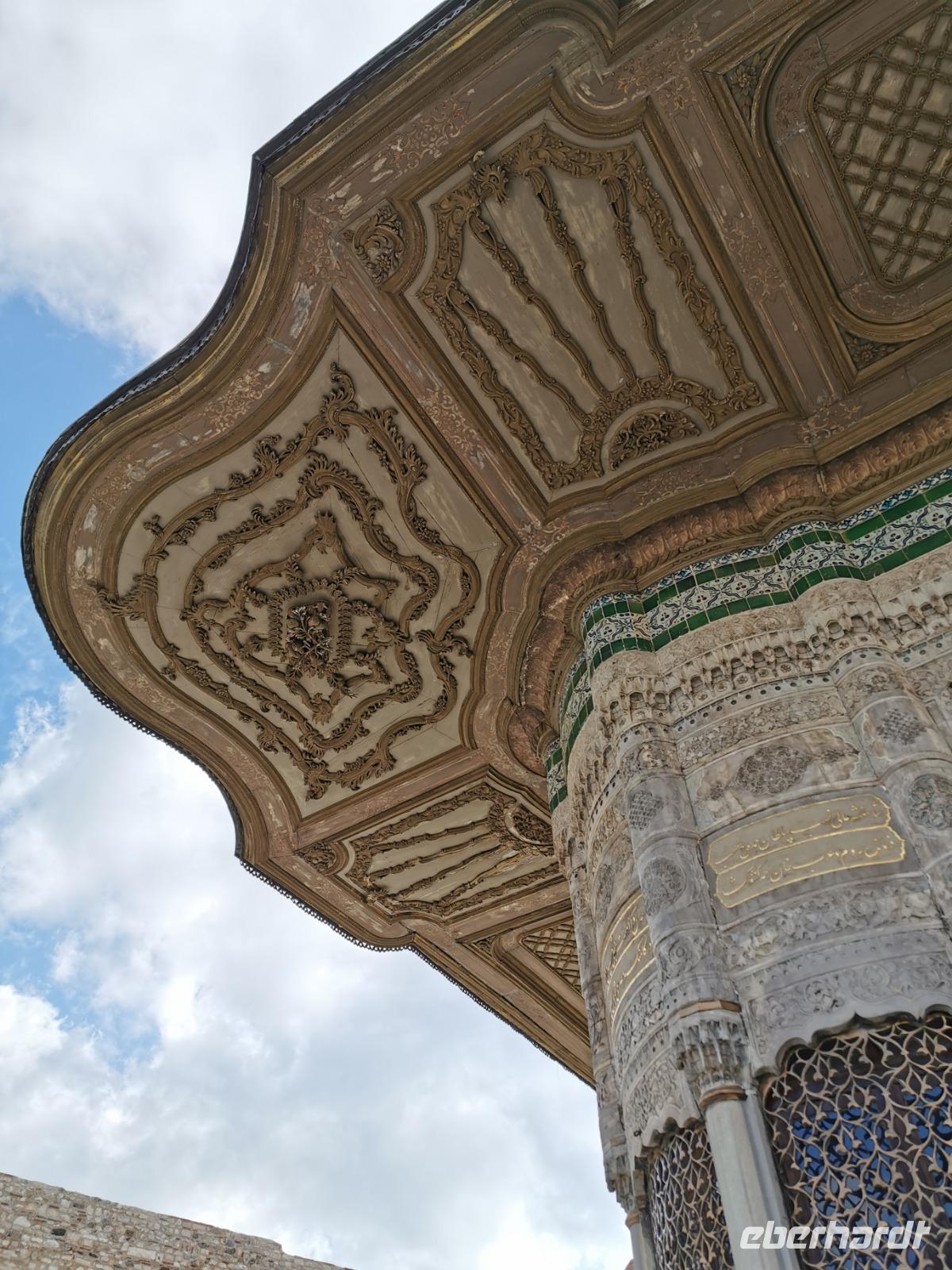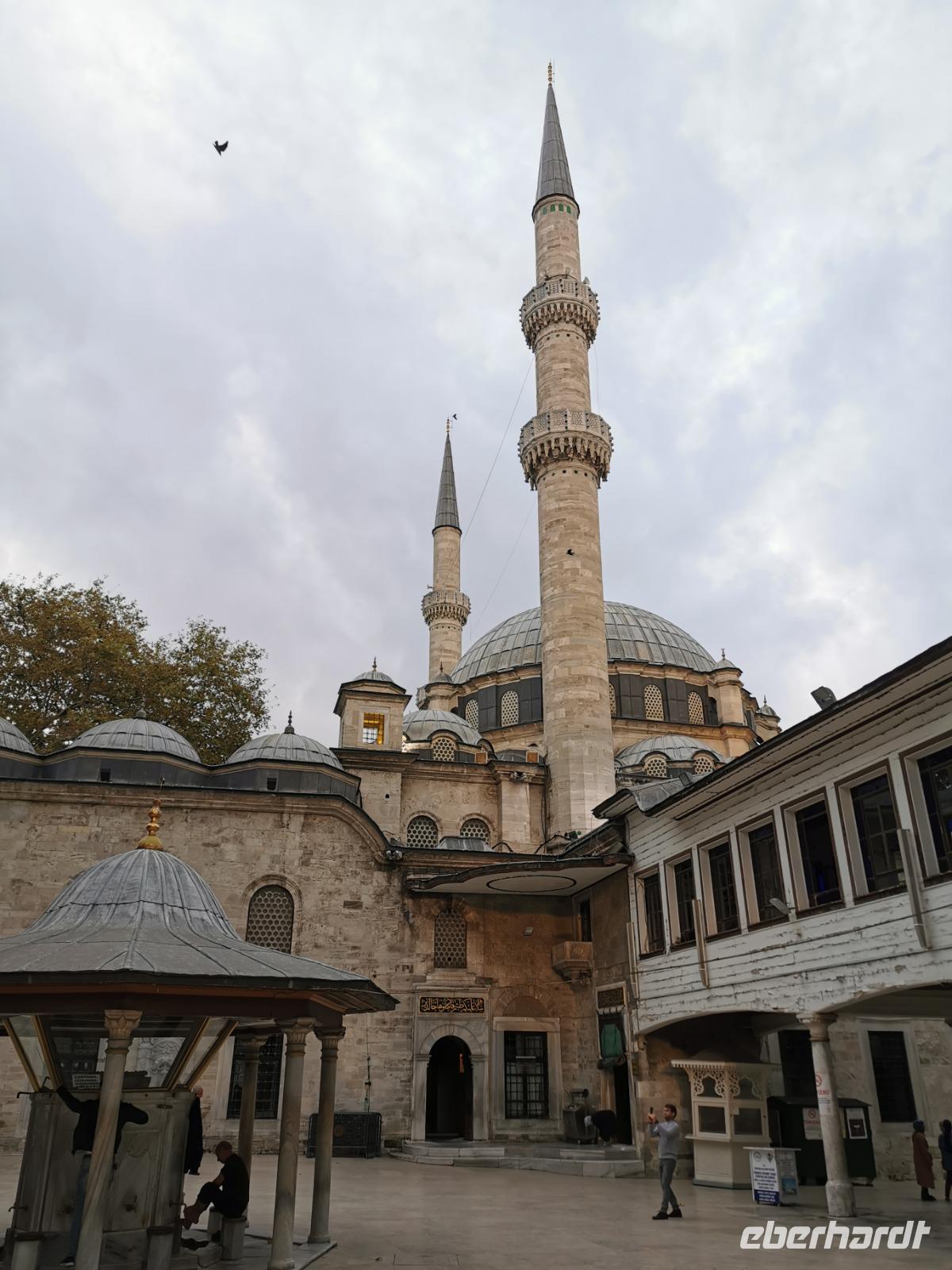 Hier befindet sich eine weitere berühmte Moschee Istanbuls: Die Eyüp Sultan Camii. Um diese Mosche rankt sich eine der vielen Legenden dieser Stadt. Einst soll das Grab Abu Ayyub al-Ansaris (türkischer Name Eyüp), eines Gefährten des Propheten Mohammeds, an der Stelle der heutigen Moschee wieder gefunden worden sein. Er ist bei einer erfolglosen Belagerung der Stadt durch die Muslime im Jahre 674 gefallen und man fand sein Grab erst nach der osmanischen Eroberung im Jahre 1453 wieder. Heute noch kann man die Türbe (das Grab) mitten im Moscheekomplex besichtigen und nachdem wir die Schuhe abgestreift hatten und die Damen die Schals zu Kopftüchern umfunktioniert hatten, besichtigten wir diese schöne mit unzähligen Kacheln geschmückte Anlage. Im Gegensatz zur von vielen Touristen besuchten Blauen Moschee, beten die Gläubigen hier ganz ungestört und so gelang uns ein Einblick in die Gebetszeremonien in einer Moschee.