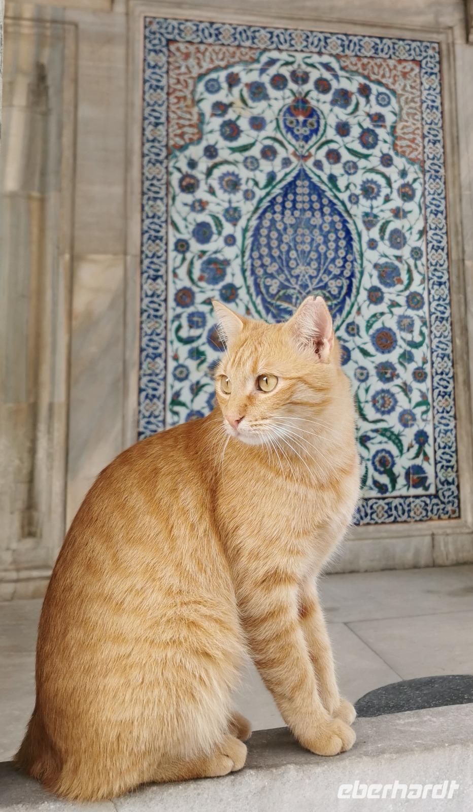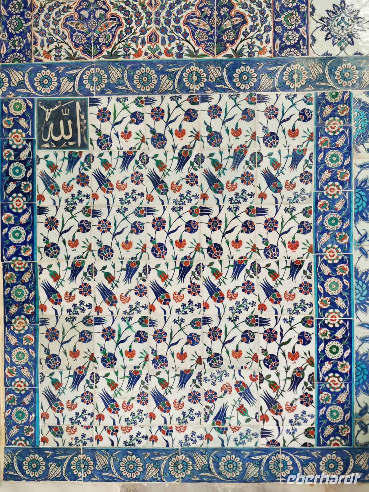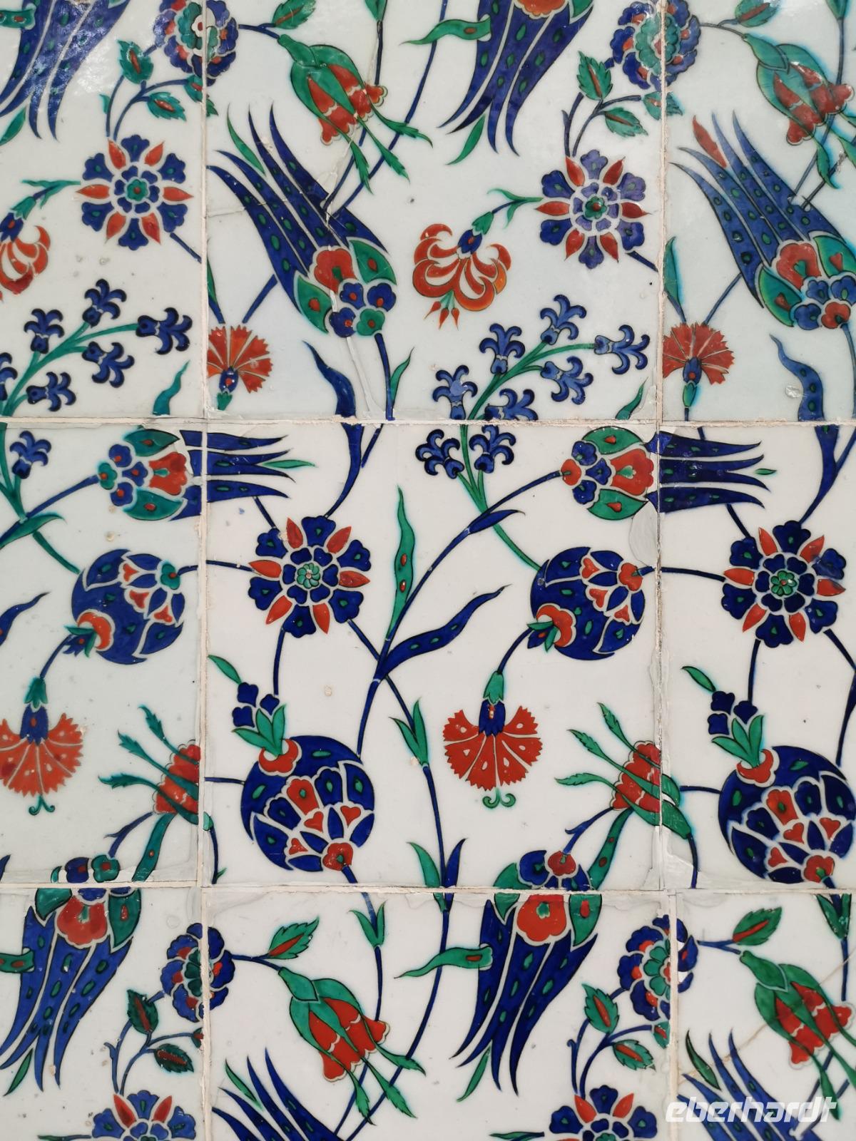 Gleich im Anschluß nahm Serdar uns mit in die Sultan Ahmet Camii, die 1609 von Sultan Ahmet I. in Auftrag gegeben wurde und erst kurz vor seinem Tode 1616 fertig gestellt wurde. Diese wunderschöne Moschee wird wegen ihrer vielen blauen Fliesen im Innenraum auch Blaue Moschee genannt. Diese Fliesen sind der kunsthistorisch bedeutsamste Schatz der Innenräume. Sie stammen aus der Blütezeit der Iznikfayencen. Sie wurden mit traditionellen Pflanzenmotiven bemalt, die Tulpe ist dabei das Hauptmotiv.